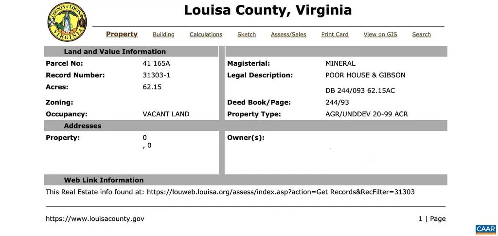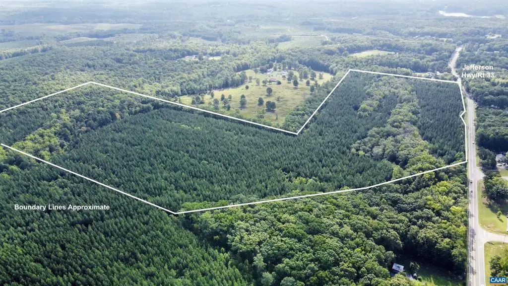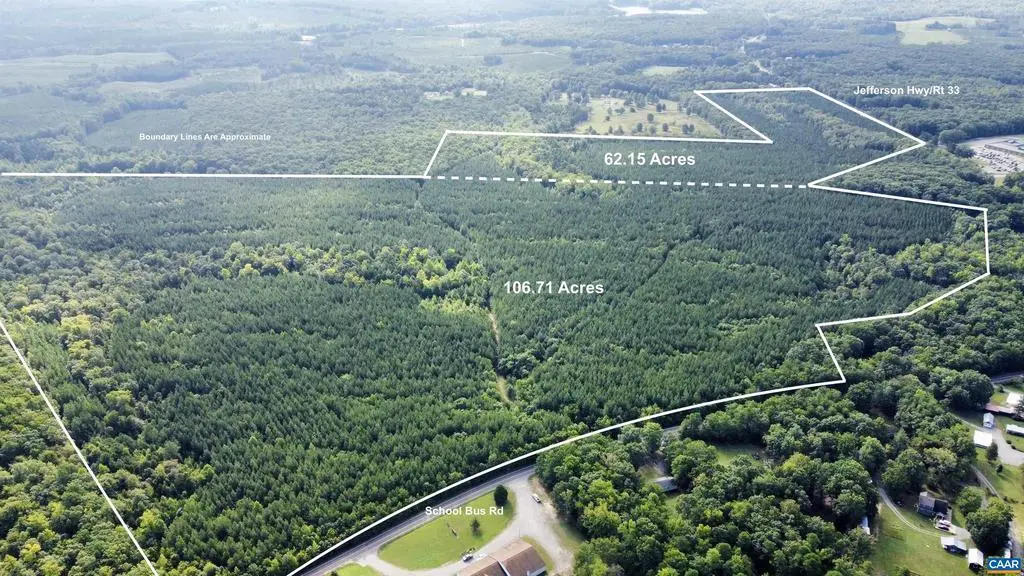 This property offers the potential for a great development opportunity, timberland, small homestead, or even hunting land (currently used for). There is approximately 1,100 feet of road frontage along Jefferson Highway (Route 33), directly across from Thomas Jefferson Elementary School. County water runs along road and potential county sewer on other side of road. This parcel has 7 "by-right" divisions which allows for the property to be split into 7 lots. 16 year old loblolly pine ready to be thinned or clear cut in a few years. The tract is in a great location less than 5 minutes to the town of Louisa and 15 minutes to I-64. Small stream runs through property but NOT located in flood plain. GIS DOES NOT PROPERLY SHOW PROPERTY. Plat was never recorded.