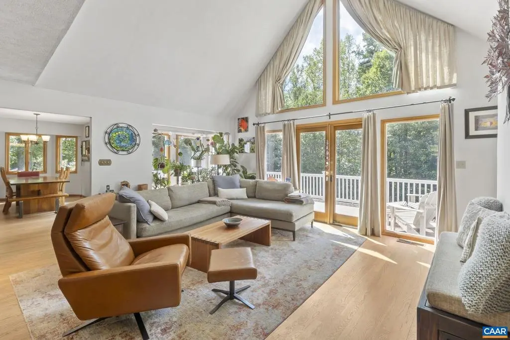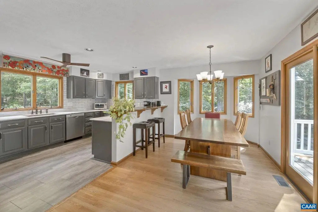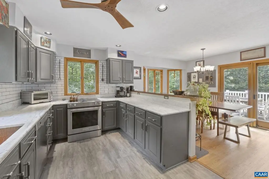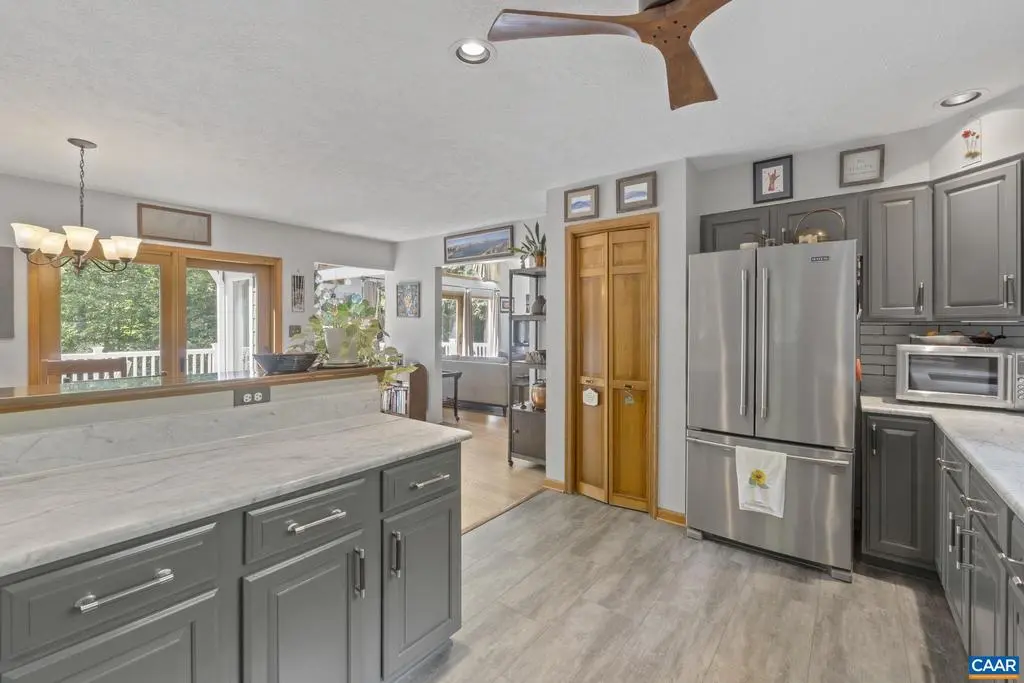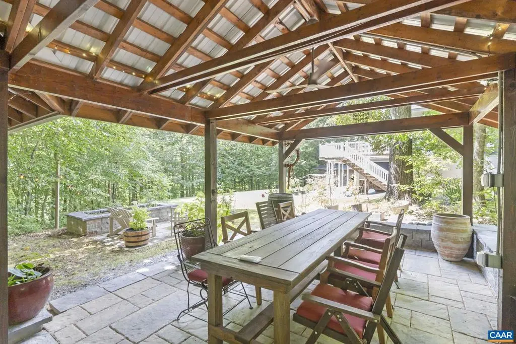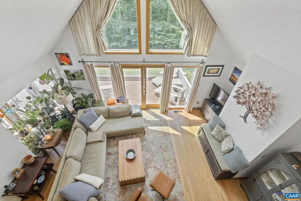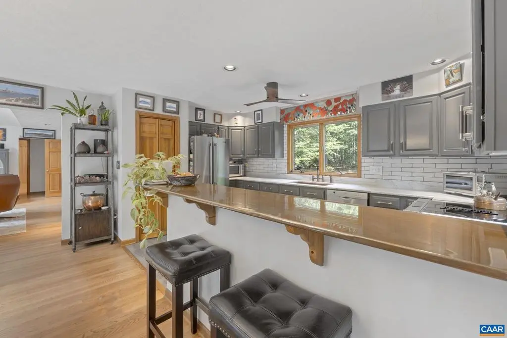 Soaked in natural light, this contemporary home invites the outdoors in with vaulted ceilings and walls of windows. The open main level blends comfort and style, with flowing living and dining spaces and a sleek kitchen made for gatherings. 3 beds & 3 baths, plus a flexible terrace-level bonus room with private entry. The large fenced area with two-stall barn is perfect for animals, gardening, or creative projects. Relax or entertain outdoors on the expansive deck, covered patio, or under the charming metal-roof pergola. Beautifully maintained with thoughtful updates throughout. See the updates and highlights sheet for the full list of improvements.,Marble Counter,Painted Cabinets,Wood Cabinets,Fireplace in Family Room