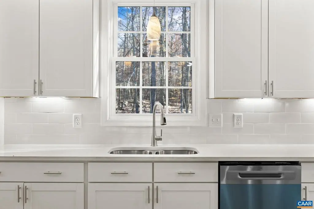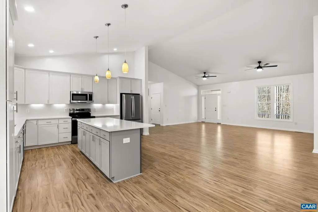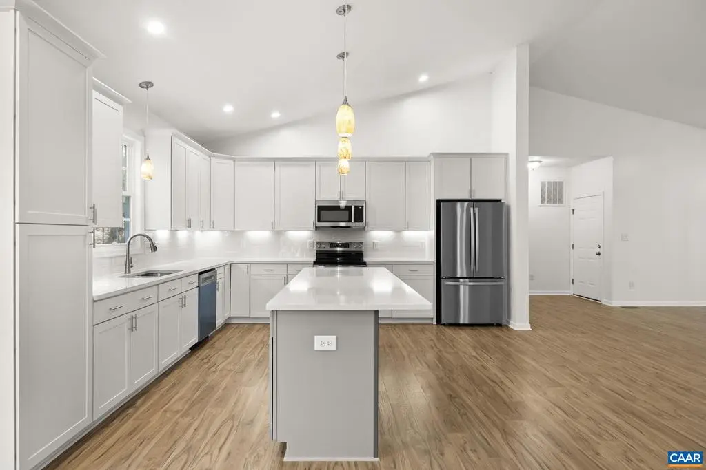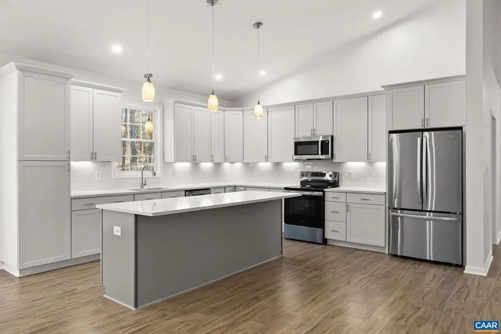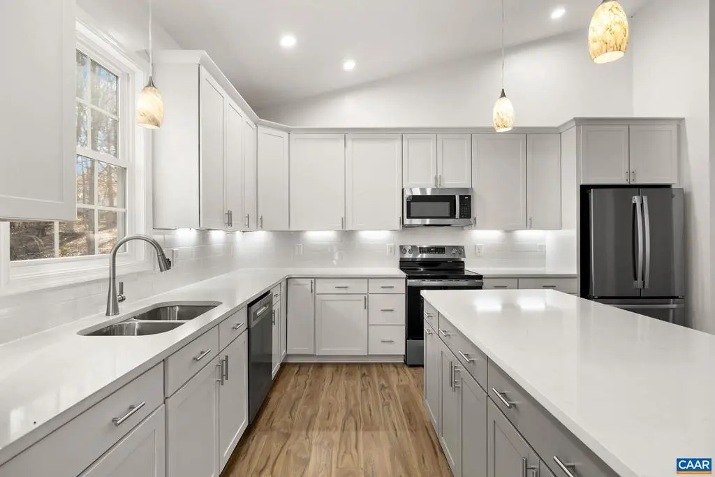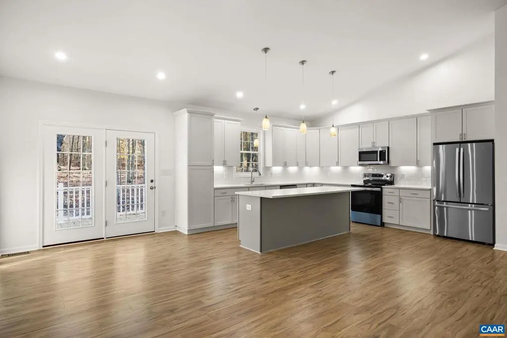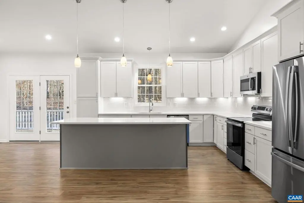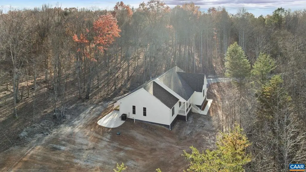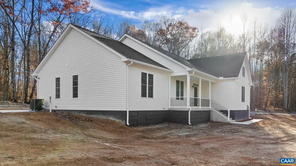 Move in ready, just in time for the holidays! Spacious custom built home with all the extras. This beauty is nestled on a private and wooded 4.1 acre lot. Offering 3 bedrooms, 2 full baths, and boasting 2,016 sqft all on one level! The open floorplan with cathedral ceilings welcomes you with tons of natural light and custom finishes throughout! Chefs kitchen with an huge 8ft island, all stainless appliances, tile backsplash, under cabinet lighting, granite counters and 42" soft close cabinetry. Recessed lighting throughout, and multiple ceiling fans. Builder also includes the refrigerator and washer/dryer. Gorgeous hickory colored LVP flooring throughout. Split bedroom design with the primary bedroom featuring and attached en-suite with a separate soaking tub and tiled shower. Generous walk in closet. Large laundry/mudroom with cabinetry and a custom butcher block counter, conveniently located next to the attached 2 car garage. Poured front country porch, a 10x24 back deck and expansive poured patio to relax and enjoy the serene setting. Classy vertical siding and oversized gutters. Located just 5 miles from I64 for a quick trip to Zion Crossroads, Charlottesville, or Short Pump. Don't miss out on this one!,Granite Counter,White Cabinets