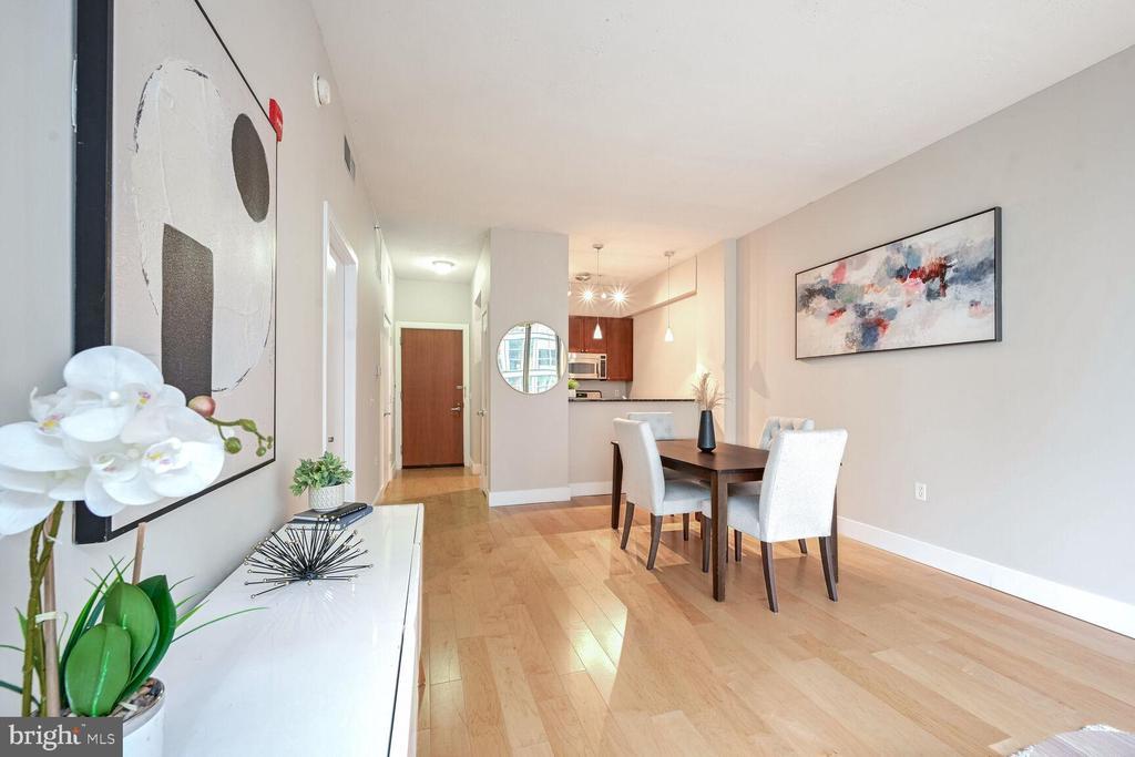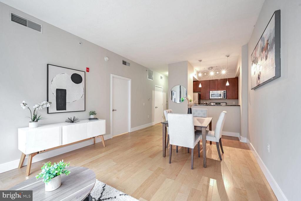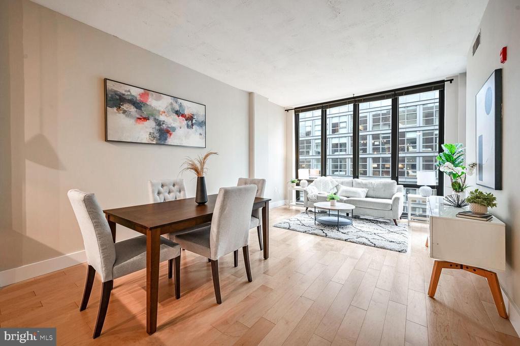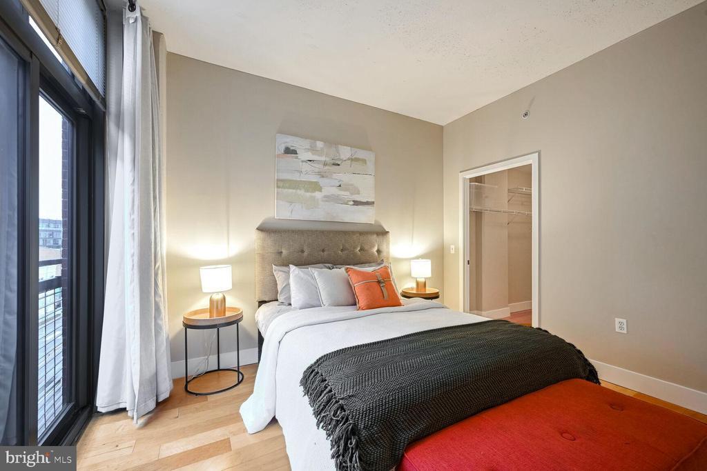 The Largest One Bedroom on the market at The Rhapsody - Unit 402. This sleek 1-bedroom, 1-bathroom condo is designed for those who crave style, comfort, and convenience. Walls of windows fill the space with natural light, accentuating the brand new warm wood floors and airy ceilings that create a sense of openness throughout. The kitchen is both functional and fashionable, featuring granite counters, a versatile breakfast bar, stainless steel appliances, a gas range, and generous storage options—perfect for everyday cooking or entertaining guests. A separate space for a dining area leads into the east-facing windows living area, for great morning light. The spacious bedroom offers a peaceful retreat with an oversized walk-in closet and direct access to the en-suite bath, which also connects to the main living space for guest access. Parking is a breeze with one secured garage spot included. The building’s amenities are just as impressive, featuring a fitness room, package room, bike storage, concierge, and professional on-site management. For those who love outdoor living, the expansive rooftop terrace offers a grilling station and stunning panoramic views and breathtaking views of the D.C skyline.—an ideal setting for relaxing or hosting friends. Located directly across from Whole Foods and steps to the U Street Metro (Green/Yellow Line), this home puts you in the center of it all. From the dynamic energy of the U Street Corridor to the restaurants, nightlife, and shops of Shaw, every convenience is within reach. Whether you’re exploring around town, enjoying a local café, or taking in the city’s vibrant culture, this is your perfect home base for an extraordinary lifestyle.