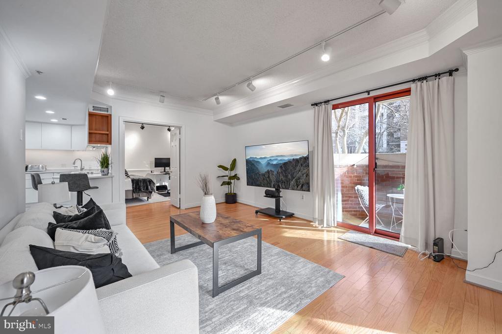 Don’t miss this updated 2-bedroom, 1-bathroom condo in the heart of DC’s West End. This contemporary residence combines style and convenience, with secure garage parking, storage, and private outdoor spaces. Rich hardwood floors, crown molding, and generous ceiling height create an inviting ambiance. The sleek kitchen is equipped with high-end appliances, upgraded countertops, and a breakfast bar, seamlessly integrating with the open layout. Floor-to-ceiling sliding glass doors flood the living space with natural light and open to a private wraparound patio—perfect for entertaining or unwinding. The bathroom offers a tub-shower combination and heated tile flooring for added comfort, while an in-unit washer/dryer adds everyday ease. An additional patio off the second bedroom provides another retreat. Residents enjoy concierge service, meeting spaces, and a large rooftop terrace with wonderful city views. Just moments from Whole Foods, Trader Joe’s, parks, and the West End Community Center, this prime location offers easy access to Georgetown, Dupont Circle, Foggy Bottom, Metro stations, top restaurants, and premier shopping.