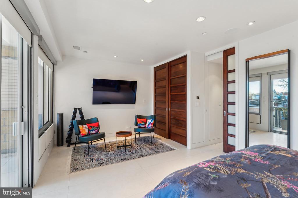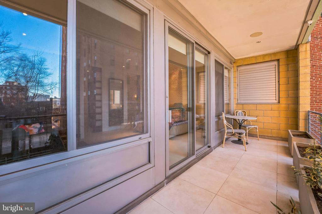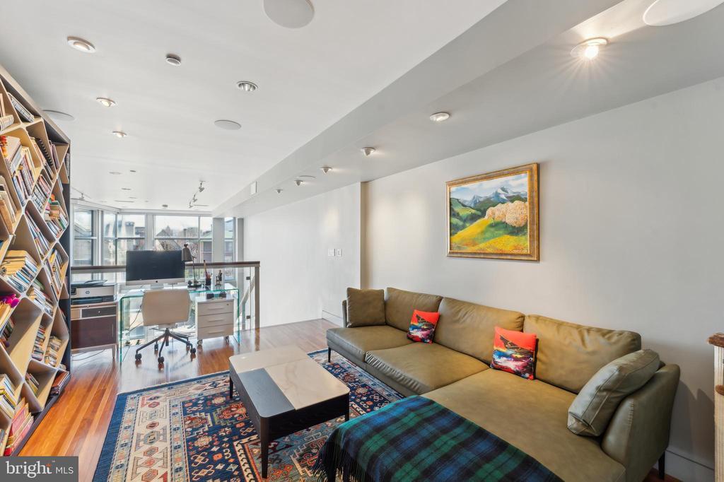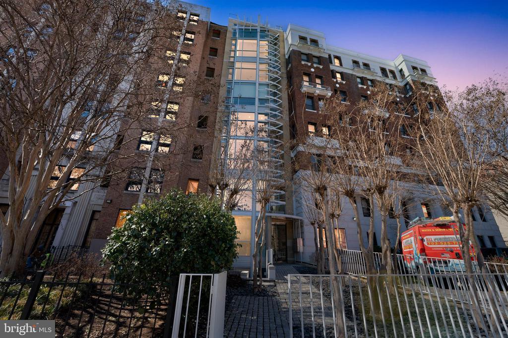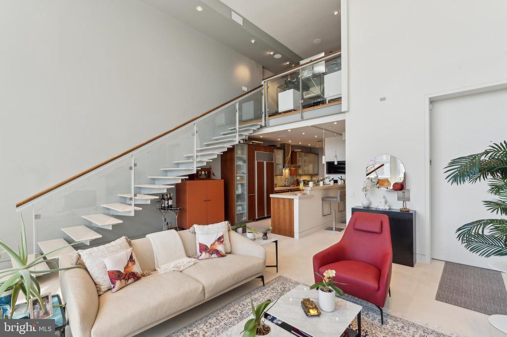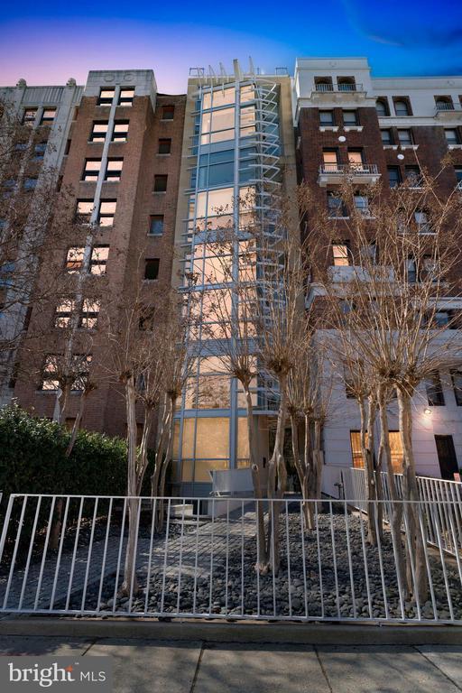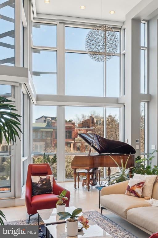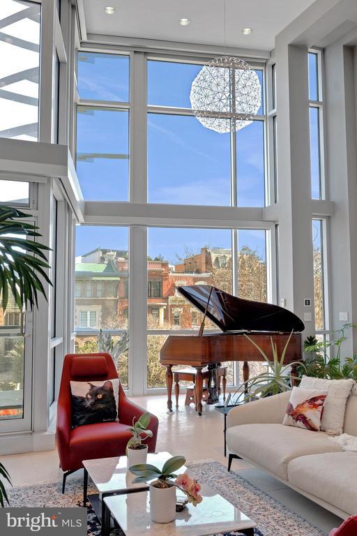 Step off the elevator and directly into your new home in the heart of Dupont/Logan . You're immediately greeted by a bright, open floor plan with panoramic views of a classic stone church and the iconic 16th Street—your direct path to the White House. Soaring 20-foot plus ceilings and expansive windows, shaded by motorized blinds, set the stage. Sip your morning coffee on radiant heated limestone floors as sunlight pours in. Ascend the floating limestone and steel staircase to your den and primary suite. The den offers a perfect space to relax and can control the whole home entertainment system with whole home audio, televisions, and phones. Simply add a desk and create an inspiring atmospheric home office, framed by striking views. In the primary suite, enjoy an upgraded custom walk-in closet, a private balcony, and a spa-like bathroom featuring a jetted tub, a steam shower, and more of that luxurious heated limestone underfoot. Back downstairs, cook with a view in the gourmet kitchen—complete with a Miele gas range, Miele dishwasher, Wolfe double ovens, and a reverse osmosis water filtration system with its own sink. Through a pair of sliding double doors at the end of the kitchen there is a sleek space for formal dining. Finally, the second bedroom is far more than a second thought. With a spacious room with limestone floors, and its own private balcony and full bathroom anyone here will be living in luxury too. All of this is only steps away from a Whole Foods and a SAFEWAY, over a dozen highly rated restaurants and bars, and a new renovated park and community space.