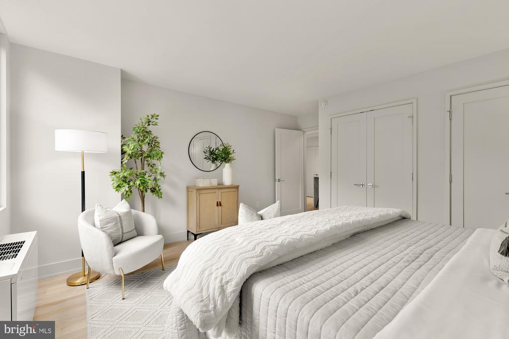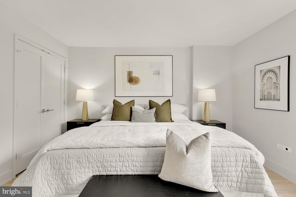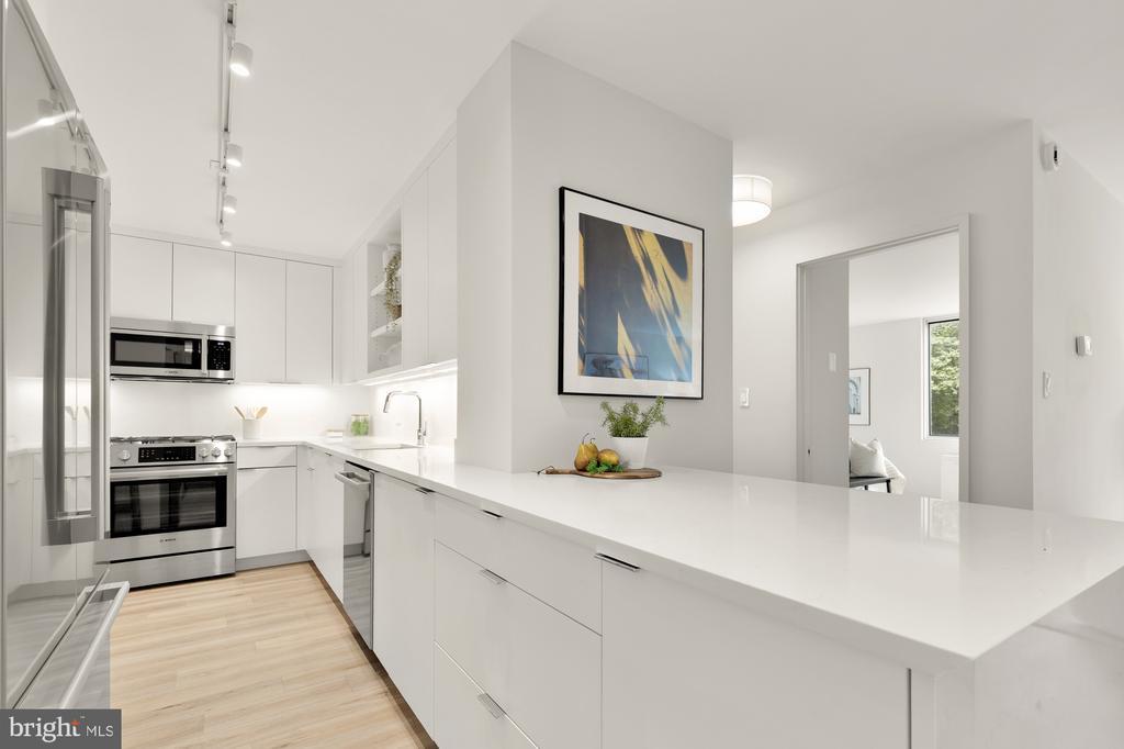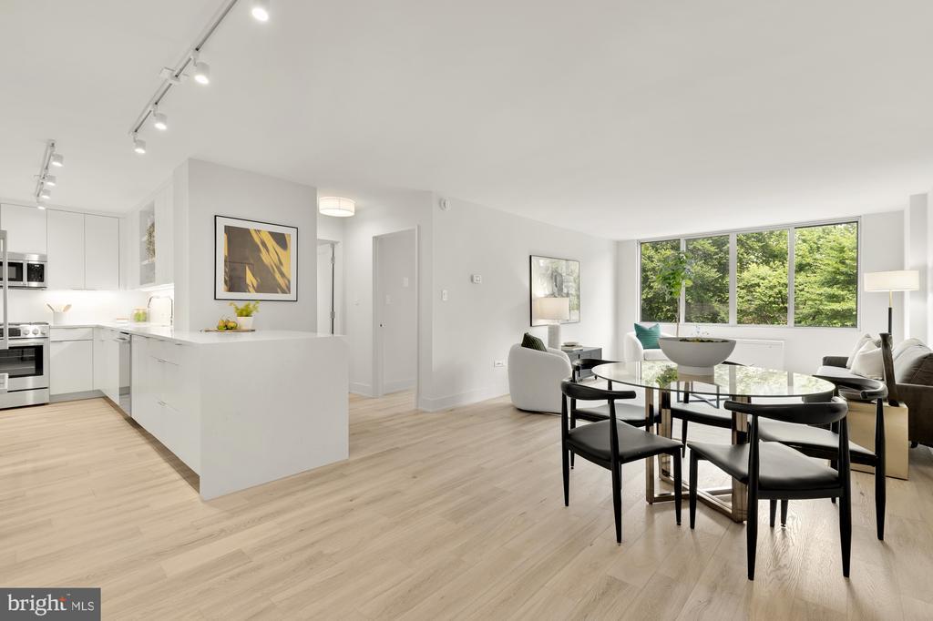 **** SELLER OFFERING ONE YEAR OF FREE PARKING WITH SALE **** A classic Forest Hills condominium residence redesigned and fully renovated for its next owner at Van Ness East! This oversized one bedroom, one full-bath unit expands 844 square feet and has been renovated with an open concept floor plan by its owner, Stephen Santos of GTM Architects. This contemporary residence features wide plank European white oak flooring, luminous interiors, and gorgeous scenic forest views of Soapstone Valley Park throughout the unit. The kitchen features Bosch appliances, custom full overlay flat panel cabinetry with Emtek hardware and undercabinet lighting, Calacatta quartz surfaces that include a waterfall peninsula and full height backsplash, and a Kohler sink with Brizo faucet. The bedroom provides dual reach-in closets, and the bathroom is lined with Porcelanosa tile, Hansgrohe fixtures, Duravit toilet and soaking tub with glass enclosure, and Porcelanosa floating vanity with electric wall mirror. The unit provides ample storage with an oversized closet at the entry and a linen closet adjacent to the bathroom. Other new improvements to the unit include brand new solid-core interior doors, polished chrome hardware, interior trim, track and decorative lighting, and screwless switch and outlet covers. Van Ness East is a premier full-service building that features a 24-hour concierge, an onsite building manager, and dedicated maintenance staff and a large storage space. Building amenities include an outdoor swimming pool, fitness center, library, and party room. ALL UTILITIES ARE INCLUDED IN THE MONTHLY CONDO FEE (water, gas, electric). The building is cat-friendly. Van Ness East is conveniently located within walking distance to the Van Ness-UDC metro station, Soapstone Valley Park, Rock Creek Park, Mom’s Organic Market, Giant, CVS, and an abundance of additional retail and dining options including neighborhood favorites Sfoglina and Breadfurst. Building is uniquely convenient to the metro as there a is a subterranean tunnel straight from Van Ness East to the Van Ness Metro (Red).