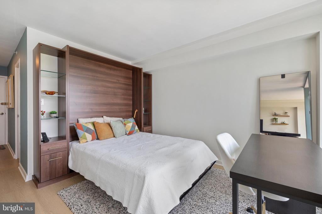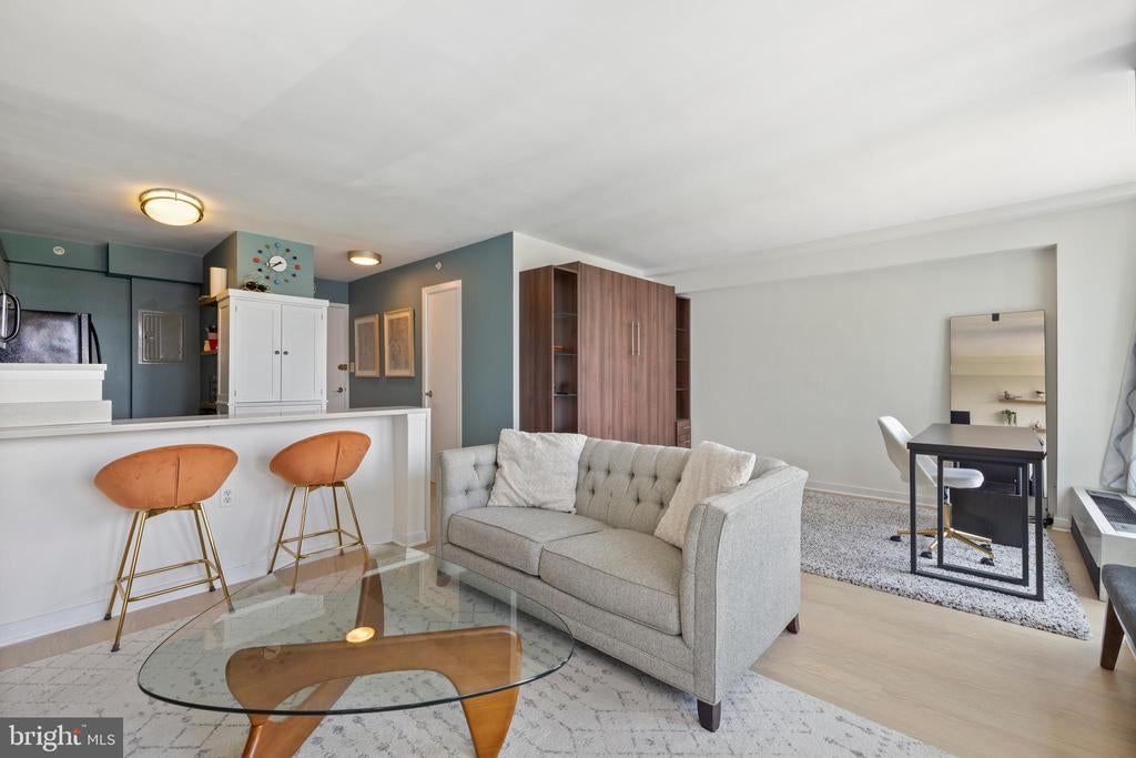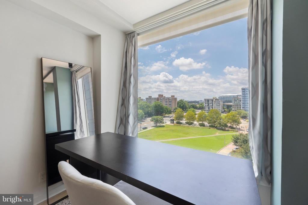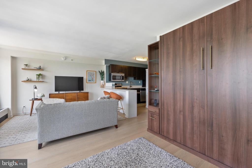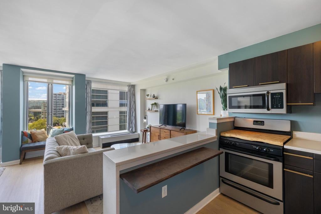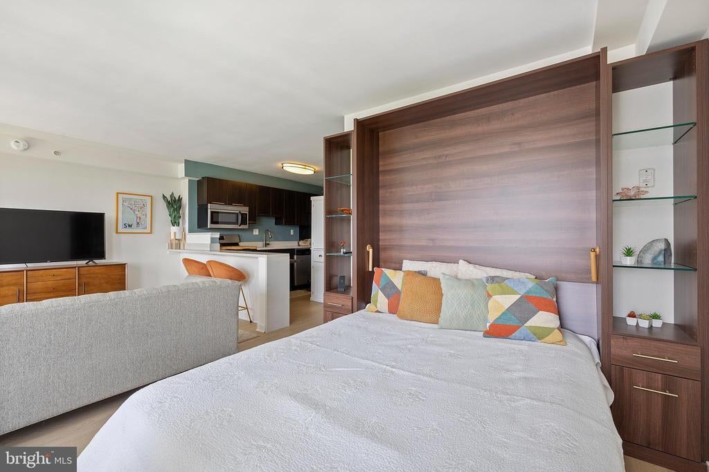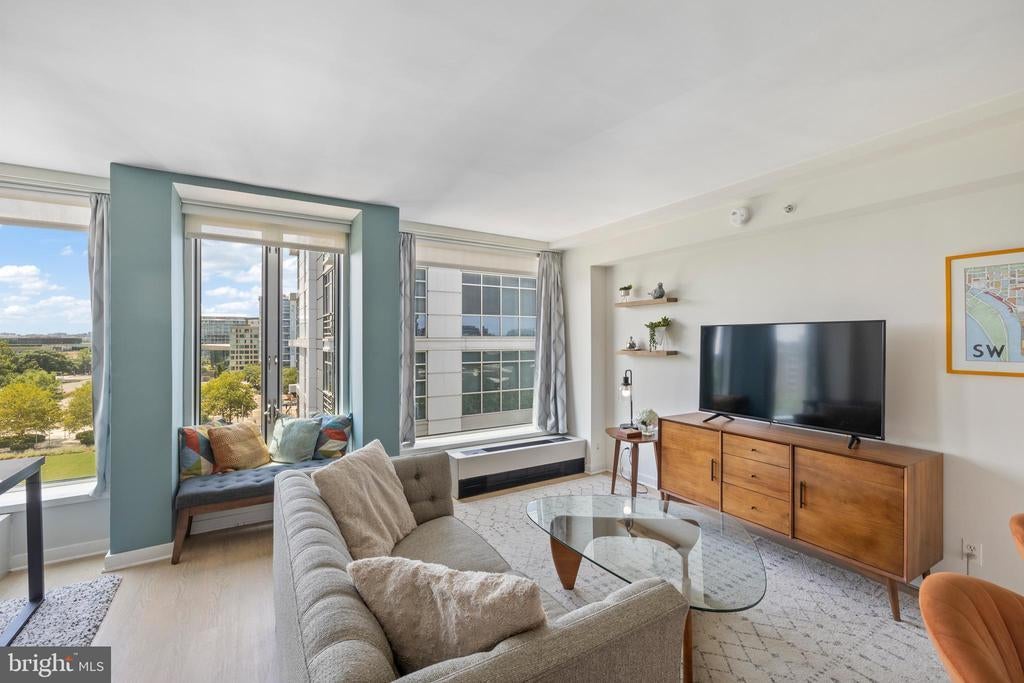Welcome to this bright and stylish mid-century modern studio located in the heart of Southwest DC at the iconic Waterfront Tower, designed by world-renowned architect I.M. Pei. This unit comes with a VA assumable mortgage at a low 2.875% interest rate for qualified buyers (non-veterans are eligible), offering a rare opportunity to own for significantly less than other condos or rentals in the area. This unit features tall ceilings, brand-new flooring, and fresh paint throughout, the space feels airy with plenty of natural light and beautiful views. The updated kitchen is equipped with Caesarstone quartz countertops, stainless steel appliances, a breakfast bar, and generous cabinetry, including a separate pantry cabinet that conveys. A walk-in closet with built-in organizers adds to the unit’s smart storage solutions. The bathroom features a deep soaking tub with modern tile and a sleek vanity with storage. Waterfront Tower Condominiums underwent a full renovation in 2008 including high-efficiency lighting, heating systems, and eco-friendly materials. Building amenities include a front desk with on-site property manager, coded entry to exterior doors and elevator, fitness center, party and lounge rooms, bike storage, common laundry, and a large private courtyard for outdoor relaxation. Garage and surface parking are also available for rent. Enjoy unmatched convenience in this prime location, just steps from Waterfront Metro Station, Safeway, and CVS, and only a few blocks to The Wharf, which offers a vibrant mix of restaurants, shops, entertainment venues. Location is less than one mile to the Navy Yard. Sports enthusiasts will love being minutes from Nationals Park while commuters benefit from easy access to major highways and National Airport, just 10 minutes away.