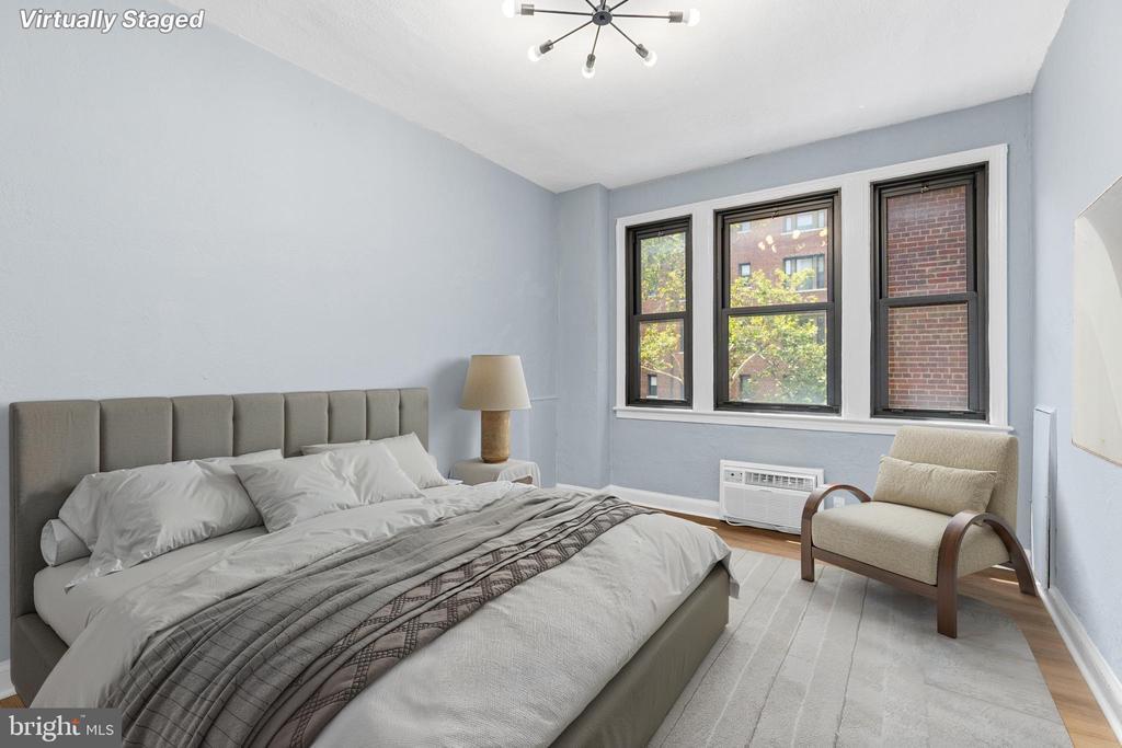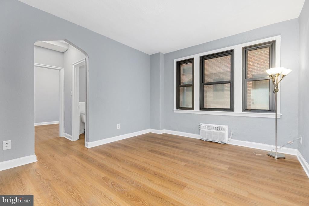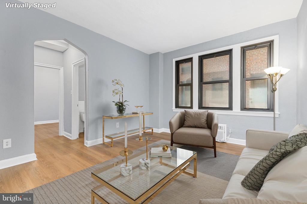 Just updated and move-in ready, this 1 bedroom, 1 bath condo at The Swarthmore combines charm, convenience, and modern upgrades in the heart of Foggy Bottom. Located just two blocks from the GWU/Foggy Bottom Metro station (Orange, Blue, Silver lines) and steps from Trader Joe’s, Whole Foods, and the vibrant dining scenes of Georgetown and Dupont, this home offers unbeatable access to everything downtown DC has to offer. Inside, you'll find that the entire unit has just been freshly painted, with brand new luxury vinyl plank flooring installed throughout. The beautifully refreshed kitchen features brand new countertops and sink, with a full appliance set, including dishwasher, range/stove with gas cooking, and a brand new refrigerator. The bathroom has also just been updated for this sale, with a new vanity, mirrored cabinet, and sleek new tub hardware. Two brand-new portable heating and cooling units ensure year-round comfort. This unit also includes basement access to a personal Storage Unit (#29) and well-maintained laundry room, with the option to install in-unit laundry if desired. The Swarthmore is a classic 1938-built, 8-story building known for its solid construction and modern amenities, including a rooftop terrace with city views, 24/7 fitness room, secure key fob entry, and on-site management. With a Walk Score of 97 and Bike Score of 93, you’ll be connected to everything — from the Kennedy Center and GWU to Washington Harbor and West End. Natural gas and water are included in the low monthly condo fee. This is an ideal opportunity for first-time buyers, investors, or anyone seeking a prime DC location with stylish, turnkey updates.