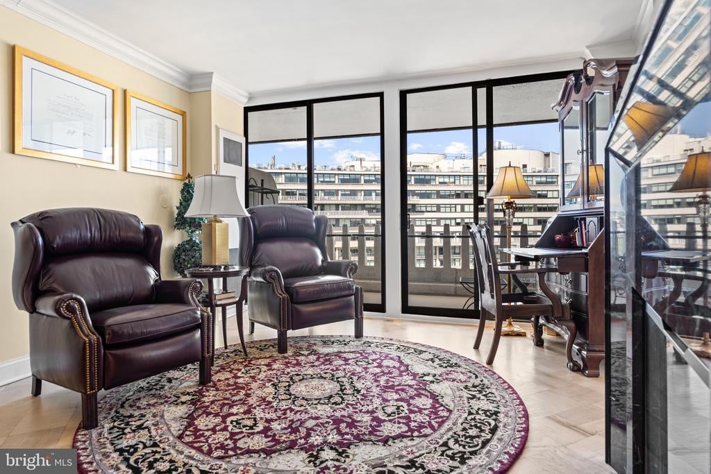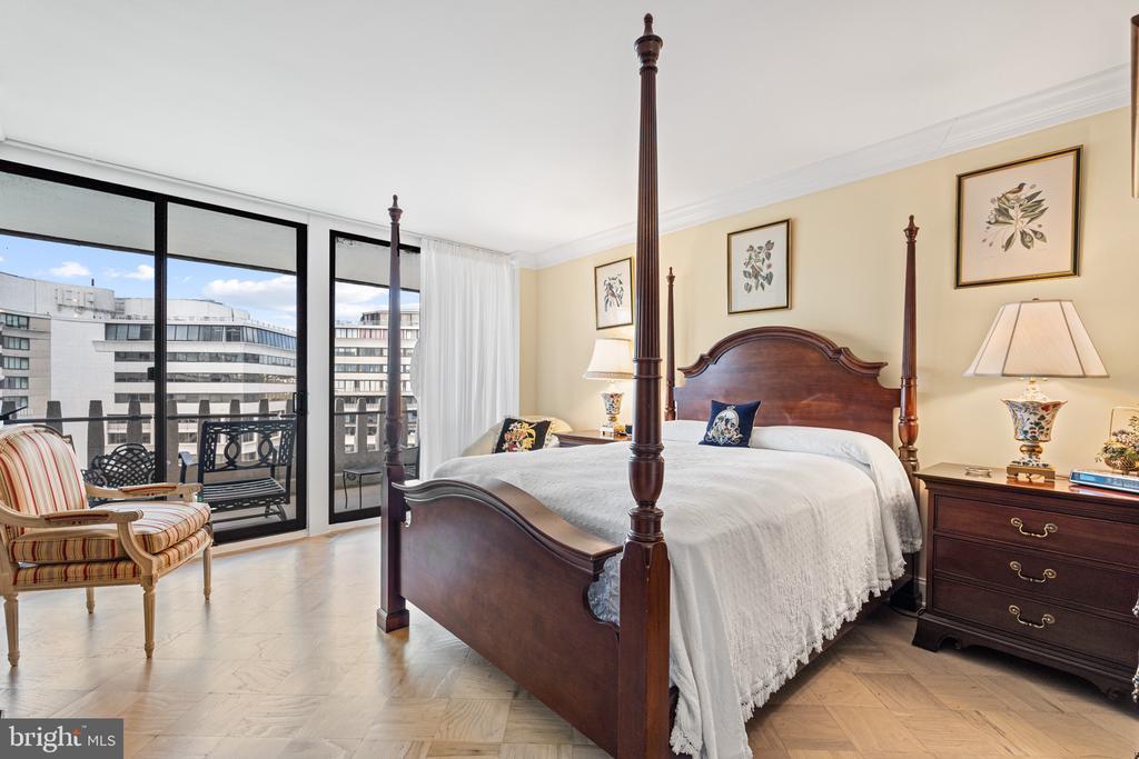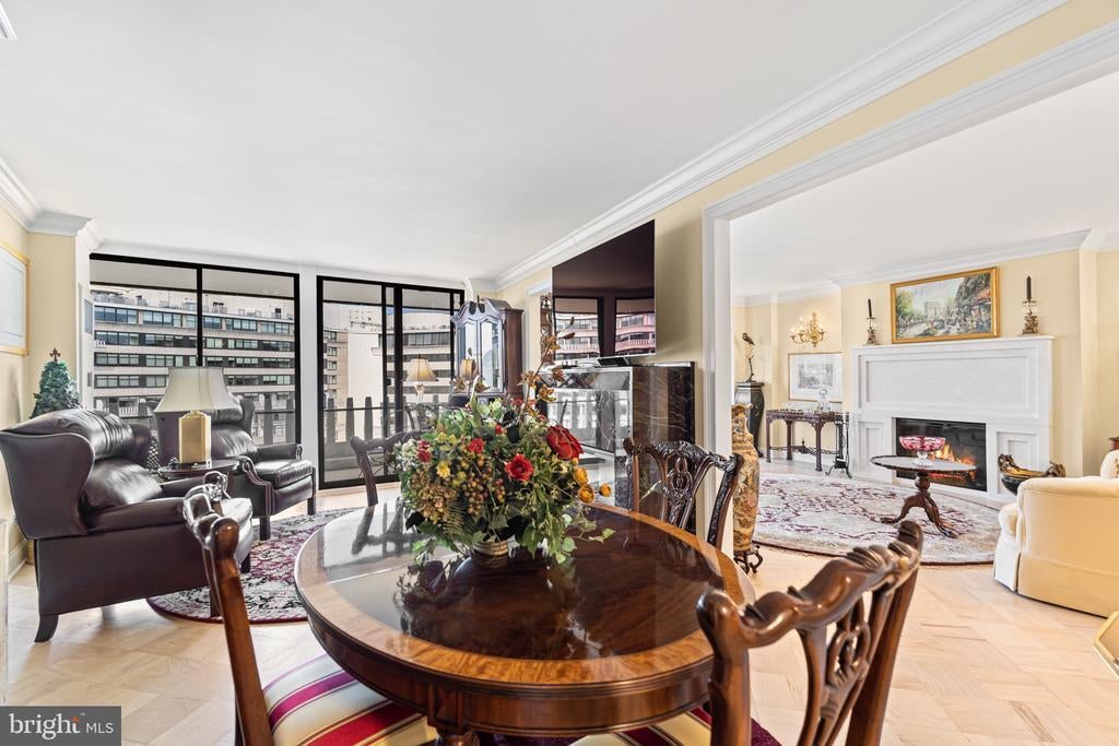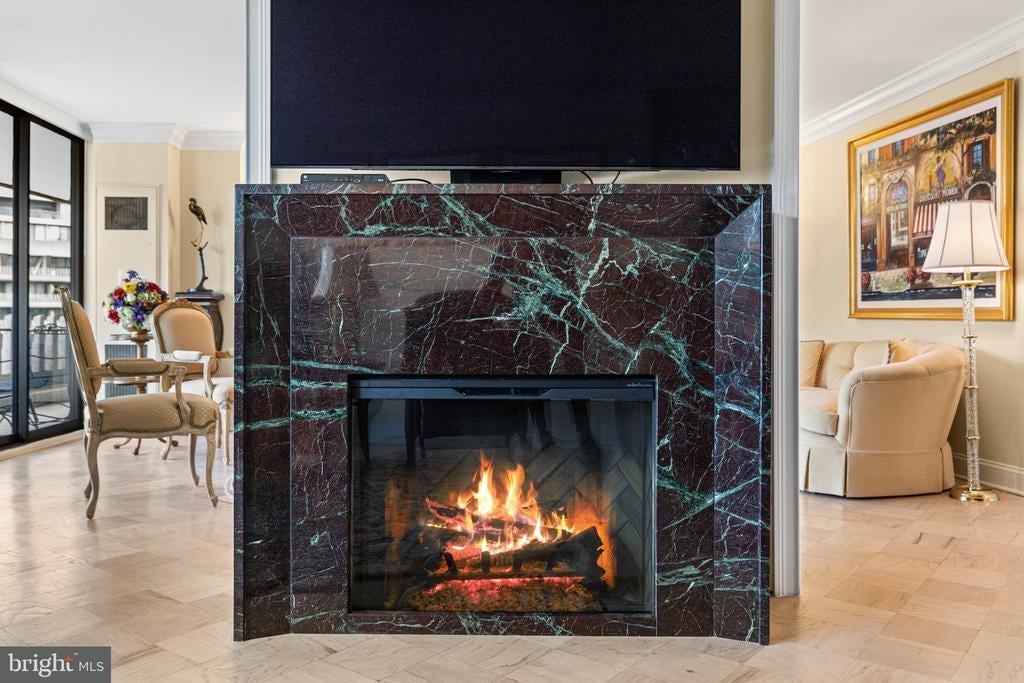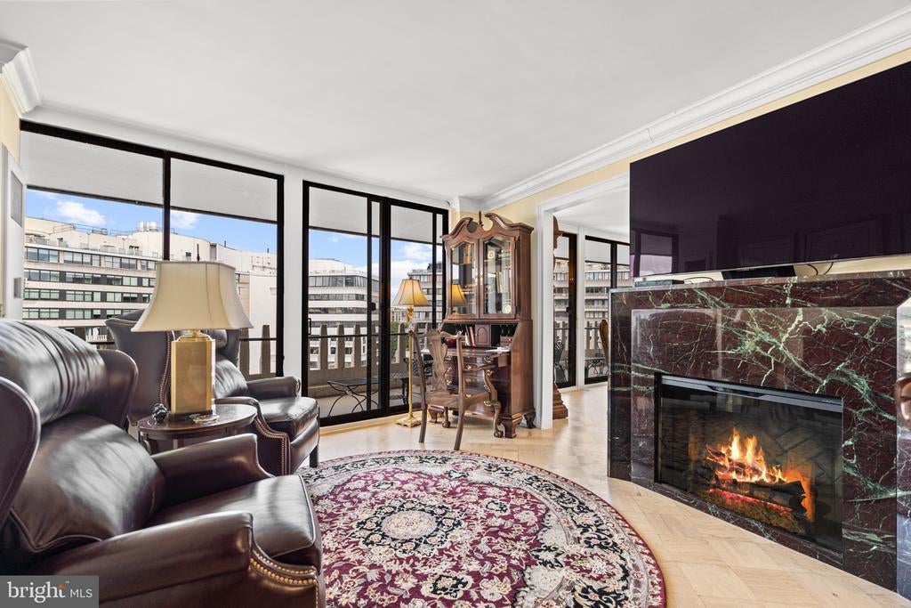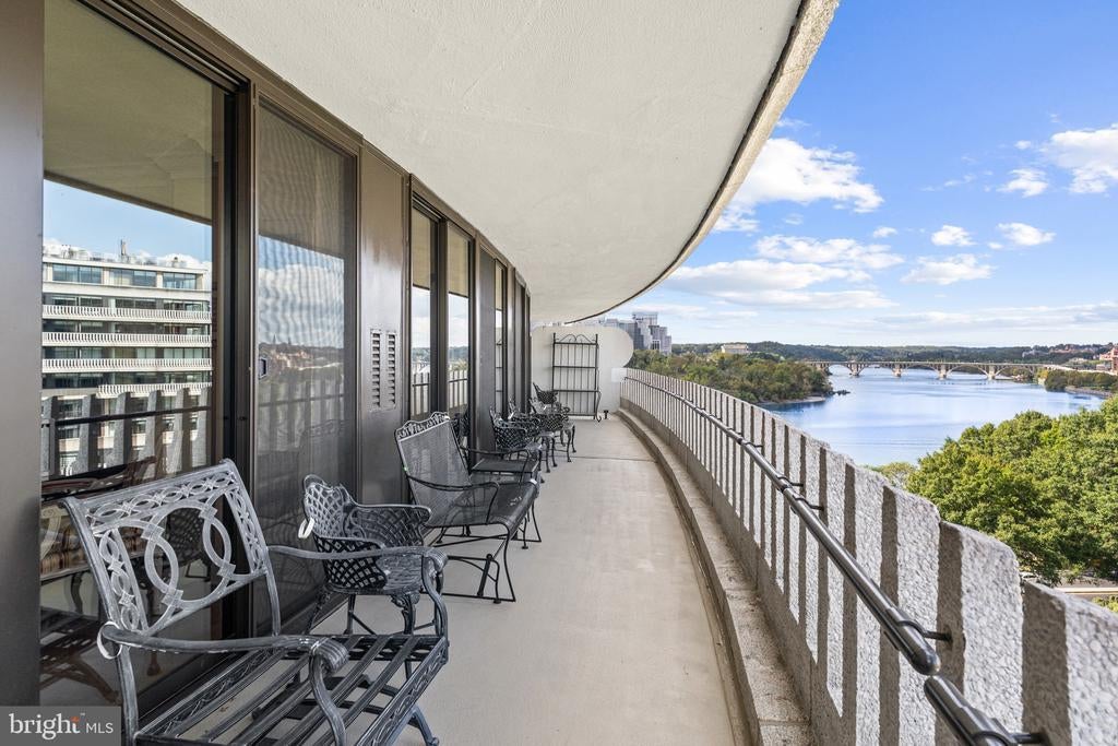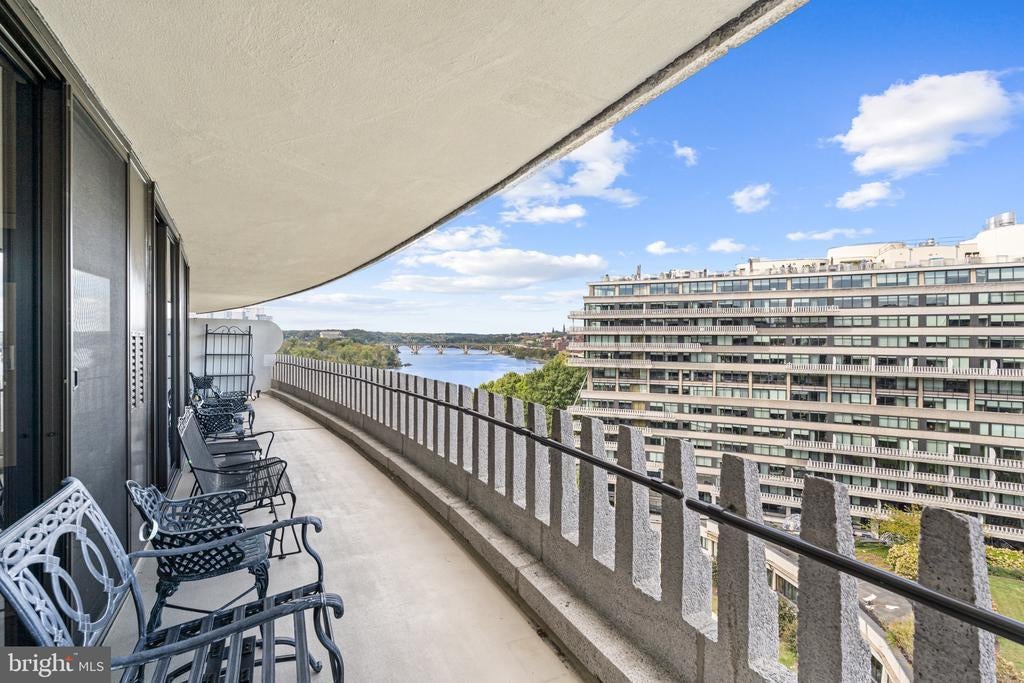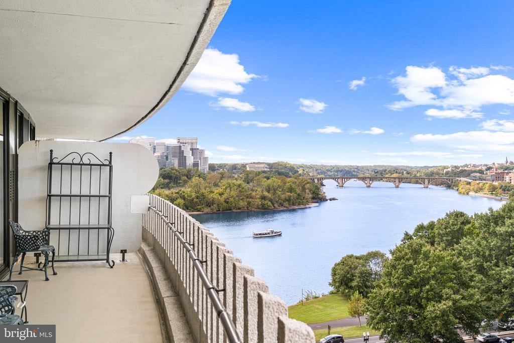 Renovated river view residence. 1338 square feet. 1 bedroom, 1 & 1/2 bath. • Over 35 foot long balcony across entire perimeter facing the Potomac River and Georgetown waterfront. • New energy efficient floor-to-ceiling windows. • Separate dining area and den space. • Two Dimplex Revillusion 36" electric fireplaces with marble surround and remote control feature. • Gourmet kitchen with Quartzite (Stella Maestro) counters, back splash and integrated sink, GE Monogram appliances, Kraft Maid cabinetry, beautiful fixtures. • Superb appointed baths featuring stunning marble walls, granite counters with integrated Cambria sinks, large vanities and hand picked hardware. White cabinetry storage in second bath and designer flooring. Primary bath features spa shower, marble flooring. • Ample Custom California closet systems. • New Marvin interior doors and crown molding. • Light refinished oak parquet floors. Additional storage room. One underground garage space included. Fee includes property taxes, utilities, maintenance of HVAC, basic cable, internet, and parking. Watergate South amenities include 24-hour front desk & doorman service, outdoor saltwater pool & grill, newly renovated fitness center, newly renovated community room, beautifully landscaped gardens, roof terrace, dog spa room, plus on-site shops & restaurants. Walk to Foggy Bottom Metro, Kennedy Center, Whole Foods, and Georgetown Waterfront. High walk score near shopping, restaurants, Watergate Hotel, and many more conveniences.