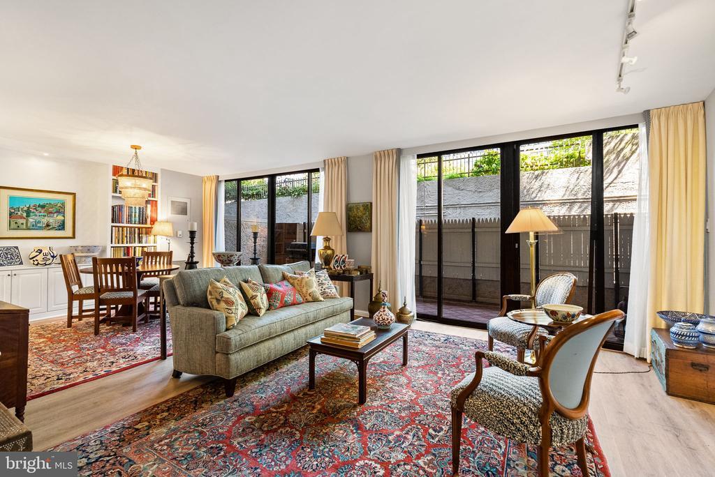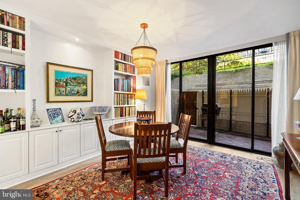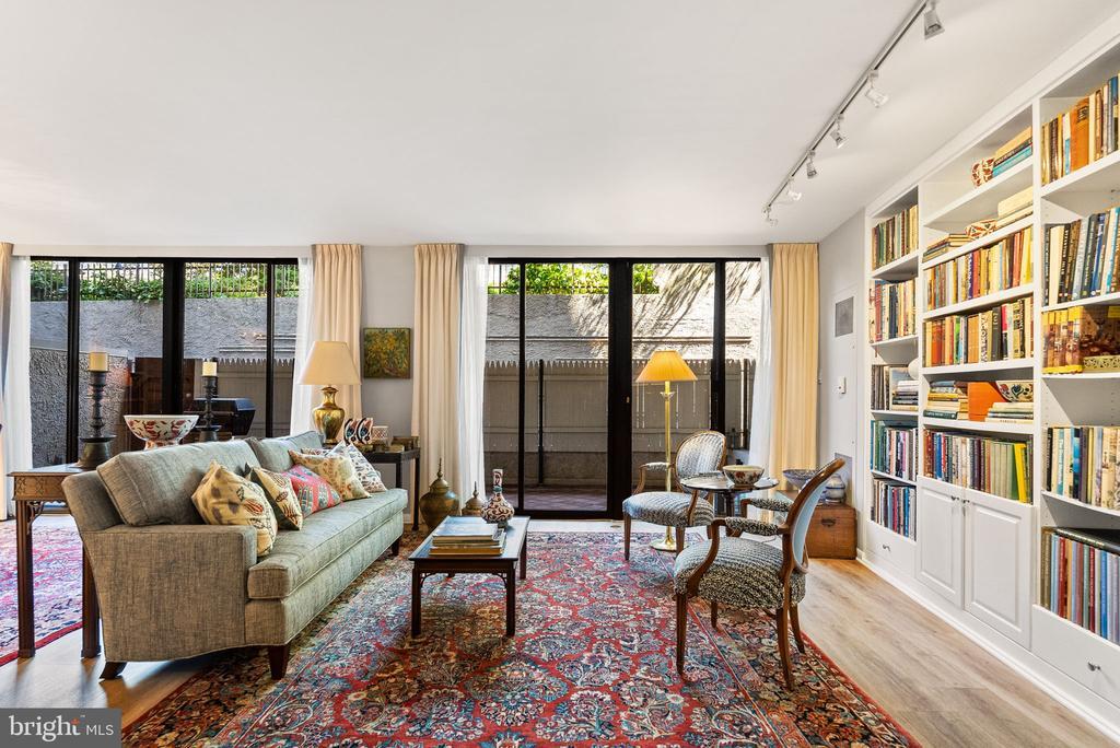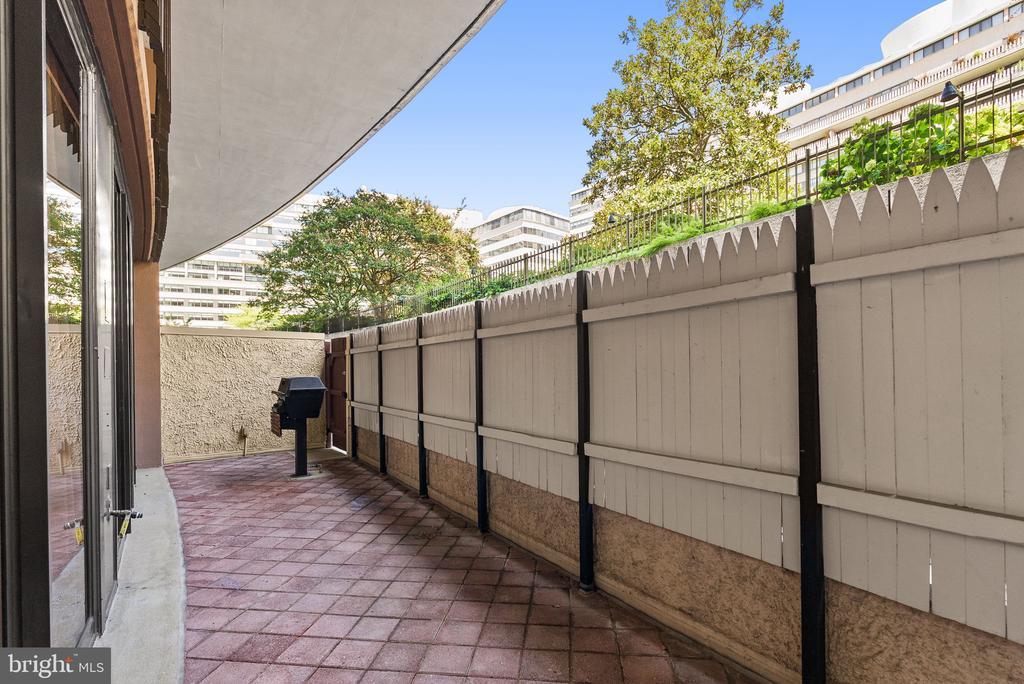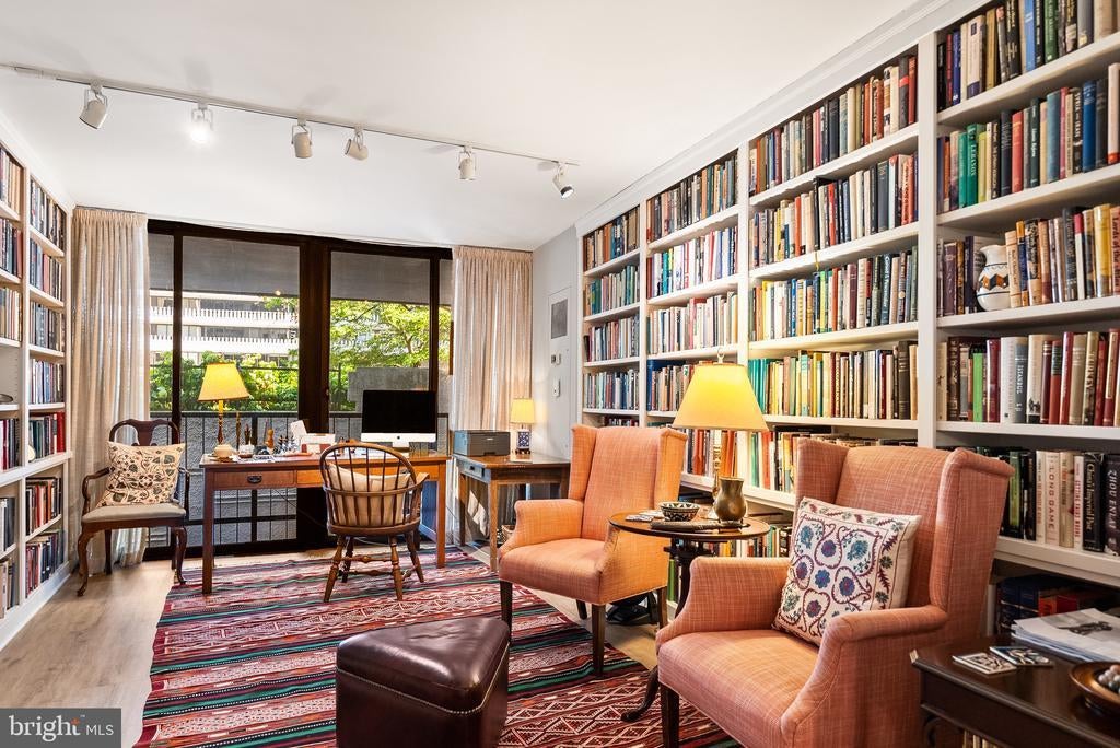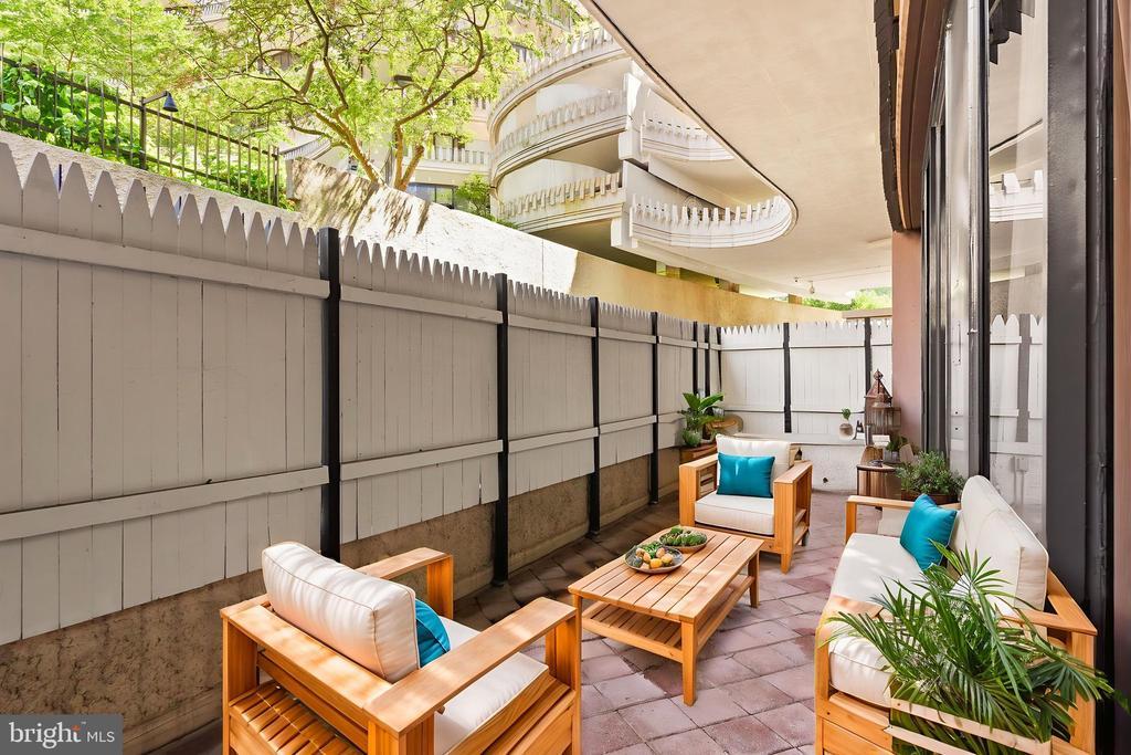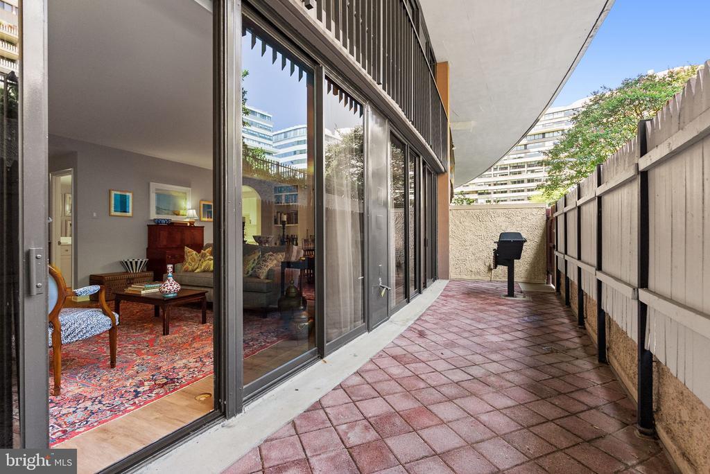 Have the Best of Both Worlds! Beautiful 1697 sq ft interior space- two bedrooms & den, 2.5 baths "townhouse-style" floor plan. Dine al fresco on your private patio/terrace with gas grill, convenient second entrance, and built-in planter. Spacious living room and dining area with entry onto the terrace. The interior is a booklover's dream with beautiful custom buil tins for books or display art. Floor-to-ceiling windows throughout . Juliet balconies on the second level. Bright kitchen with quartz countertops, extra large undermount sink, Kohler faucet, fine cabinetry with designer hardware, pantry storage and top appliances. Updated baths with Kohler fixtures. Master bath a has large vanity, with soaking tub and separate walk-in shower with glass enclosure. Tiled surround second full bath with large walk in shower and features a laundry space with storage/ shelving area, washer/dryer in laundry space Fantastic open den area on the upper level: approx. 400+ square foot work area with built-in shelving Superior custom closet space throughout, including a large below-stairs storage space, plus additional storage room. Convenient ground-level entry with no waiting for an elevator. The gate entrance from your terrace making it easy to bring in groceries, or take a walk! One underground garage space included. Fee includes property taxes, utilities, maintenance of HVAC, basic cable, internet, and parking. Watergate South amenities include 24-hour front desk & doorman service, outdoor saltwater pool & grill, newly renovated fitness center, newly renovated community room, beautifully landscaped gardens, roof terrace, dog spa room, plus on-site shops & restaurants. Walk to Foggy Bottom Metro, Kennedy Center, Whole Foods, and Georgetown Waterfront. High walk score near shopping, restaurants, Watergate Hotel, and many more conveniences.