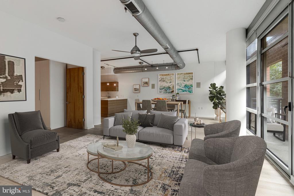 Incredible Modern Loft Living in the Heart of DC Step into this stunning 1,322 sq. ft., 2 bed / 2 bath residence at Lofts 11 with direct elevator entry and soaring ceilings. A spacious foyer opens to a dramatic, open-concept layout with floor-to-ceiling windows and a large private balcony perfect for morning coffee or evening sunsets. The gourmet kitchen is a chef’s dream, featuring custom cabinetry, granite countertops, Porcelanosa backsplash, breakfast bar, and top-tier appliances including a Wolf gas range and Subzero refrigerator. Flow seamlessly into the expansive living and dining area designed for both comfort and entertaining. Retreat to the luxurious primary suite with a walk-in closet, built-in wardrobe and spa-inspired bath with a frameless glass shower. A spacious guest bedroom, modern hall bath, and custom closets throughout complete this home. Additional highlights include dimmable lighting, industrial-chic accents, in-unit washer/dryer, gas fireplace and more. Lofts 11 is a boutique, eco-friendly building with a secure lobby and pet-friendly lifestyle. Unbeatable location steps to Blagden Alley, Mount Vernon Triangle, Shaw, and Logan Circle with premier dining, cafes, fitness studios, and shops all at your doorstep.