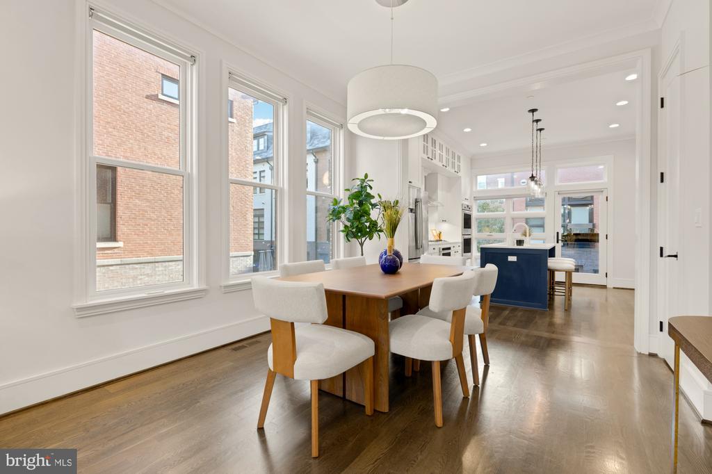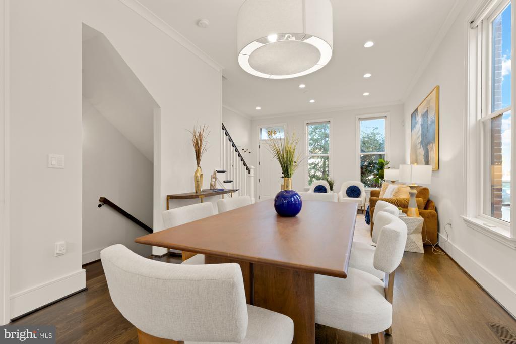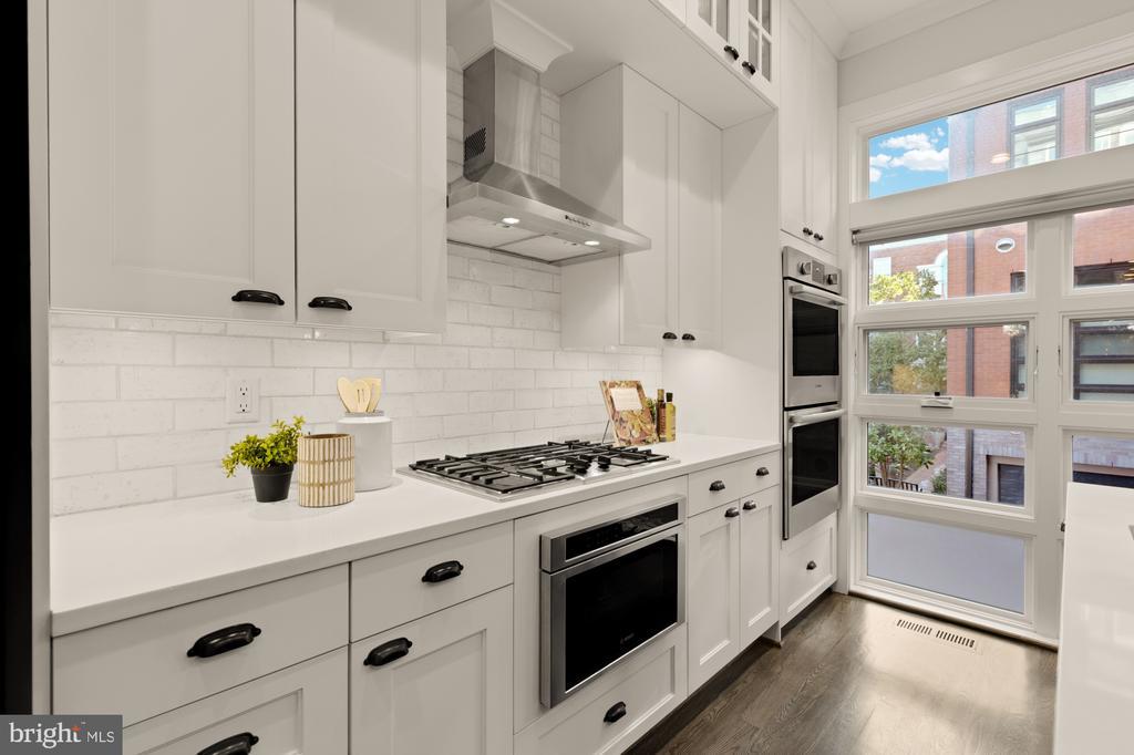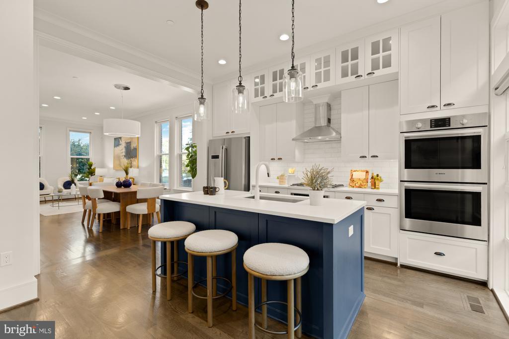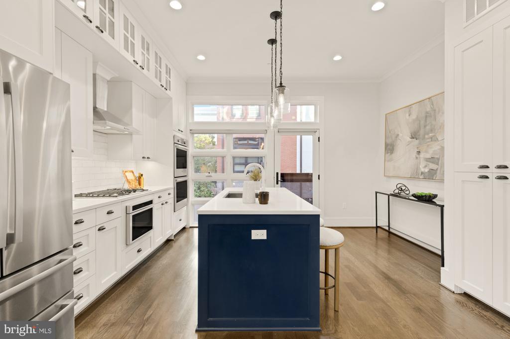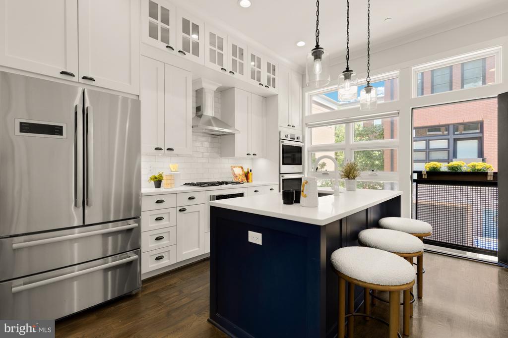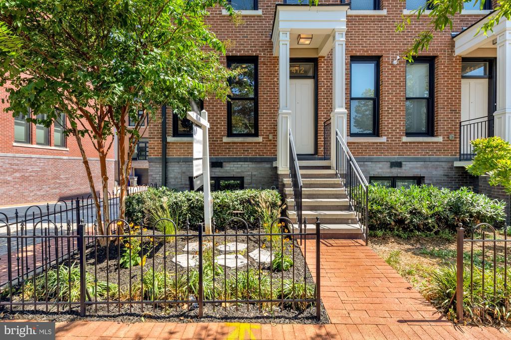Designer End-Unit Townhome with Rooftop Capitol Views Welcome to 412 13th Street SE, a rare Buchanan Park residence blending modern tastes, timeless detail, and unbeatable proximity to Eastern Market and Barracks Row. Constructed in 2017 by McCullough Construction, LLC, with design excellence by Maurice Walters Architect Inc., this residence harmoniously combines quality materials and finishes with contemporary luxuries across four levels. Step inside to discover nearly 10-foot ceilings, oak hardwood floors, and refined crown molding, creating an atmosphere of timeless elegance. Oversized JELD-WEN wood windows allow natural light to pour into every corner and include motorized shades. The main level boasts an open-concept layout including a bright living area with a bonus bank of windows and space for a large dining room table and a powder room. This inviting space flows into a gourmet chef’s kitchen, equipped with Bosch & Thermador appliances, quartz countertops, and bespoke cabinetry, including a pantry. A generous island with seating and floor-to-ceiling windows with a Juliet balcony make this space ideal for both day-to-day living and entertaining. The upper floors feature 3 bedrooms with en-suite baths, adorned with Waterworks fixtures and marble finishes, ample closets complete with custom designed systems. A flexible den on the lower level and a full bath offers space that can adapt to a guest suite, media area, home office, or fitness room. Additional features include a spacious garage with ample storage. The home's expansive roof terrace is a charming tree-top retreat offering sweeping westward views of the U.S. Capitol, Library of Congress, and Watkins school’s sports fields. With a natural gas hookup and hose bib, this outdoor space is perfectly equipped for grilling, gardening, or enjoying a serene evening under the stars. The home's brick exterior, wrought iron-fenced yard, and landscaped grounds reflect the unified elegance of the Buchanan Park community. Ideally located just blocks from Safeway, Eastern Market, Lincoln Park, Trader Joe’s, The Roost, and the vibrant Barracks Row restaurant corridor, with the Potomac Ave and Eastern Market Metro stations mere minutes away — this is Capitol Hill living at its finest. Experience unparalleled luxury, convenience, and architectural excellence in this remarkable residence.