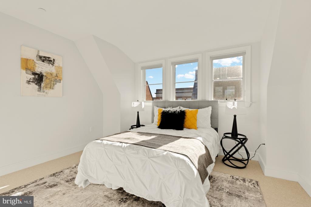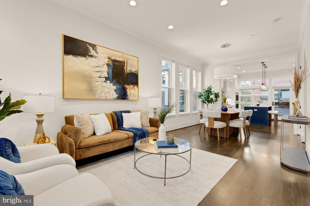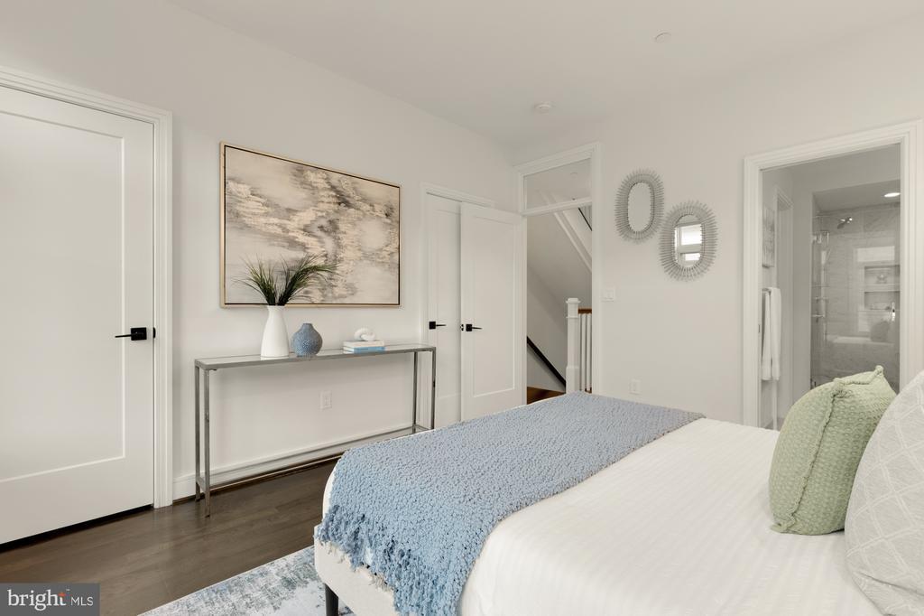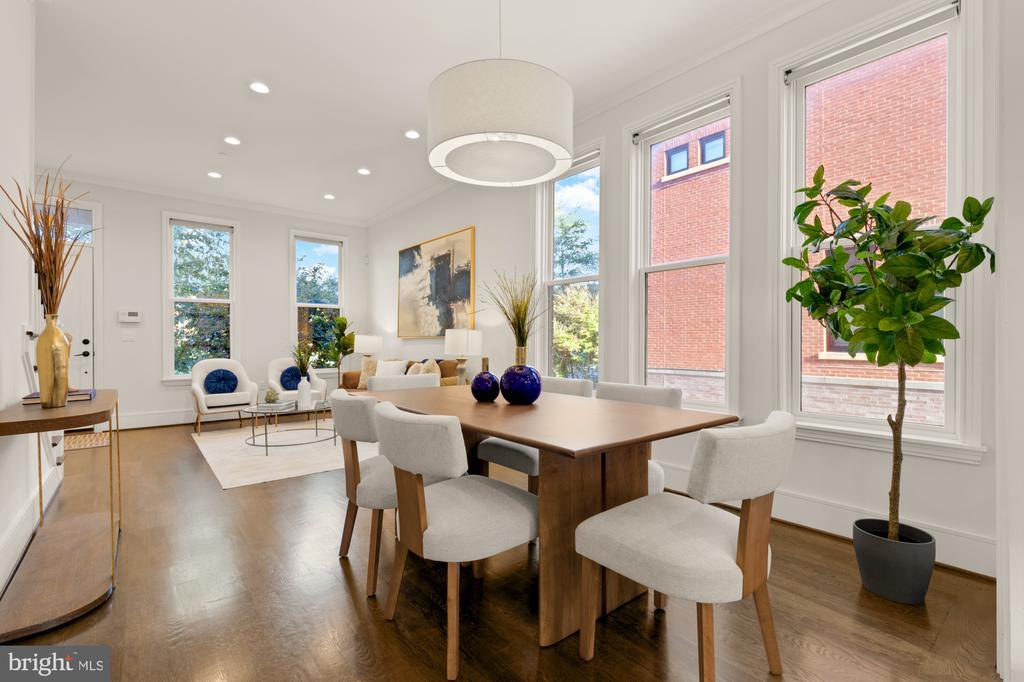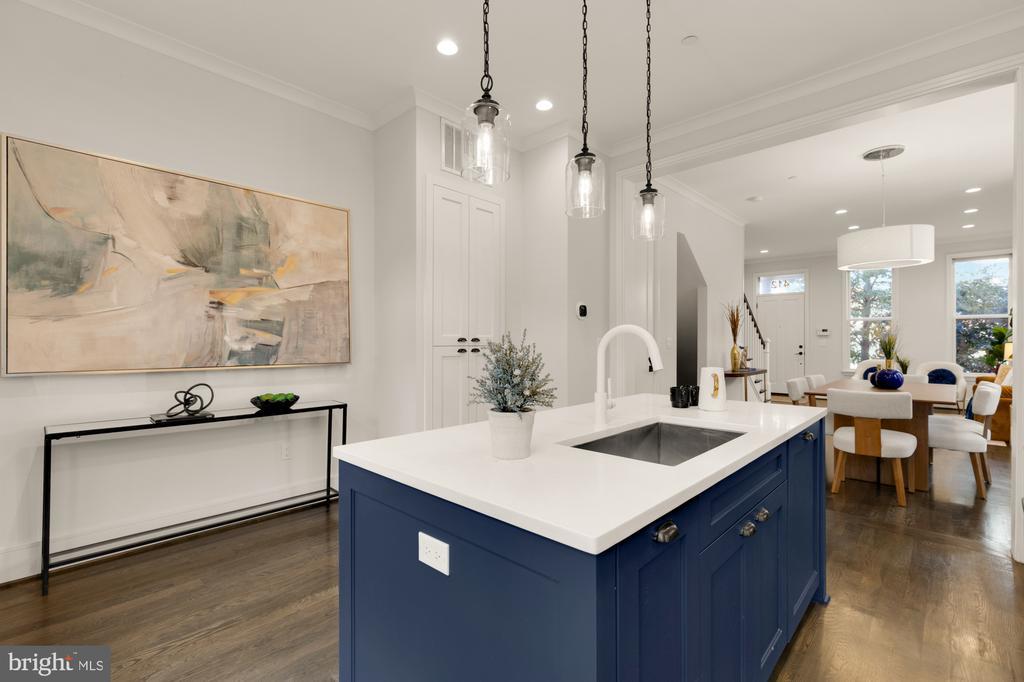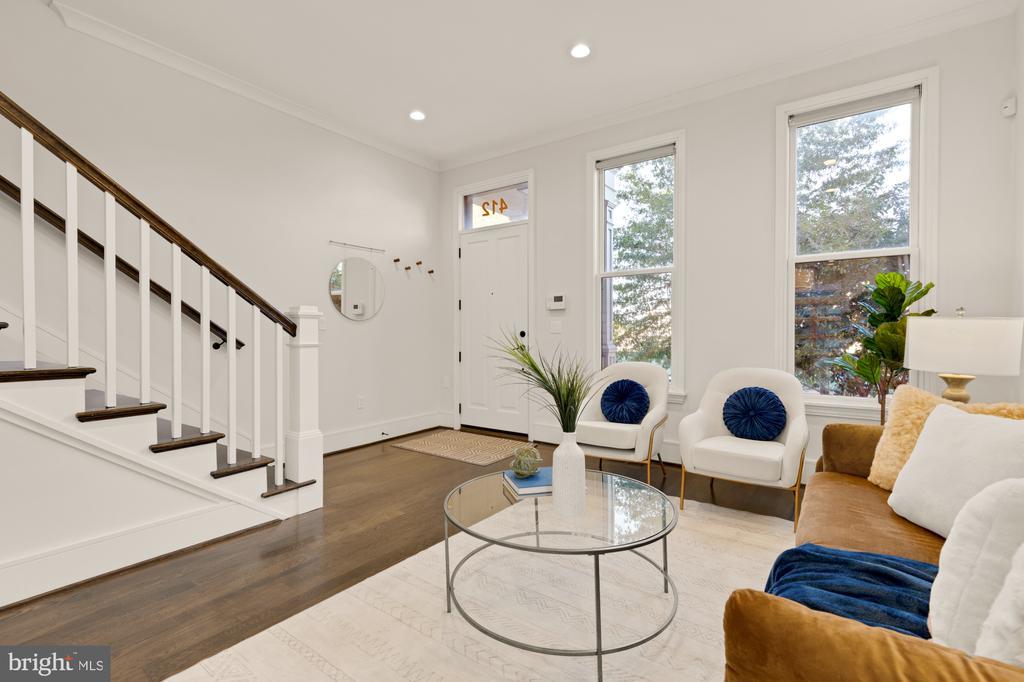 Designer End-Unit Townhome with Rooftop Capitol Views Welcome to 412 13th Street SE, a rare Buchanan Park residence blending modern tastes, timeless detail, and unbeatable proximity to Eastern Market and Barracks Row. Constructed in 2017 by McCullough Construction, LLC, with design excellence by Maurice Walters Architect Inc., this residence harmoniously combines quality materials and finishes with contemporary luxuries across four levels. Step inside to discover nearly 10-foot ceilings, oak hardwood floors, and refined crown molding, creating an atmosphere of timeless elegance. Oversized JELD-WEN wood windows allow natural light to pour into every corner and include motorized shades. The main level boasts an open-concept layout including a bright living area with a bonus bank of windows and space for a large dining room table and a powder room. This inviting space flows into a gourmet chef’s kitchen, equipped with Bosch & Thermador appliances, quartz countertops, and bespoke cabinetry, including a pantry. A generous island with seating and floor-to-ceiling windows with a Juliet balcony make this space ideal for both day-to-day living and entertaining. The upper floors feature 3 bedrooms with en-suite baths, adorned with Waterworks fixtures and marble finishes, ample closets complete with custom designed systems. A flexible den on the lower level and a full bath offers space that can adapt to a guest suite, media area, home office, or fitness room. Additional features include a spacious garage with ample storage. The home's expansive roof terrace is a charming tree-top retreat offering sweeping westward views of the U.S. Capitol, Library of Congress, and Watkins school’s sports fields. With a natural gas hookup and hose bib, this outdoor space is perfectly equipped for grilling, gardening, or enjoying a serene evening under the stars. The home's brick exterior, wrought iron-fenced yard, and landscaped grounds reflect the unified elegance of the Buchanan Park community. Ideally located just blocks from Safeway, Eastern Market, Lincoln Park, Trader Joe’s, The Roost, and the vibrant Barracks Row restaurant corridor, with the Potomac Ave and Eastern Market Metro stations mere minutes away — this is Capitol Hill living at its finest. Experience unparalleled luxury, convenience, and architectural excellence in this remarkable residence.