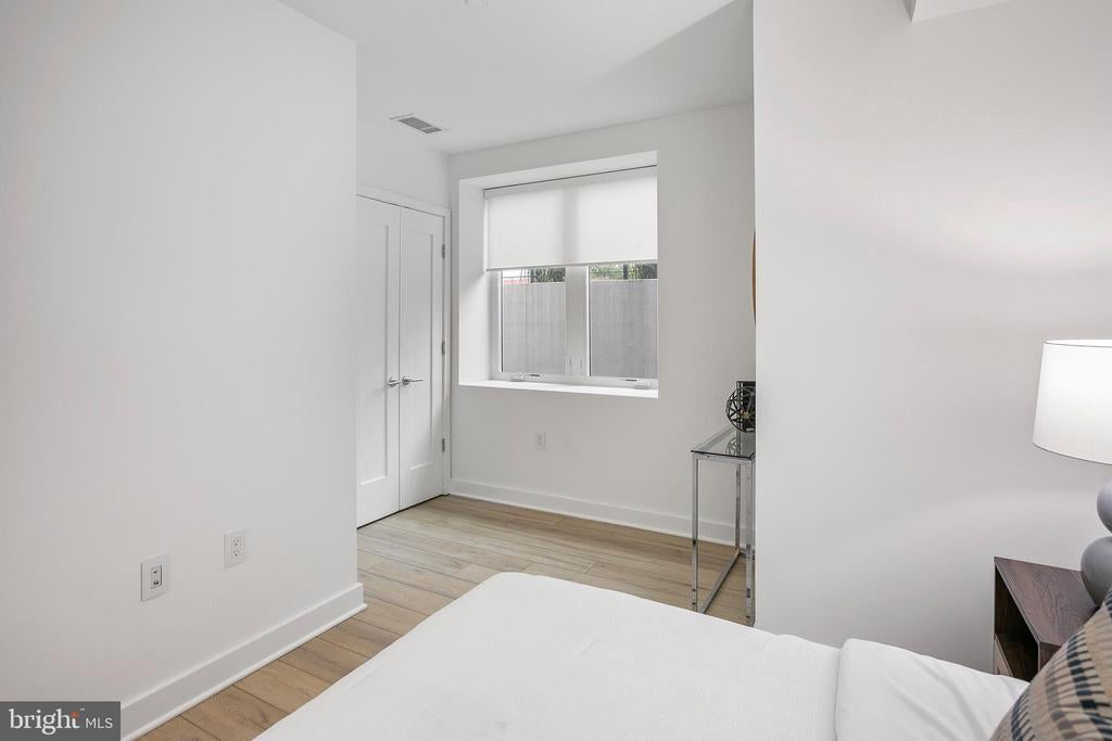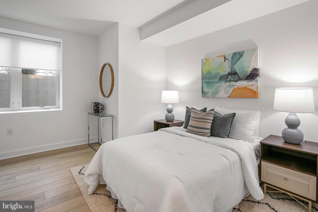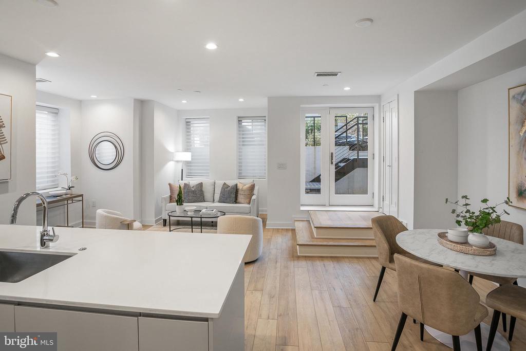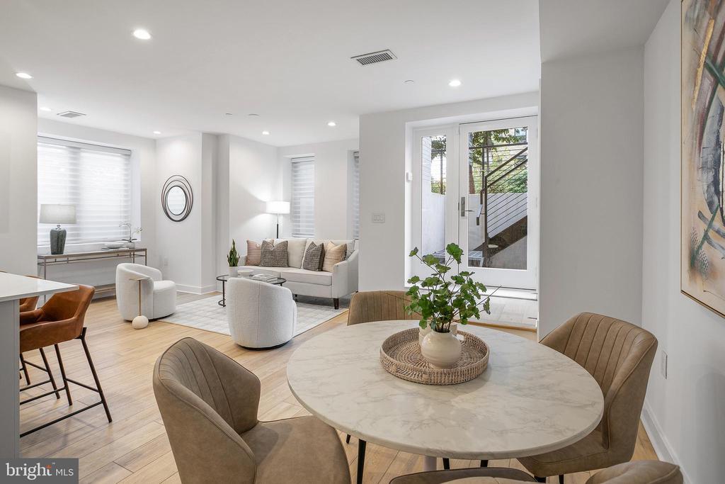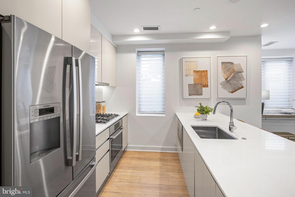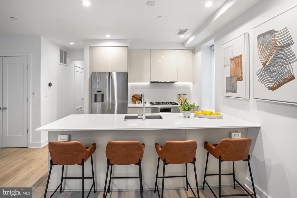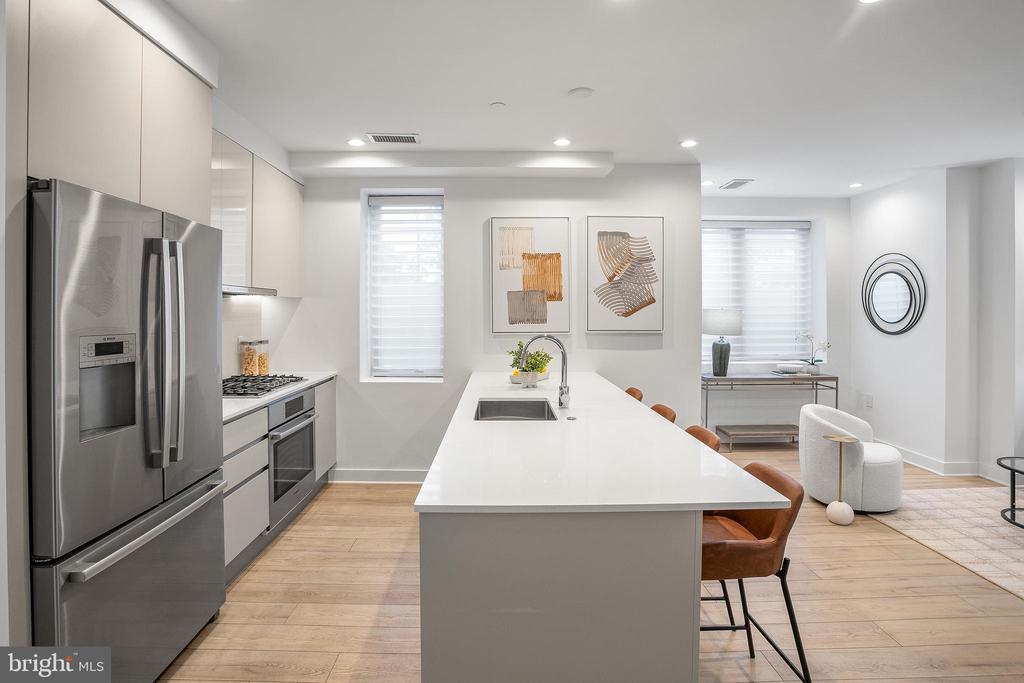 Welcome to 11 | Q, a boutique luxury condominium, in Logan Circle. Unit 103 is a rare corner unit with ample natural light and is on the market for the first time since 2019. This spacious and bright two bedroom, two bath features high-end finishes throughout, 9-ft ceilings, and private outdoor space. Modern touches are everywhere you look from the wide-plank flooring, to stainless steel appliances, custom cabinetry, and quartz counters. The serene color palette, custom window treatments, and recessed lighting add elegance to the open floor plan, which is accessible through a convenient private entrance. Both the living and dining areas feature architectural insets that make the spaces feel more defined. There is an additional nook that could be used as an in-home office. The modern kitchen features an expansive island with ample seating and cabinet space. The primary bedroom includes an en-suite bathroom with double vanity and walk-in shower and large closet for plenty of storage. Bedroom two offers a closet with double doors, and access to the second full bathroom. In-unit laundry completes this perfect package. 11 | Q, built in 2019, features low condo fees and is pet-friendly. Located on coveted Q Street, NW which is a one way tree-lined street. Metro is less than 0.5 miles away, and the park is only one short block. Enjoy close proximity to Whole Foods, Le Diplomate, and some of the best restaurants and shops in the city.