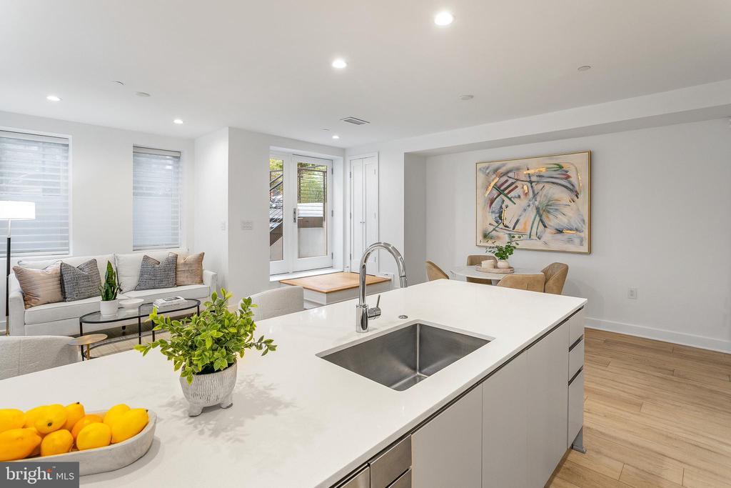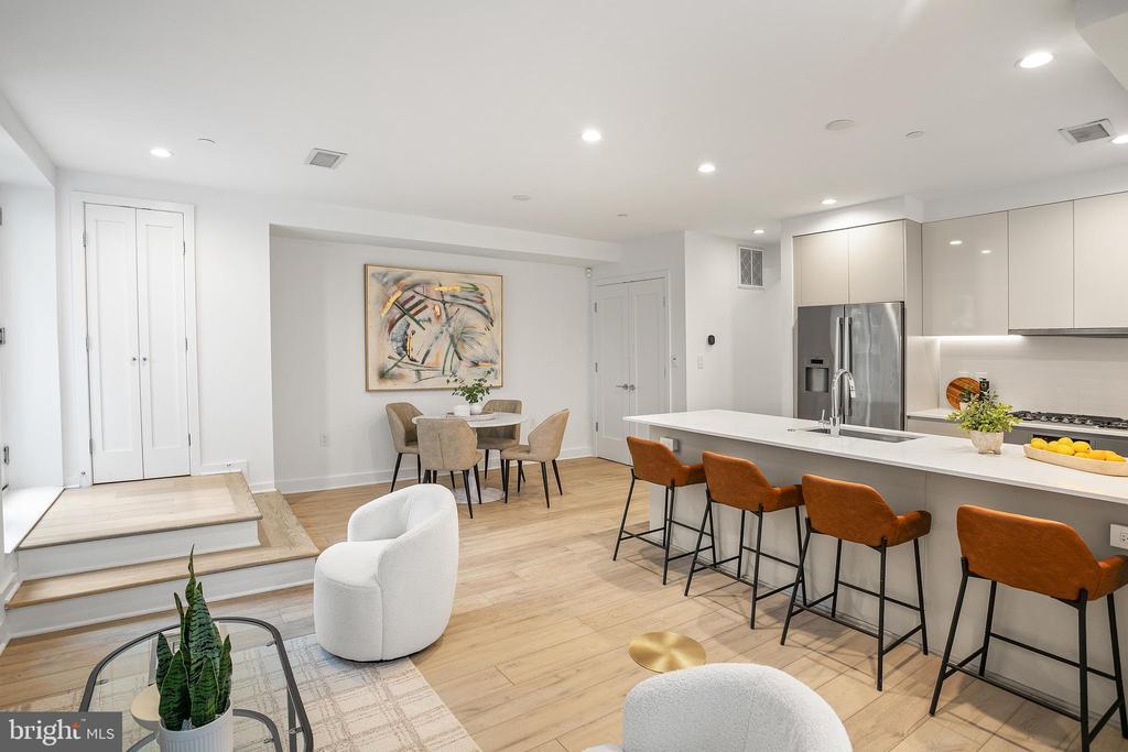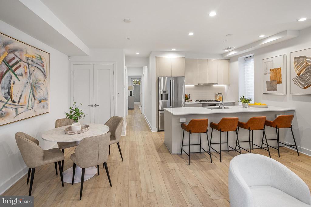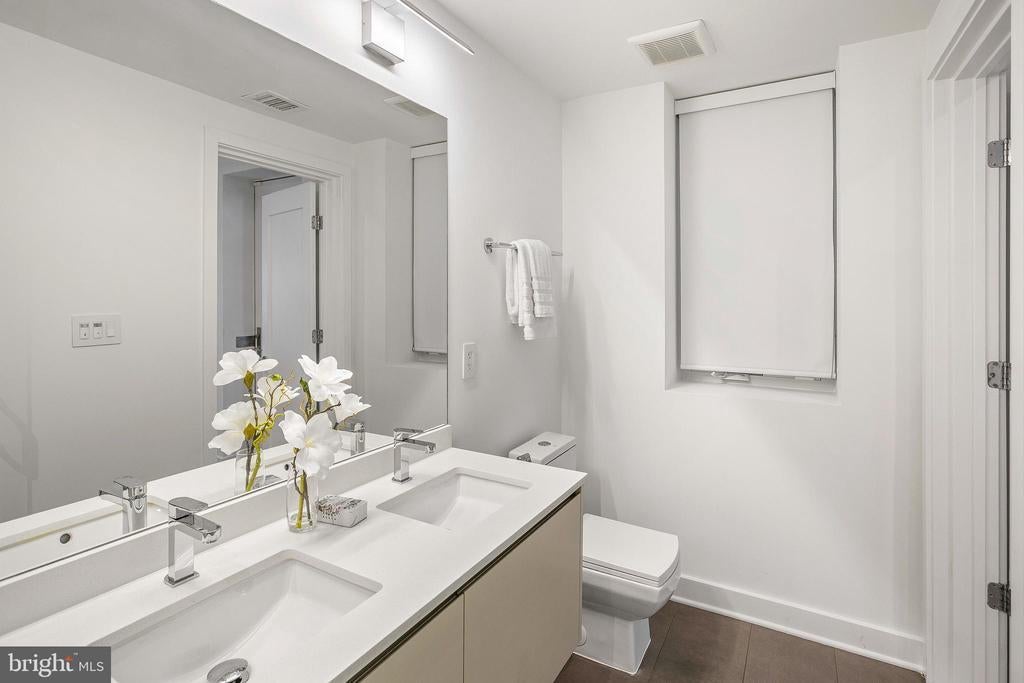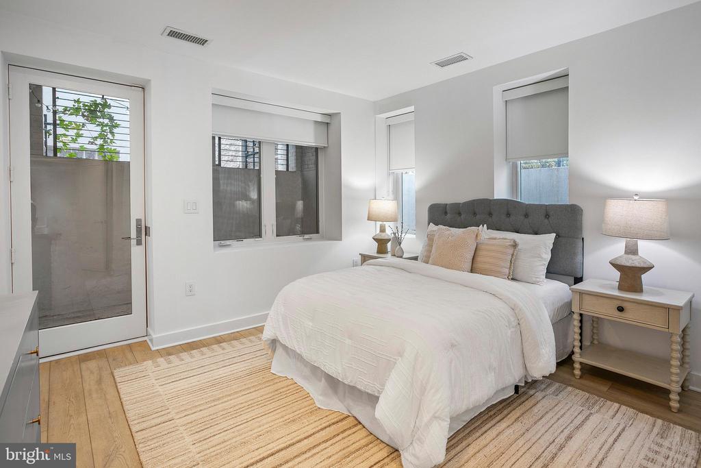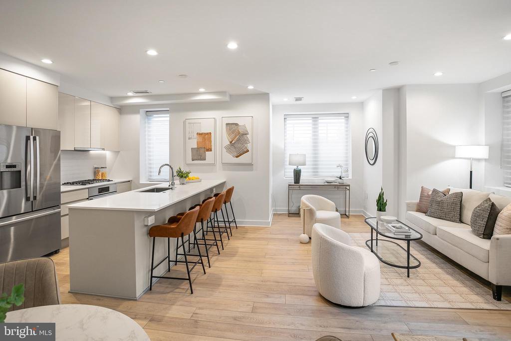 Welcome to 11 | Q, a boutique luxury condominium, in Logan Circle. Unit 103 is a rare corner unit with ample natural light and is on the market for the first time since 2019. This spacious and bright two bedroom, two bath features high-end finishes throughout, 9-ft ceilings, and private outdoor space. Modern touches are everywhere you look from the wide-plank flooring, to stainless steel appliances, custom cabinetry, and quartz counters. The serene color palette, custom window treatments, and recessed lighting add elegance to the open floor plan, which is accessible through a convenient private entrance. Both the living and dining areas feature architectural insets that make the spaces feel more defined. There is an additional nook that could be used as an in-home office. The modern kitchen features an expansive island with ample seating and cabinet space. The primary bedroom includes an en-suite bathroom with double vanity and walk-in shower and large closet for plenty of storage. Bedroom two offers a closet with double doors, and access to the second full bathroom. In-unit laundry completes this perfect package. 11 | Q, built in 2019, features low condo fees and is pet-friendly. Located on coveted Q Street, NW which is a one way tree-lined street. Metro is less than 0.5 miles away, and the park is only one short block. Enjoy close proximity to Whole Foods, Le Diplomate, and some of the best restaurants and shops in the city.
