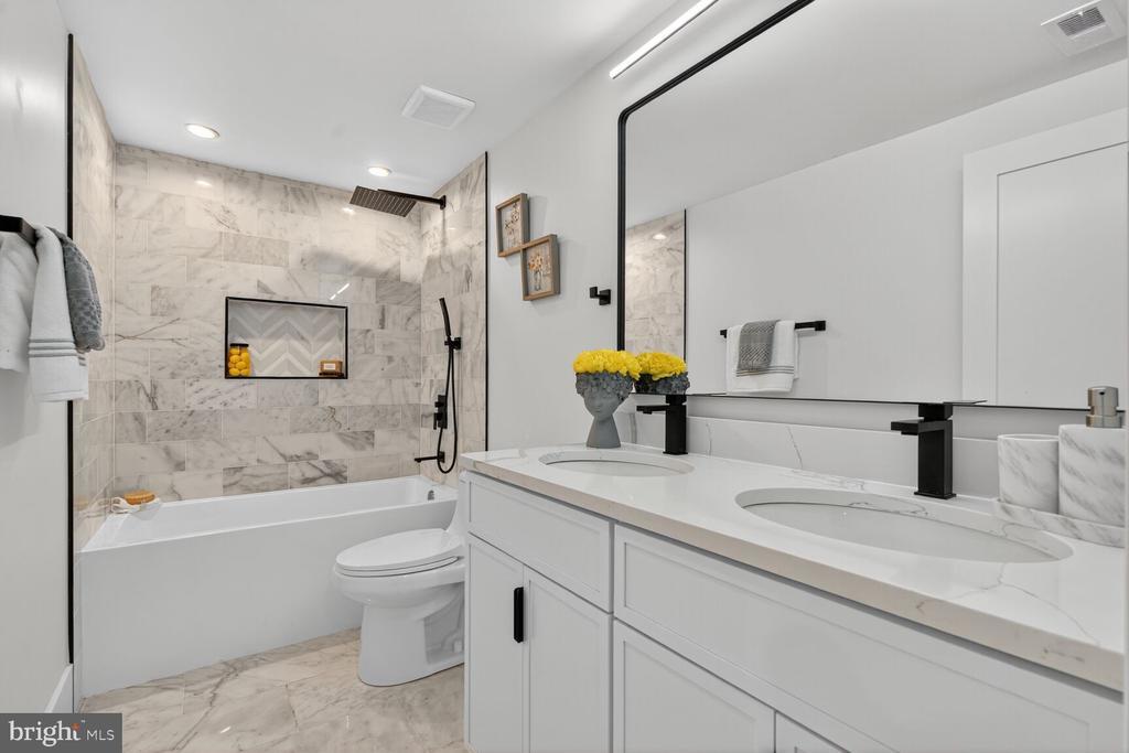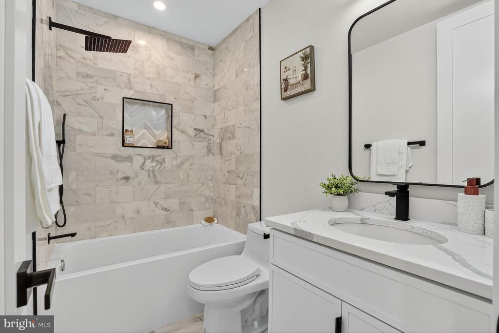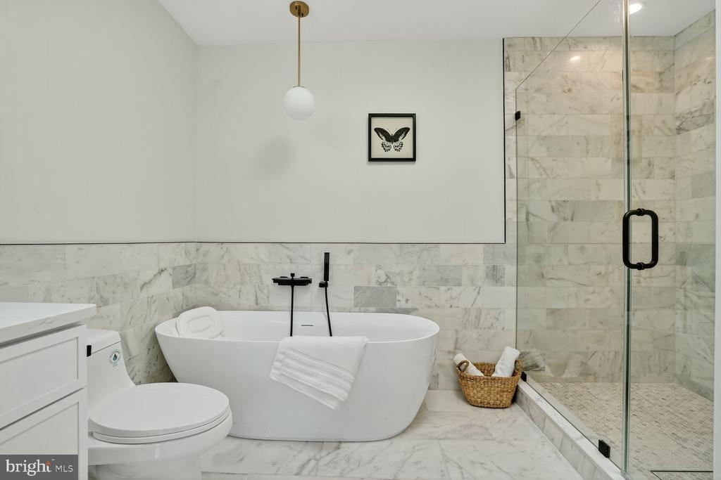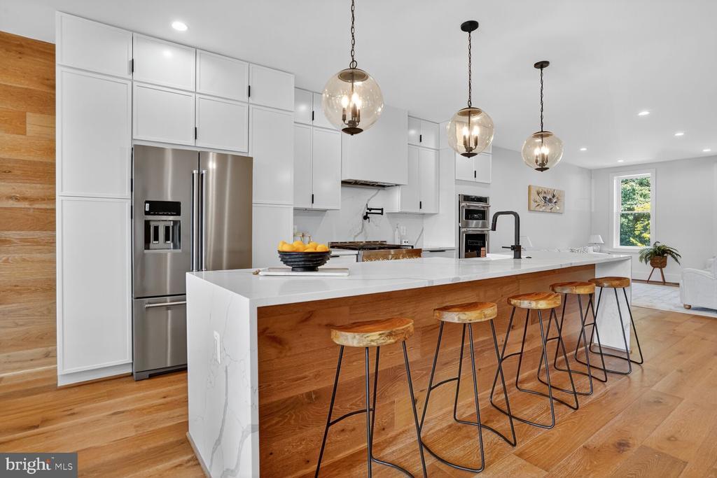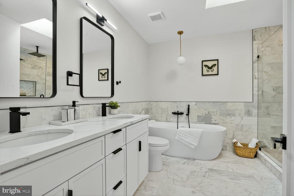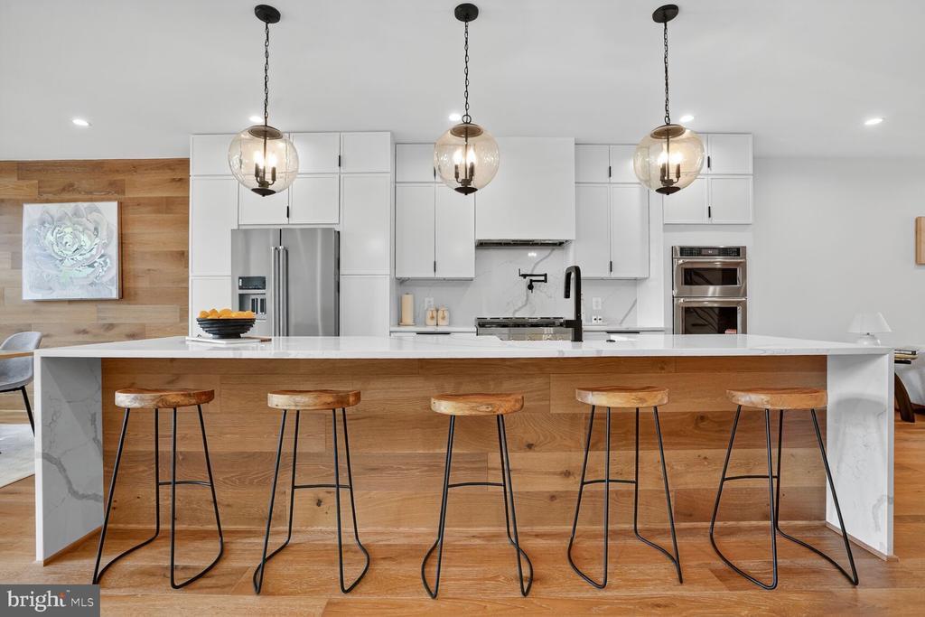 Our newest addition to the renovated canvas of Washington, this five-bedroom three-and-one half bath residence sits perched on the Northern end of 16th Street Heights. Once part of Maple Grove Farm, an 80-acre nursery that helped the green improvements of the National Mall, Capitol, and White House grounds this understated and impeccably designed home has every modern convenience, vast green spaces and subtle designer details that exceed expectations. The latest master piece built by prolific local builder Center Point Homes. This block of Longfellow Street is tree lined and bucolic, with large front porch Wardman homes. A front green space, dotted with evergreens and lower-level front entrance greet you as you ascend the concrete steps to the front porch. The six-panel windowed steel door with transom is the perfect blend of modern, hinting at the Architectural integrity of the open concept living beyond. Requisite rustic oak engineered flooring underfoot and so much more to take in; massive front windows, and an ample living room space. A fluted wood wall with built in coat hooks frames the front entrance. The modern kitchen boasts fixtures a gourmet chef would demand. Stainless Kitchenaide appliances with a built in 36- inch six burner range with accessible pot filler, ample storage in stacked ceiling height modern shaker cabinetry, and seating for six at the waterfall quartz stone island and a deep farmer’s sink. A wall oven and convection microwave make the space complete. An oversized dining space adjacent to the island features a wood panel wall for texture and a wine bar area with banquet space and whitewashed shiplap and custom shelving. French doors lead to the oversized Trex deck with privacy screens and custom metal railings. Ascend the modern stairs with down lit riser lighting and custom metal railings to the primary suite. You are welcomed to the space with oversized windows, nine-foot Cathedral ceilings, double closets with built in walk-in spaces and an ensuite spa bathroom. Double vanity sinks, frameless glass shower, pedestal soaking tub, a skylight and elegant timeless Carrera marble tile surround. The second and third bedrooms are serviced by an equally furnished hall bath with soaking tub. A full-size stackable washer and dryer complete the level. The lower level is a guest or nanny suite with rear and front entrances, bar area, recreation space, a full bath, and warm engineered flooring. A main bedroom, and additional bedroom or office space flanks the rear of the lower level with walk out access to the rear yard through a lower-level area way that serves as a second patio. The rear yard is a verdant green space with plat areas for entertainment or any gardening you may fancy. A two-car off street parking pad in zero maintenance poured concrete provides access to the paver alleyway. A commercial roll up garage door and electric vehicle charging port finish the space. All systems are new, plumbing, 200 AMP electrical service, and dual HVAC systems for true two zoned heating and cooling. All windows low E double Thermal Pane, and double hung. New cool white TPO roofs, and Trex decking installed. If you are looking for timeless elegance in a suburban/urban setting, with easy bus access to all of the Metropolitan area, this is the home you have been hoping would come along. Make this elegant part of history your home for a lifetime.
