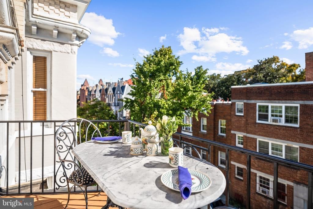 Very Special offering! Welcome to Riggs Place – Where Dupont’s historic elegance meets effortless modern living with PARKING & TWO private outdoor spaces. Tucked along one of Dupont’s most picturesque, tree-lined streets, this 3-bedroom, 2-bath residence blends timeless character with thoughtful updates and a rare sense of calm in the heart of the city. Soaring ceilings, exposed brick, and generous windows create a light-filled backdrop for everyday living. The main level unfolds with an open living and dining space anchored by a wood-burning fireplace and a newly lined stainless-steel chimney the perfect mix of warmth and sophistication. The fully renovated gourmet kitchen features custom cabinetry, stainless steel appliances, and stone counters that flow seamlessly into the dining area for effortless entertaining. Upstairs, the spacious primary suite offers a large walk-in closet (redone in 2022) and access to a Parisian-style balcony perched among the treetops, the ideal spot for morning coffee or evening wine. The second bedroom on this level showcases exposed brick, custom built-ins, and incredible light, while a beautifully redesigned bath completes the upper level. The screened-in porch, wrapped in windows and outfitted with a built-in cushioned bench, functions as an outdoor living room - a private retreat overlooking Dupont’s historic rooftops. A third bedroom or flex space on the main level provides added versatility for guests or a home office. Recent updates include a new A/C system (2020) and building-wide heating upgrade (2024), ensuring modern comfort behind the scenes. Additional highlights include private storage and dedicated parking just steps from your door. Life on Riggs feels residential and peaceful, yet you’re moments from the best of Dupont - The Phillips Collection, Dolcezza, Kramers, Dupont Farmers Market, and the hidden trails of Rock Creek Park are all just a short stroll away. Metro access is under five minutes, connecting you effortlessly to the rest of the city. This is classic Dupont architecture reimagined for modern life - refined, light-filled, and effortlessly livable.