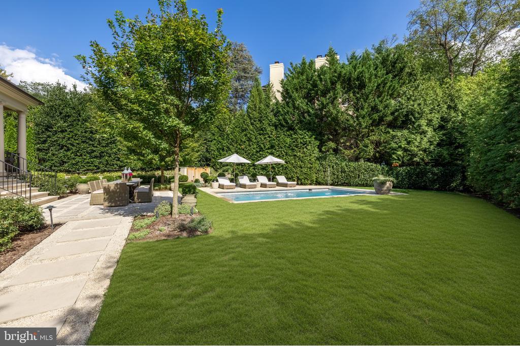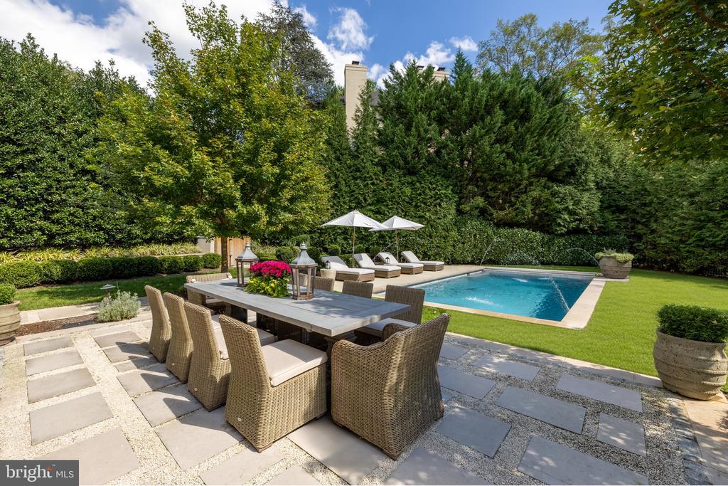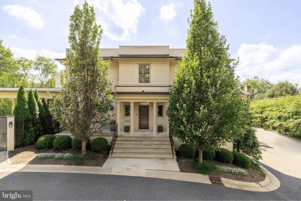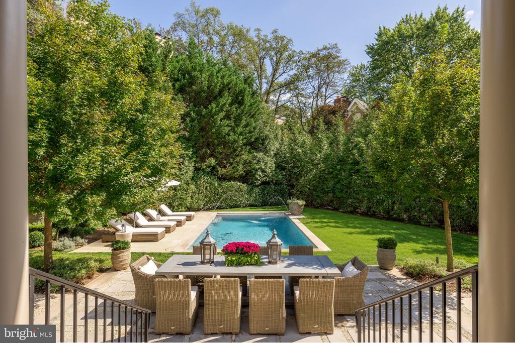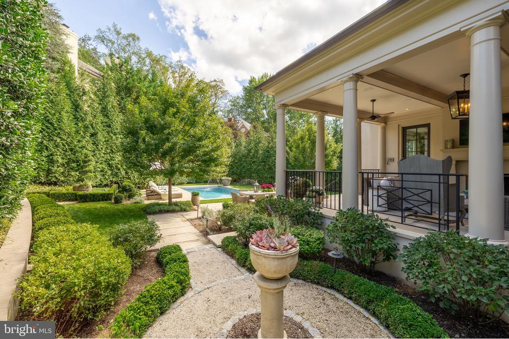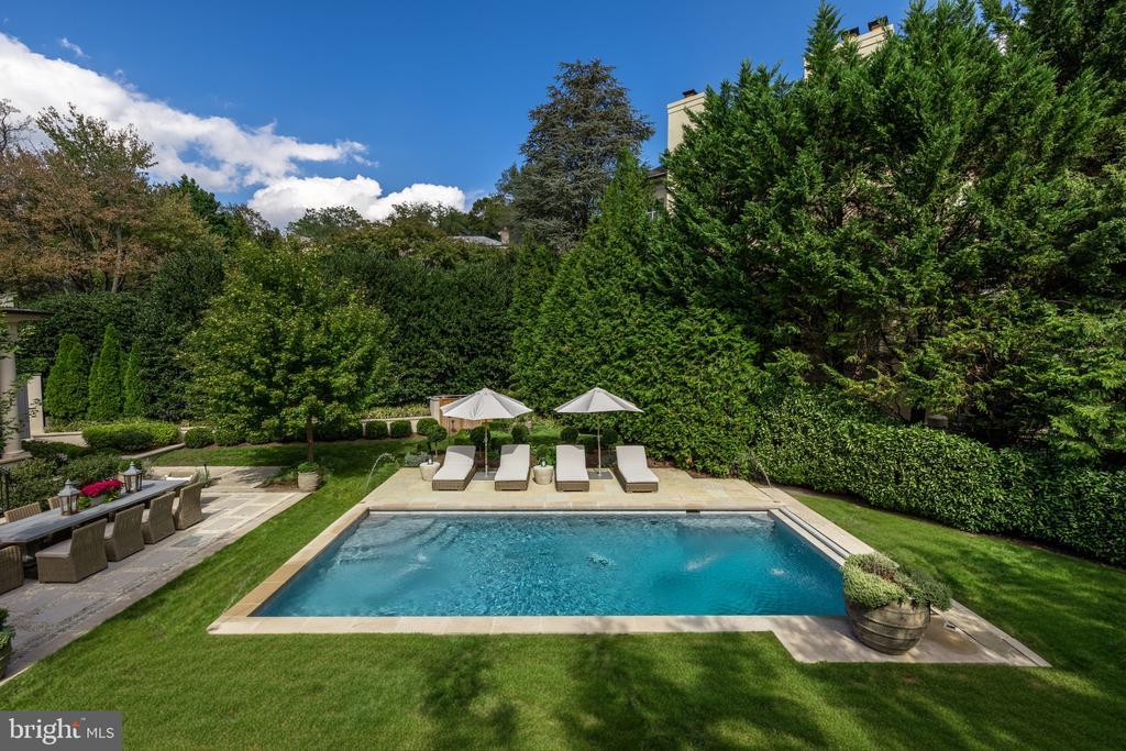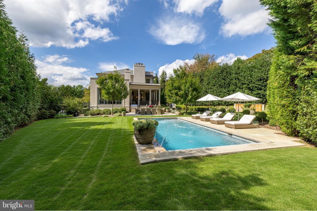 Nestled deep within a private enclave of distinguished residences just off Foxhall Road is 4849 Kemble Place, a custom Neo-Classic style residence designed by the award-winning architect, Anne Decker and beautifully constructed by Potomac Valley Builders. Situated on a stunning 0.37-acre lot within a private peninsula, the property transports you to another place and time. This stunning home is approached by a broad set of limestone steps that lead to a charming columned portico and oversized front door that functions as a beautiful design element. Inside, the foyer has open sightlines to the public rooms. The grand staircase showcases white oak risers matching that of the elegant herringbone floors, beautifully contrasted with a dark gloss handrail. Formal living and dining rooms flank the reception area in a classic center hall configuration. The former, with a large bay window set against a wooded backdrop, is connected to the dignified library via French doors. The latter opens onto a spectacular loggia set amidst whimsical surroundings, blurring the lines between indoor and outdoor living. Anchoring the main level’s informal wing is the chef’s kitchen. Evoking a sophisticated European ethos, accent pieces include a custom stainless steel hood flanked by open glass shelving, all set against a large slab Carrara marble backsplash. A La Cornue range, inset custom cabinetry, Miele dishwasher, Waterworks fixtures, paneled wine and refrigerator columns, and a hidden pantry complete the space, which is truly a functional work of art. An adjacent, light-filled breakfast area offers an additional casual dining area. The family room's fresh-take on rustic built-ins and ceiling beams complement its roaring limestone fireplace to create a sensation of warmth. The windowed wall at the end of the family room paints a stunning picture of the pool terrace beyond. The grand staircase is illuminated by a pair of gridded skylights overhead, flooding the central well with natural light. The sumptuous primary bedroom features a dedicated sitting area, ceiling-mounted retractable television, and tastefully integrated cove lighting. The marble-clad ensuite bath comprises intricate mosaic flooring, double vanities, a freestanding tub with views, and a separate walk-in glass shower. Secondary bedrooms are each generously proportioned, painstakingly detailed, and luxuriously served by intricately tiled baths. Designed for the entertainer, the lower level comprises a large recreation room. A private bedroom suite with direct walkout access, an ample laundry room, as well as a mudroom area accessing the attached two-car garage complete the level. Perhaps the true highlight of this home is its outdoor spaces. A blend of manicured landscaping and extensive hardscaping has resulted in a space shrouded in total privacy by a verdant canopy. The side entry gate leads directly into an English garden running parallel to the loggia, which steps down to a central al fresco dining patio with a grilling area. The pool, nestled beneath a shimmering arch of water jets, is equipped with an automatic cover and lounging area. An additional side yard is stepped down, featuring a full turfed sports court. Exquisitely finished both inside and out, convenient to Georgetown, Downtown, and major commuter routes, 4849 Kemble Place is an exemplary residence in one of DC’s most sought-after locations.