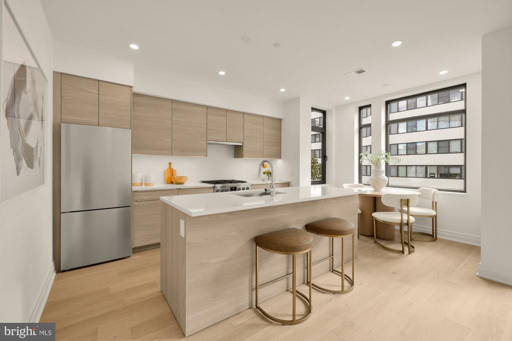 OPEN HOUSE: SUN, 11/2, from 12 PM - 2 PM. Welcome to The Verna – A Boutique Condominium in Logan Circle. The Verna is an exclusive collection of just 10 residences, designed for modern sophistication and timeless appeal. With only two homes per floor—one with eastern exposure at the front, the other with western exposure at the rear—residents enjoy both privacy and open, light-filled living spaces. This five-story building, with an elevator, offers thoughtfully designed 1BR and 2BR layouts, each showcasing refined craftsmanship and contemporary design. Inside every home, you’ll find: Custom Poggenpohl cabinetry; Caesarstone waterfall islands; Wide-plank white oak flooring throughout. At The Verna, elevated details meet everyday convenience in one of DC’s most vibrant neighborhoods. Just steps to Shaw, CityCenter, and within walking distance of five Metro stations, this is boutique city living at its best. Photos are of Model Unit 401 (a 2BR/2BA). Unit 101 is one of two 1BR/1BA residences. This front-facing home with eastern exposure overlooks 10th St. Unit 102 is the other 1BR, offering nearly 775 sq. ft. plus a private terrace. It's located at the rear of the building and enjoys western exposure.