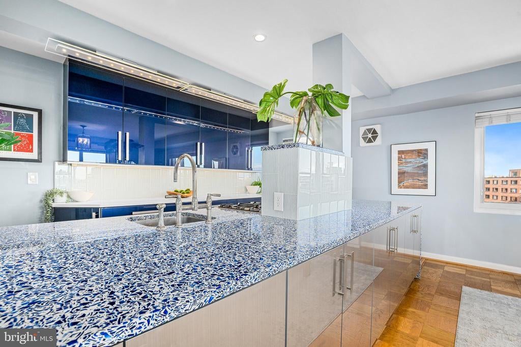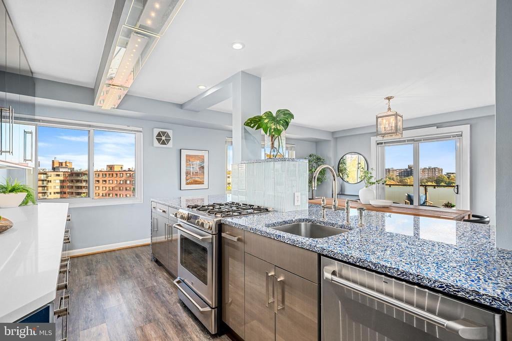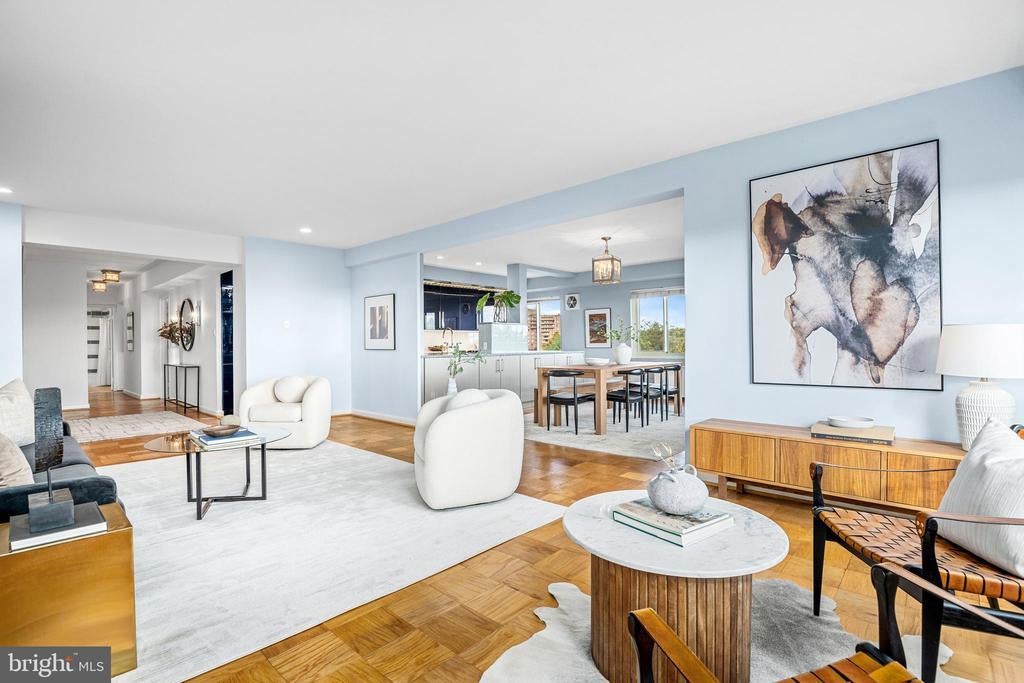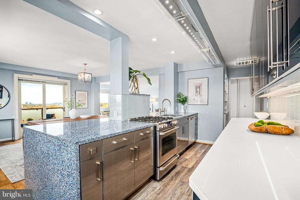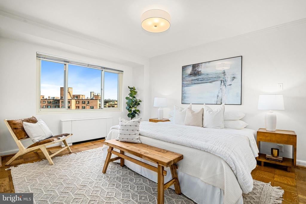 This exceptional three-bedroom, two-bath renovated residence in The Towers Condominium (West) offers a rare top-floor corner location with unobstructed views of Cathedral Avenue, the National Cathedral, and Wesley Heights. Upon entry, a spacious foyer with abundant closet space leads into a grand, light-filled living room perfect for entertaining. The kitchen was extensively renovated and opened into the dining area creating an airy open-concept layout complete with Kitchen Craft custom cabinetry, Vetrazzo recycled glass countertops, stainless steel appliances, LED lighting, and a large peninsula. Just off the dining area, a private balcony provides an ideal spot for a cup of coffee, sunset cocktails or alfresco dining. The home features three generously sized bedrooms each with large closets and two beautifully updated full bathrooms. The primary suite includes an en-suite bathroom with a walk-in shower while the second bathroom is accessed by the hallway and offers a tub. Each floor of the building has laundry and trash rooms as well as access to the service elevator. The Towers Condominium provides a full suite of amenities that include 24-hour front desk service, valet/taxi assistance, tennis courts, an outdoor swimming pool, a fitness studio, a library, a beauty salon, and direct access to Han Tower Market. Included in the sale is a separately deeded garage parking space located directly beneath the building on the B1 level. Utilities are included in the condo fee.