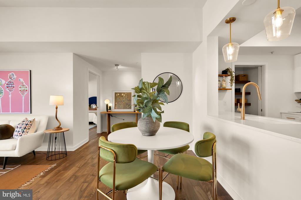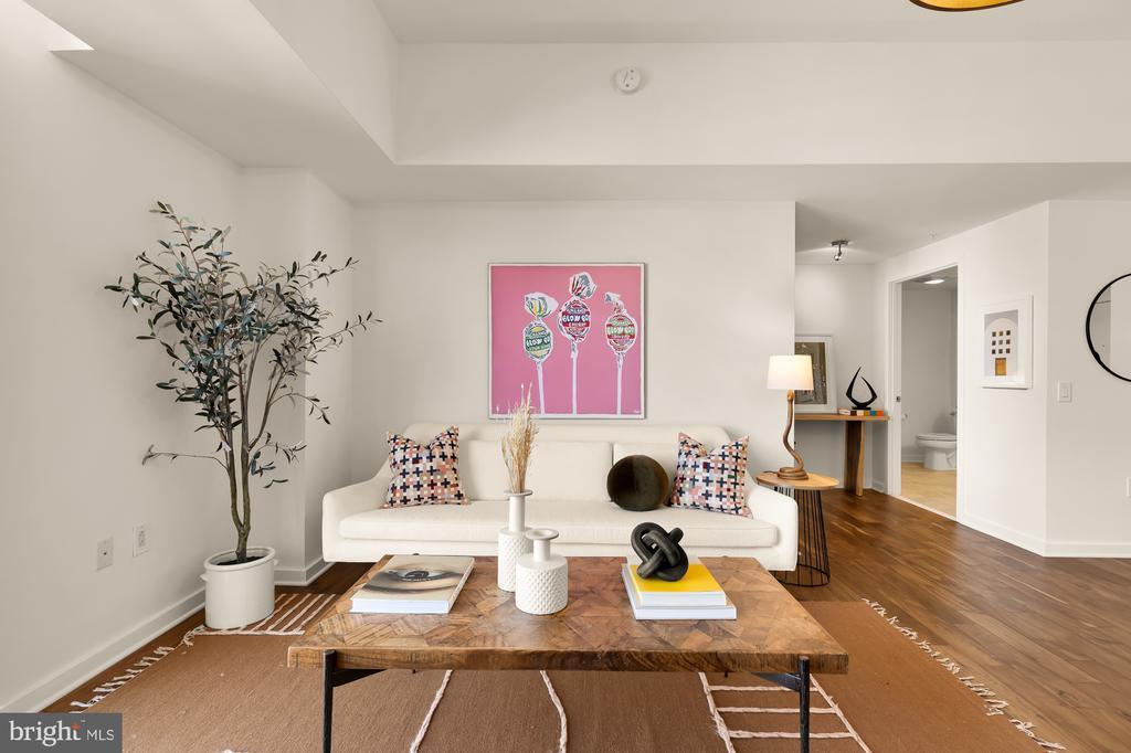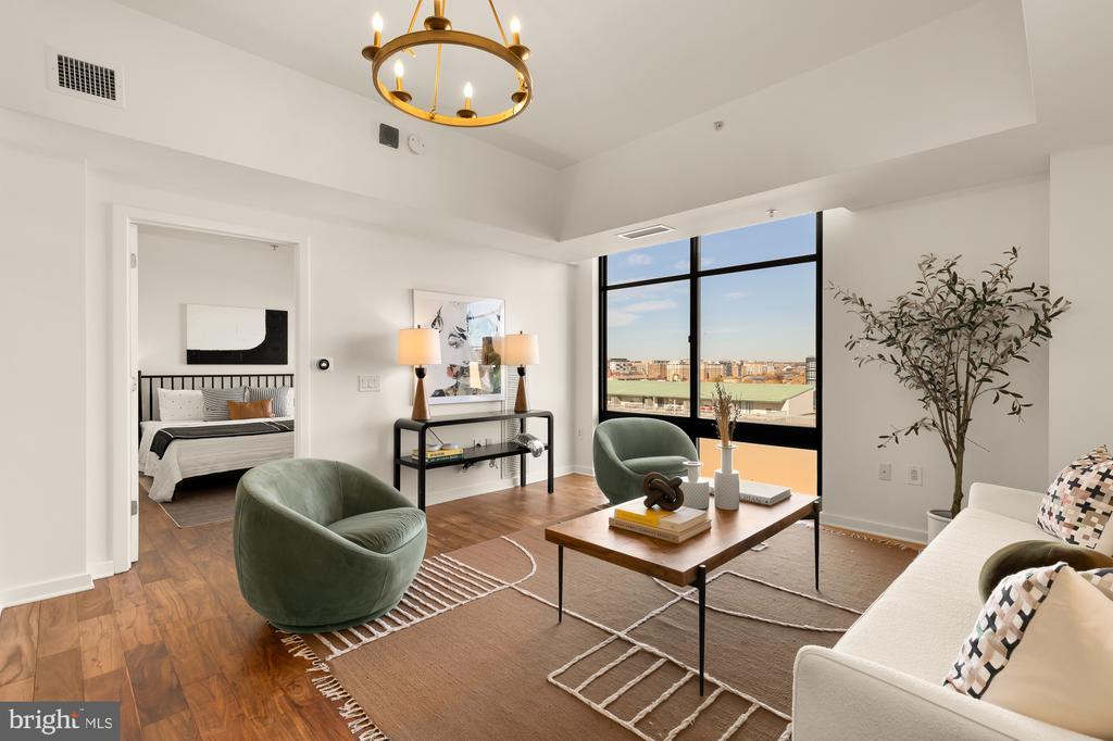 Experience elegant city living in this spacious two-bedroom, 2 bathroom condo with garage parking perched on the 11th floor of the premier K at City Vista. Designed for both comfort and style, this light-filled home features an open-concept layout, accented by beautiful hardwood floors. Step inside to a bright, airy home featuring an open-concept layout and beautiful hardwood floors throughout. The recently updated kitchen is equipped with Whirlpool stainless steel appliances, gas cooking, ample cabinetry, and a large pantry with a pocket door. The breakfast bar offers additional seating and seamlessly connects to the spacious living and dining area, where oversized windows overlook the peaceful courtyard below. Both bedrooms are generously sized with large windows and excellent closet space. The primary suite includes a full bathroom with a walk-in shower and a spacious linen closet. The second full bathroom features a tub/shower combo, ceramic tile flooring, a medicine cabinet, and plenty of extra storage. Additional highlights include in-unit laundry with a stackable washer and dryer, and a designated underground garage parking space. Residents of City Vista enjoy resort-style amenities, including front desk concierge, a rooftop deck and pool, library, community room, private 1-acre park, and secure garage parking. Situated in an unbeatable location, you’ll be just steps from Safeway, VIDA Fitness, Sweetgreen, Busboys and Poets, and more. With Gallery Place and Mt. Vernon Square Metro stations only three blocks away, commuting is effortless. This is urban luxury at its finest—don’t miss out!
