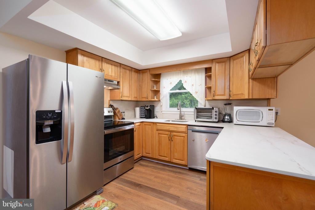 *MAJOR PRICE DROP* Nestled in the established and sought-after North Hills neighborhood in Brandywine, this beautifully updated split-level home seamlessly blends classic charm with modern enhancements. As you approach this stunning residence, you're immediately captivated by its professionally landscaped front yard. The vibrant flower beds, neatly trimmed hedges, and mature trees create a picturesque setting that enhances the home's curb appeal and sets the tone for the elegance within. A charming covered porch welcomes you into an open foyer adorned with tiled flooring. Inside, the expansive living room features large windows that flood the space with natural light, a custom stone fireplace, and recessed lighting, creating a warm and inviting atmosphere. Adjacent to the living room, the dining area leads to sliding doors that open to a beautifully landscaped backyard, perfect for outdoor gatherings. The eat-in kitchen boasts new granite countertops (2025), newer stainless steel appliances (2024), and ample cabinetry, combining functionality with modern style. A spacious family room with new carpet and recessed lighting offers additional space for relaxation. The first floor also includes an updated half bath with new fixtures and a large laundry room for added convenience. Upstairs, five generously sized bedrooms provide ample closet space, with the primary suite featuring double closets and a full bath with a marble shower and tiled floors. A walk-up attic offers abundant storage options. The hallway bathroom has been updated with a new shower, vanity, toilet, and sink. The backyard is enhanced by a , new retaining wall (2021), creating an ideal space for gardening enthusiasts. Additional features include fresh paint throughout, new luxury vinyl plank flooring, a new furnace, new AC unit, new hot water heater (2025), new garage doors (2025), a two-car garage, and a spacious driveway. This move-in-ready home is being sold AS-IS, offering a rare opportunity to own a beautifully maintained property in a highly desirable location.