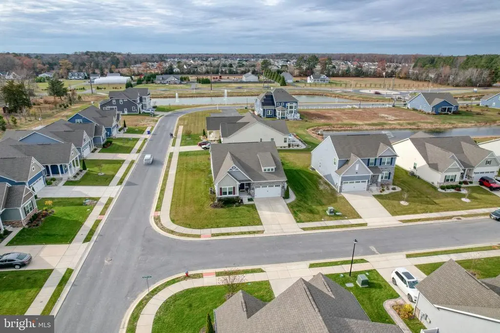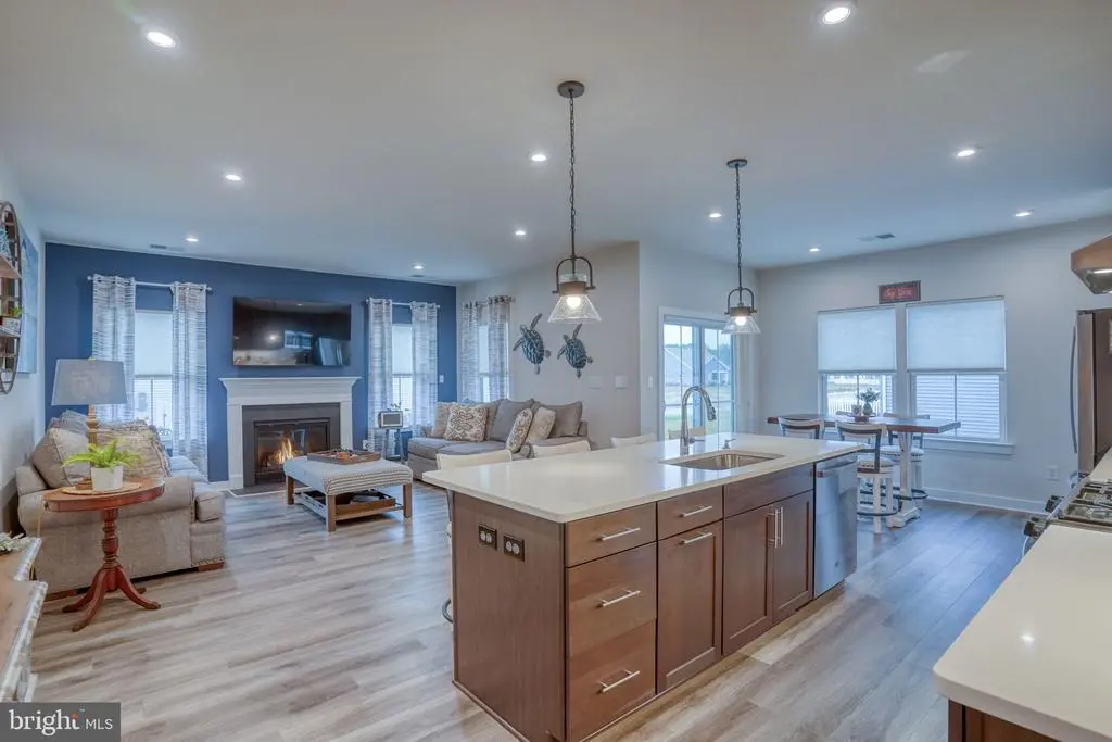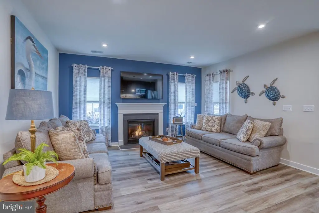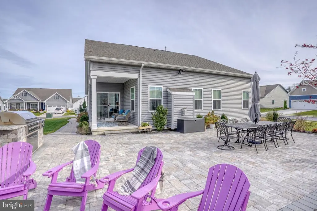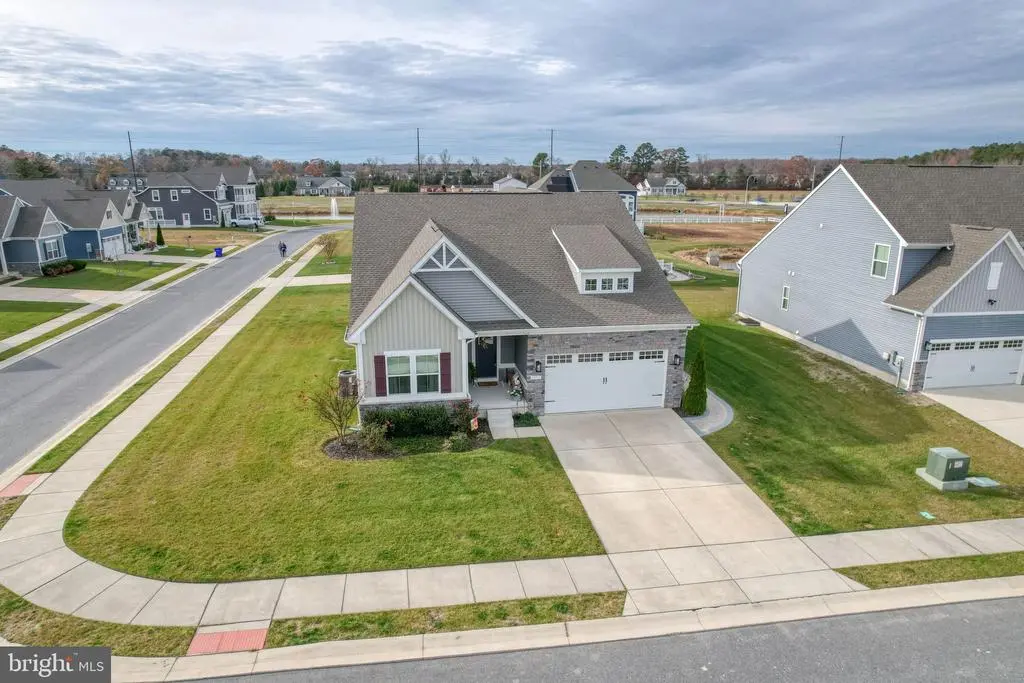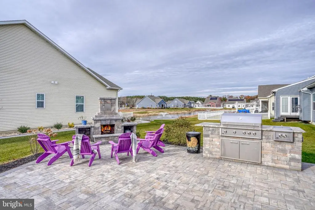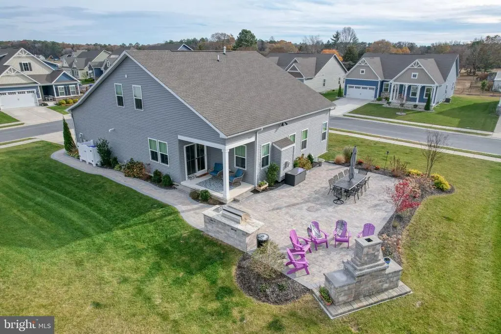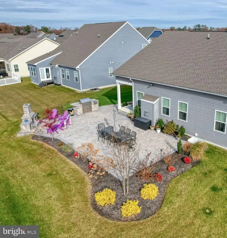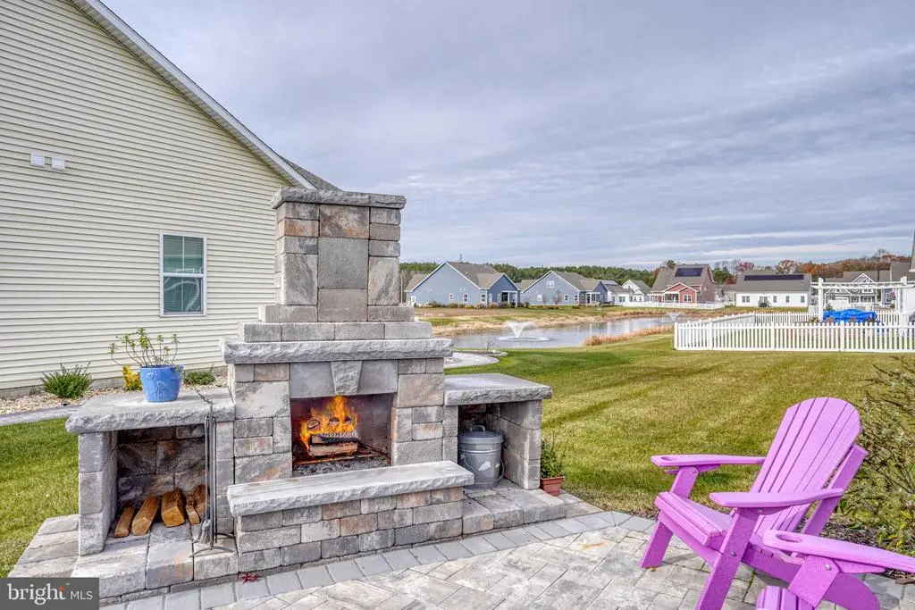 Discover this beautifully upgraded Bramante 2-story model in the sought-after community of Anchors Run, located in the Cape Henlopen School District. This nearly new (2022), 3-bedroom, 3 full bath home offers over 2,300 square feet of thoughtfully designed living space, including a dedicated office/flex room, and is filled with upgraded finishes and custom touches throughout. The entryway greets you with beautiful custom woodworking, setting the tone for the craftsmanship found throughout the home. Step inside to an inviting open floor plan featuring 10-foot ceilings, engineered hardwood flooring, upgraded interior lighting package, and a bright great room anchored by a gas fireplace. The kitchen is beautifully appointed with stainless steel GE Profile appliances, a pantry, gas range cooking, quartz countertops, subway tile backsplash, and an island with bar seating. The spacious breakfast area opens to the covered rear porch — perfect for morning coffee or evening relaxation. The privately situated primary suite includes an oversized walk-in closet, double vanity, and a large tiled shower. A first-floor guest bedroom and full bath are tucked away for comfort and privacy, while the flex room offers the ideal home office or additional guest space. Upstairs, a generous loft provides extra living space, along with another guest bedroom featuring a walk-in closet and full bath. An additional walk-in attic storage room completes the second level. Outside, enjoy a beautifully landscaped yard with pond views and an impressive hardscape patio equipped with a wood burning fireplace, wood storage, built-in grill, and pavilion ready foundation — perfect for entertaining year-round. Anchors Run offers spring-fed ponds, walking paths, a clubhouse, outdoor pool with splash zone, fitness center, and future pickleball courts — offering residents a truly low-maintenance lifestyle with exceptional amenities. Low HOA fees include lawn maintenance and a community irrigation system for owners, resulting in no added water costs. Delaware Electric Co-Op and natural gas help keep utility costs low. Skip the wait for new construction! Move right in and enjoy the peace of mind of a transferable 10-year structural warranty. Located just minutes from Lewes Beach, Cape Henlopen State Park, Rehoboth Boardwalk and the vibrant dining and shopping of downtown Lewes and Rehoboth, this home delivers the finest in coastal living.