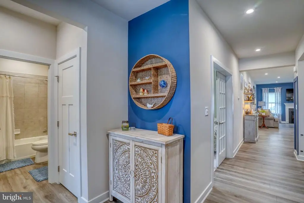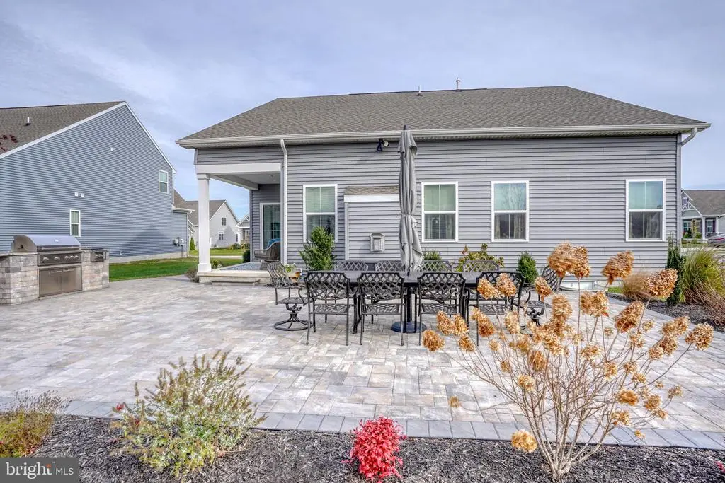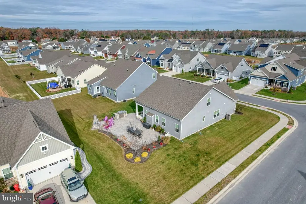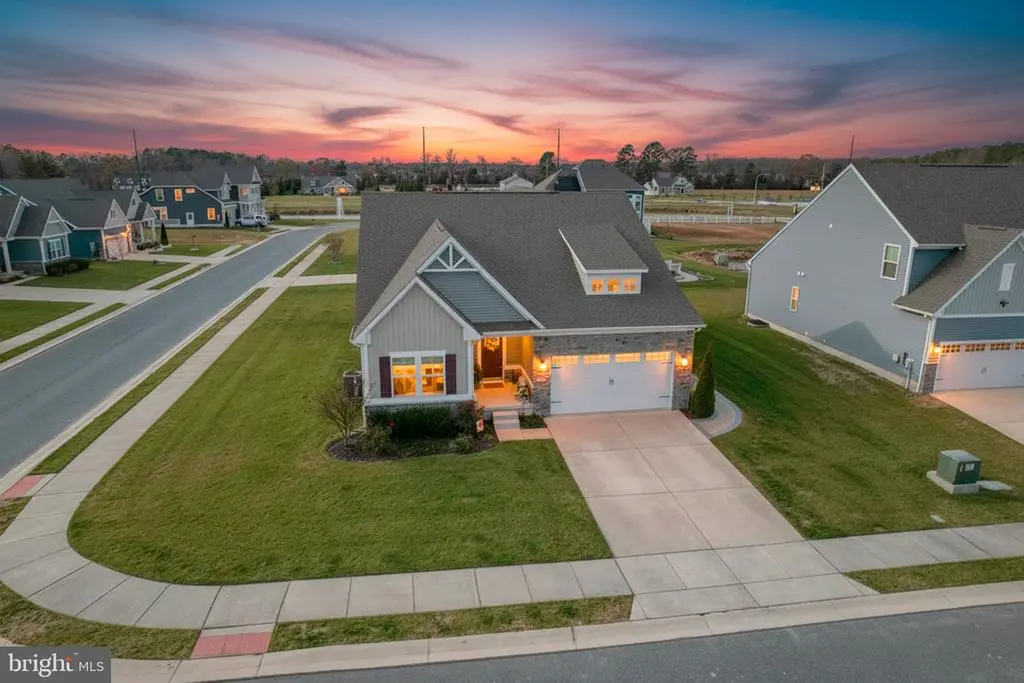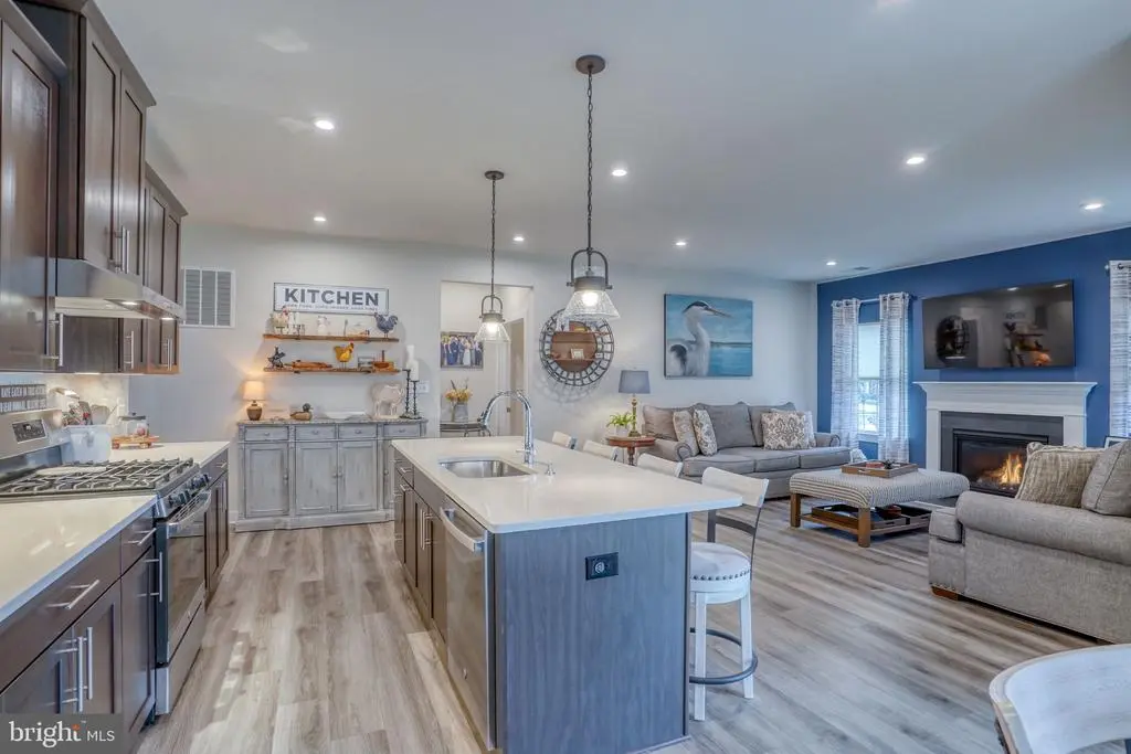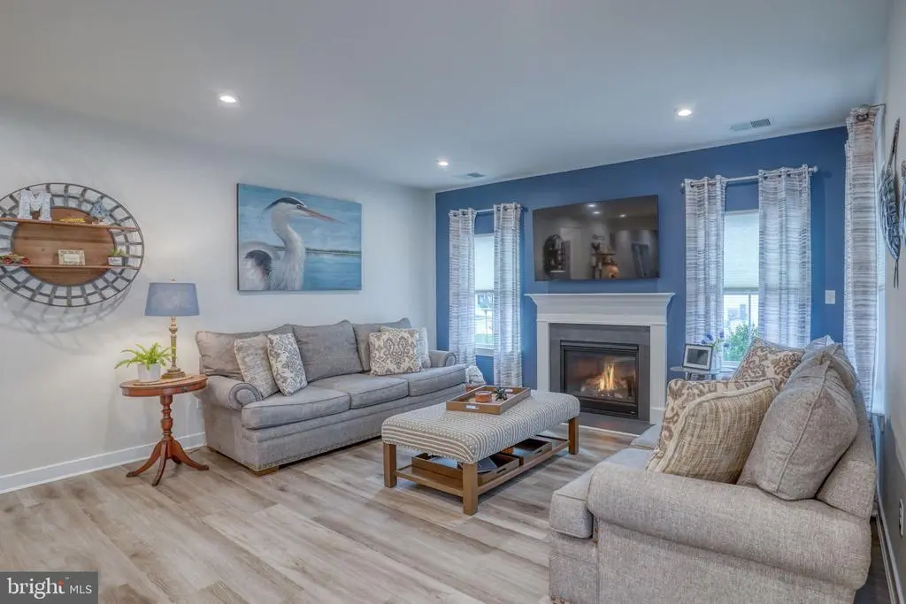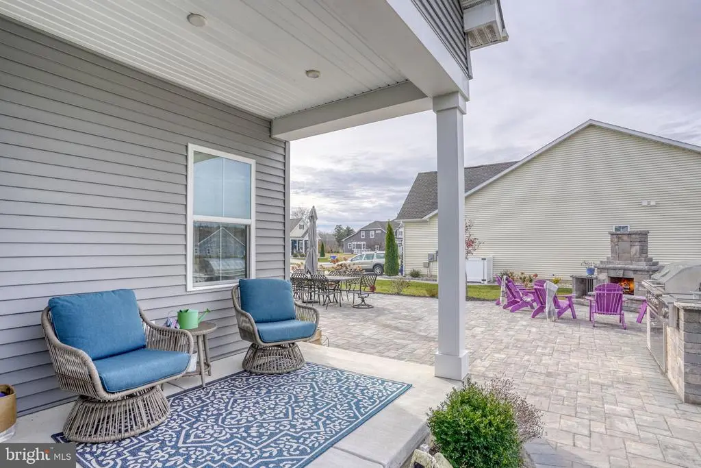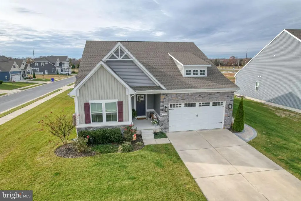 Discover this beautifully upgraded Bramante 2-story model in the sought-after community of Anchors Run, located in the Cape Henlopen School District. This nearly new (2022), 3-bedroom, 3 full bath home offers over 2,300 square feet of thoughtfully designed living space, including a dedicated office/flex room, and is filled with upgraded finishes and custom touches throughout. The entryway greets you with beautiful custom woodworking, setting the tone for the craftsmanship found throughout the home. Step inside to an inviting open floor plan featuring 10-foot ceilings, engineered hardwood flooring, upgraded interior lighting package, and a bright great room anchored by a gas fireplace. The kitchen is beautifully appointed with stainless steel GE Profile appliances, a pantry, gas range cooking, quartz countertops, subway tile backsplash, and an island with bar seating. The spacious breakfast area opens to the covered rear porch — perfect for morning coffee or evening relaxation. The privately situated primary suite includes an oversized walk-in closet, double vanity, and a large tiled shower. A first-floor guest bedroom and full bath are tucked away for comfort and privacy, while the flex room offers the ideal home office or additional guest space. Upstairs, a generous loft provides extra living space, along with another guest bedroom featuring a walk-in closet and full bath. An additional walk-in attic storage room completes the second level. Outside, enjoy a beautifully landscaped yard with pond views and an impressive hardscape patio equipped with a wood burning fireplace, wood storage, built-in grill, and pavilion ready foundation — perfect for entertaining year-round. Anchors Run offers spring-fed ponds, walking paths, a clubhouse, outdoor pool with splash zone, fitness center, and future pickleball courts — offering residents a truly low-maintenance lifestyle with exceptional amenities. Low HOA fees include lawn maintenance and a community irrigation system for owners, resulting in no added water costs. Delaware Electric Co-Op and natural gas help keep utility costs low. Skip the wait for new construction! Move right in and enjoy the peace of mind of a transferable 10-year structural warranty. Located just minutes from Lewes Beach, Cape Henlopen State Park, Rehoboth Boardwalk and the vibrant dining and shopping of downtown Lewes and Rehoboth, this home delivers the finest in coastal living.