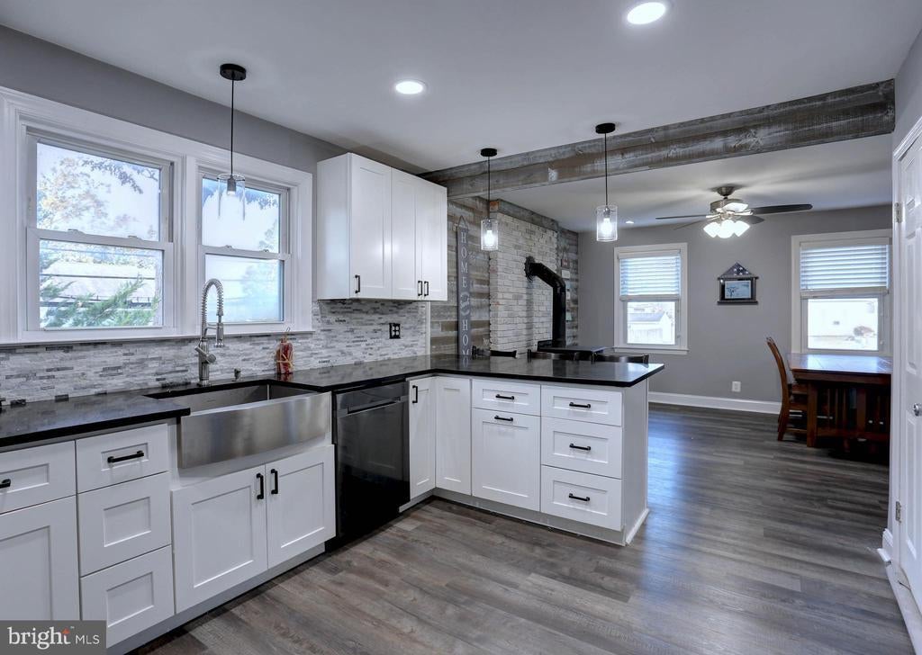 Welcome to this stunning, completely updated and renovated 4 Bedroom, 2 Bath Cape Cod, perfectly blending classic charm with modern living. Step inside to an inviting open concept floor plan featuring beautiful new LVP flooring that flows seamlessly throughout the main level. The heart of the home is the brand new kitchen, a chef's delight boasting sleek finishes and a large peninsula counter with convenient seating—perfect for casual dining and entertaining. The spacious living/dining room combo is anchored by a cozy wood stove, creating a warm and inviting ambiance for gatherings. Both bathrooms have been newly renovated with contemporary fixtures and finishes. The space and possibilities continue in the finished lower level, which features a large family room area, ideal for movie nights or recreation. It also includes a dedicated large office space, making working from home a breeze, and a functional kitchen/bar area for effortless entertaining. A full second bath completes the basement level. Upstairs, you'll find a large open area that offers flexible use—maybe reading nook, play space, or secondary office—along with the fourth bedroom. Set on a large lot, the exterior is just as appealing, offering plenty of outdoor space and a charming covered side porch for relaxing. A convenient walk-out basement provides easy access to the backyard. This move-in ready home is a must-see!