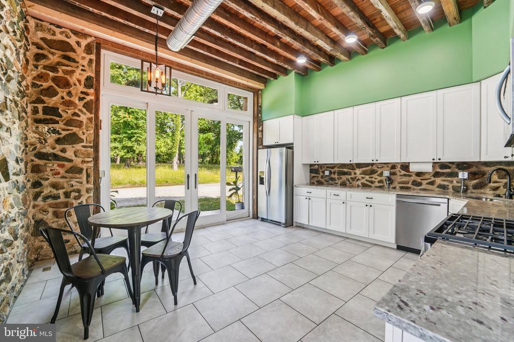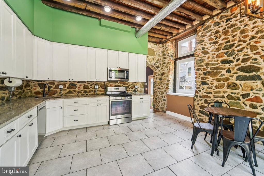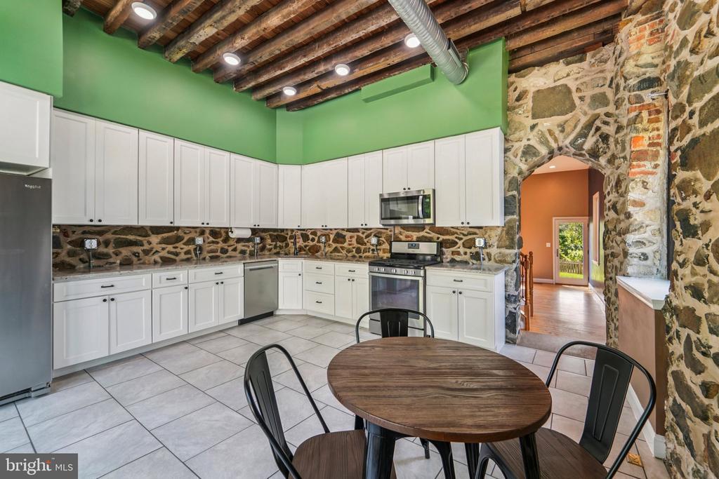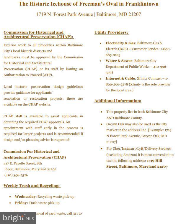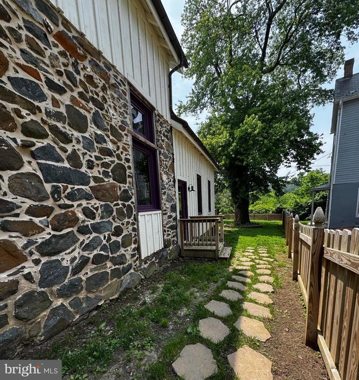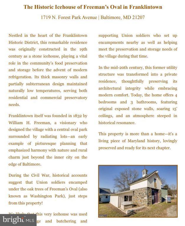 Utterly Unique 19th Century Two-Story in Franklintown Historic District! Originally Built as an Ice House and Converted to a Residence, this Home exudes Character in every room! Enter through Glass Double Doors to Updated Kitchen & Dining Room. Kitchen features Crisp White Casework, Granite Counters, Stainless Appliances, Ceramic Tile, and Original Stonework Backsplash. Airy & Bright Living Room with Hardwood Floors & Built In Bookcase. Two Large Bedrooms and Updated Full Hall Bath Complete the Main Level. Upper Level Loft Bedroom with Vaulted, Original Exposed Timbered Ceiling and Walk-In Closet, and Updated Full Bath. Lower Level Primary Suite, with Dual Walk-In Closets and Huge Updated Bath with Dual Vanity, Jetted Tub, Large Walk-In Shower and Private Water Closet with Sink. Basement features Storage and the Original Ice Room – a Two Story, Totally Stonework Vault with Countless Interesting Possibilities! Large, Level, Fully Fenced Rear Yard. All Mechanics (Windows, Roof, HWH, HVAC) Believed to be Replaced with 2018 Renovation. Easy access to I-70 and 695 – only .6m to Security Park & Ride and .8m to Gwynns Falls Trailhead. VA Assumable loan with apx $135K balance at 2.25% - buyer must use own eligibility - 2nd loan potential for gap with 5% minimum down payment. Parking detail is available in documents.