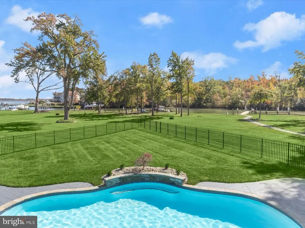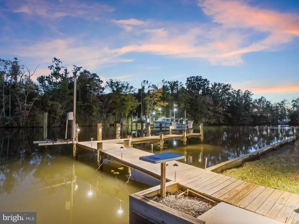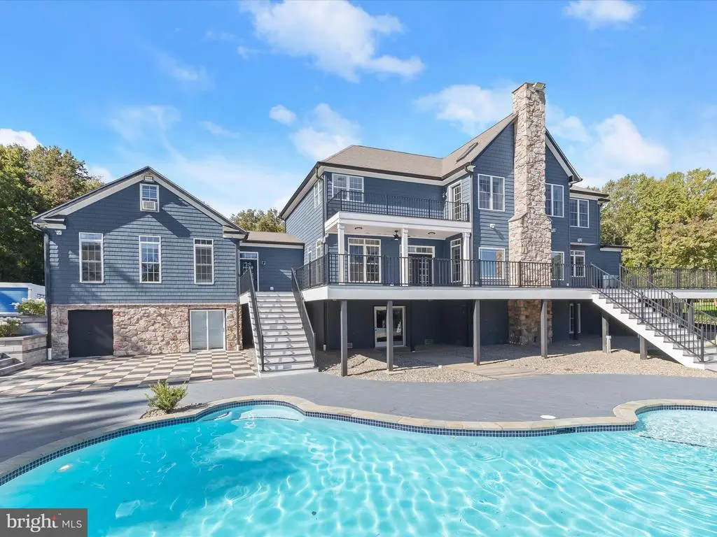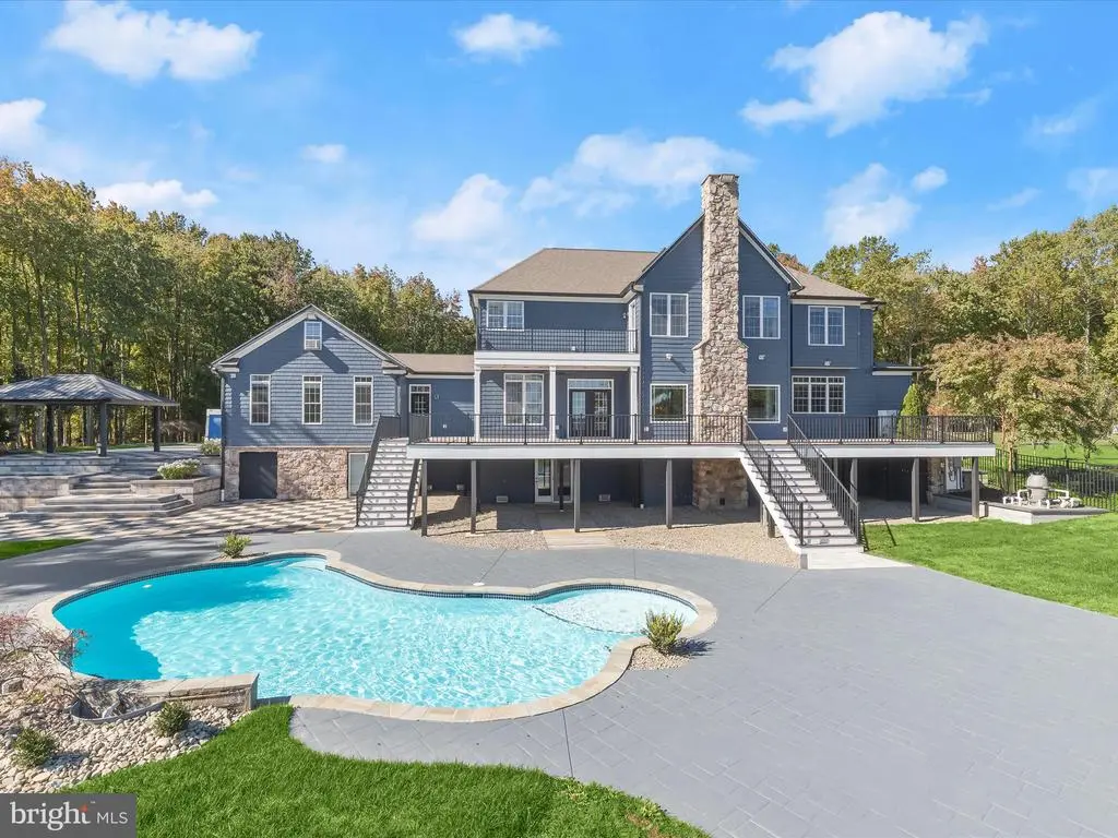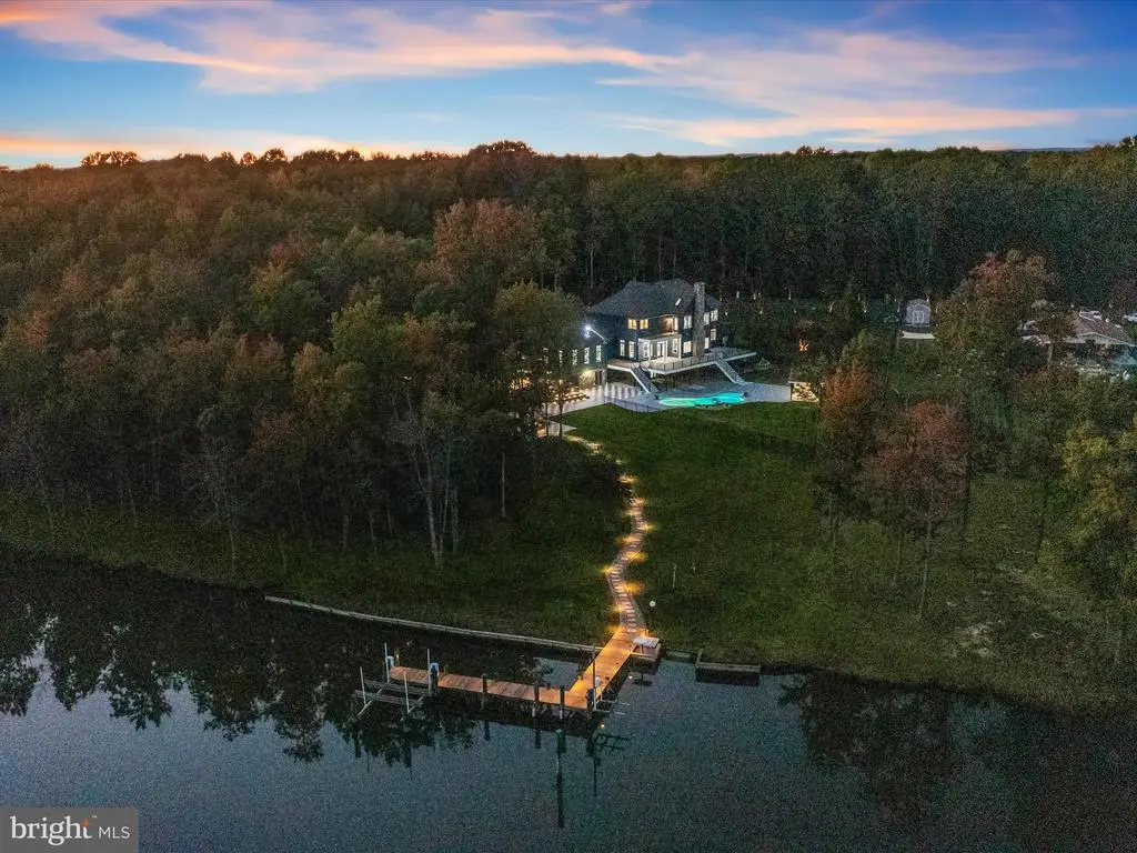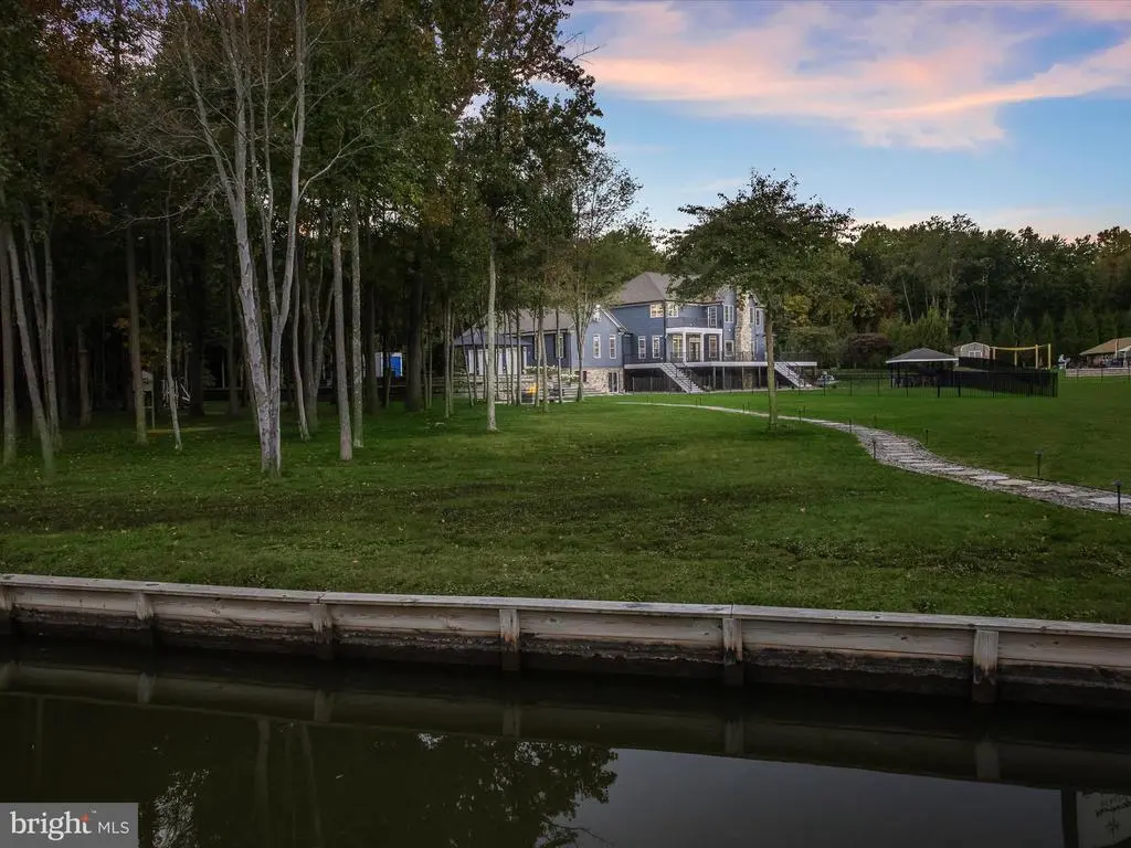 Welcome to your private waterfront retreat, an extraordinary estate set on over 20 acres of beautifully landscaped grounds and over 800 feet of waterfront, offering a harmonious blend of elegance, comfort, and resort-style living. Mature trees frame the property’s serene setting, complete with water access, a private dock with two boat slips, a 10,000 lb lift, a jetski lift, and captivating outdoor amenities, including a custom pavilion, a goldfish pond, a patio, a circular driveway with two electric charging stations, and a fire pit. The in-ground pool features a waterfall and a covered patio with electric outlets, creating an entertainer’s paradise perfect for gatherings of all sizes. The inviting semi-wraparound porch leads into a grand foyer adorned with heated porcelain tile flooring that continues throughout the main level, with individual climate controls for personalized comfort. The living room impresses with soaring ceilings, crown molding, recessed lighting, and a granite-surround wood-burning fireplace that frames spectacular panoramic views. The formal dining area exudes sophistication with box wainscoting, medallion ceiling accents, brass fixtures, and access to the expansive new composite deck. A chef’s kitchen stands at the heart of the home, equipped with industrial-grade Monogram stainless steel appliances, double ovens, a center island with breakfast bar, custom 42” cabinetry, granite counters, and soft-close drawers, all complemented by a convenient mudroom. The guest wing offers privacy and comfort with a full bath, a bedroom with a walk-in closet, and access to an oversized three-car garage with a loft for storage or recreation. The family/game room offers the ultimate leisure space, featuring a billiards area, a wet bar with a beverage cooler and ice machine, crown molding, soaring ceilings, a powder room, surround sound, and direct access to the front porch. The primary suite is a true sanctuary featuring a cathedral ceiling, stone gas fireplace, skylights, heated porcelain tile flooring, double walk-in closets, an electric fireplace, a private balcony, and a spa-inspired en suite with dual vanities, lighted mirrors, a soaking tub with scenic views, and a steam shower with triple shower heads. Three additional bedroom suites each offer their own charm with walk-in closets, custom built-ins, and designer finishes. The fully finished lower level expands the living space with a private wine room, a large recreation area with a stone wall fireplace, a kitchenette with a breakfast bar and a built-in microwave, a full bath, a bedroom, and a second laundry area. An additional bedroom suite features luxury flooring, a custom walk-in closet, and a breathtaking en suite with a freestanding tub, walk-in shower, hexagon tile accents, and a double vanity with illuminated mirrors. A rare combination of craftsmanship, privacy, and luxury, this exceptional property offers a lifestyle beyond compare, with easy access to major commuter routes, including I-695 and I-95. Updates: New Composite Deck 2025, Extensive Hardscape with pond, retaining walls, and spill overs 2023, New Driveway with Landscaping and lights 2021, 2-Car Charging Stations 2021, Exterior House painted 2025, Radiant Tile flooring throughout with independent controls 2021, New gutter system 2024, Water Filtration system 2021, House generator 2023, Loft above the garage 2023, New Primary bath with steam shower and fireplace 2022, New secondary bath 2023, Updated lower-level bath 2022, Upstairs Laundry room 2022, Lower Level Laundry room 2022, New Kitchen refrigerator