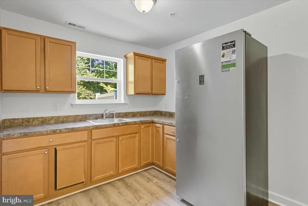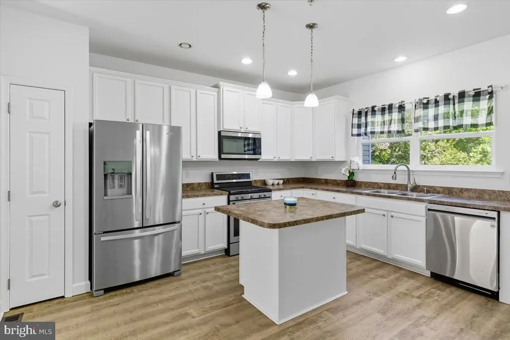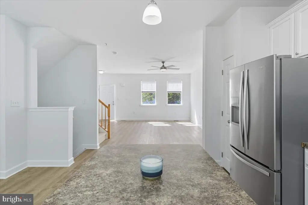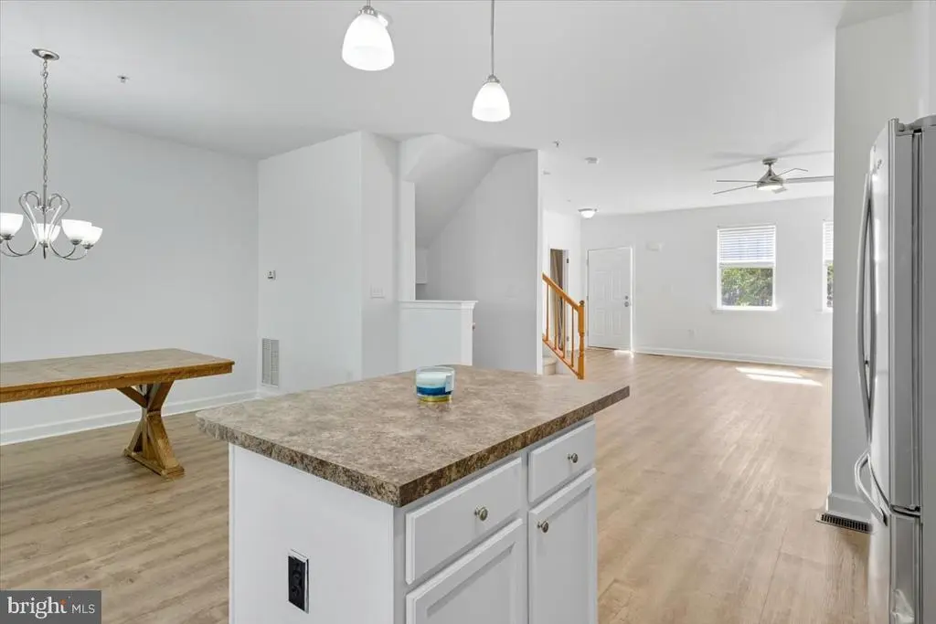 This townhome in the heart of Prince Frederick features an open floor plan on the main level, 3 bedrooms upstairs, and a finished basement with an additional bedroom, exterior entry, and attached kitchenette. The property has been freshly painted from top to bottom with new carpeting on the steps and LVP flooring on all three levels. The property also features a rear patio area with sliding door access to the basement, and a main level deck, accessed through a sliding glass door in the dining area. The lower level offers a variety of uses and offers the possibility of sharing space with long-term visitors. There is a door providing separation from the common spaces on the main level, a full bathroom on the lower level, and a kitchenette area with full-size refrigerator. The primary suite features cathedral ceilings, two walk-in closets, and a spacious en-suite bathroom. There is an additional full bathroom with shower and tub in the upstairs hall, convenient to the two additional bedrooms. The property offers easy access to all the conveniences of Prince Frederick: a five minute walk will get you to Main Street, and a five minute drive will bring you to restaurants, cafes, shopping, grocery stores, parks, and wooded trails. Commuting to DC or other metro areas? The park and ride for commuter buses is less than a five minute walk from the front door.