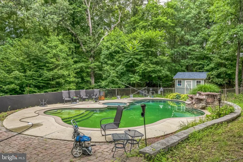 This impressive brick-fronted colonial home spans 6,398 square feet, featuring 7 bedrooms and 5 bathrooms on a 3.4-acre lot bordering a forest with a creek. Highlights include a private in-ground pool with spa, and recent upgrades, including a dual-zone heating and air conditioning system by Goodman in November 2023, all 53 windows were replaced in 2019 with double-hung Power Windows, many on the westerly side are tinted for energy efficiency. The roof was upgraded with architectural shingles in 2017. The grand foyer welcomes you with two-story ceilings and a wrought iron and hardwood staircase. The main level showcases Brazilian cherry hardwood floors and includes an office/study, access to the oversized 3-car garage, and a full bathroom. The semi-open concept living area combines a living room, dining room, and two sunrooms with vaulted ceilings. The gourmet kitchen boasts granite countertops, a Viking gas double oven, and an expansive island. The cozy sunken family room features a wood-burning fireplace. Two stairways lead to the second floor. Here you’ll find five bedrooms and three full bathrooms. The primary suite includes tray ceilings, a walk-in closet, and an ensuite with a soaking tub, oversized step-in shower, WC, and two vanities. A second primary bedroom with large walk-in closet has its own ensuite bathroom along with two built-in shelves that cleverly conceal attic storage spaces. The remaining 3 bedrooms share a full bathroom with a solar tube. A laundry room with sink, counter, and cabinets is also located on this level. The basement features an open floor plan with a recreation room, kitchenette area with wet bar, mini fridge, columns, dining area, waterproof LVP flooring, and a sunken living area. The movie theater with surround sound and arena-style seating is a big win. There are two additional bedrooms - one that can be your exercise room/office/hobby room and one with built-in cabinetry that could also double as office/hobby room. There is a room for storing wine with mini fridge, two more storage rooms, and a full bathroom with a 2nd laundry area. Outside, enjoy expansive decks, a paver patio, and a paver trail leading to a state-of-the-art private pool and spa with a waterfall for added ambiance. The heated pool is equipped with a built-in anti-freeze system. Truly, this pool area is a tranquil place. The property also includes two owned 500-gallon propane tanks: one for the home and backup generator, and another dedicated to the pool. A shed near the pool was added around 2020.