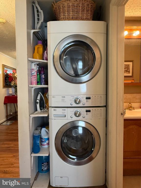 Dishwasher, Disposal, Dryer - Electric, Dryer-front loading, Exhaust Fan, Oven-Self Cleaning, Oven/Range-Electric, Range hood, Refrigerator, Washer/Dryer Stacked, Water Heater