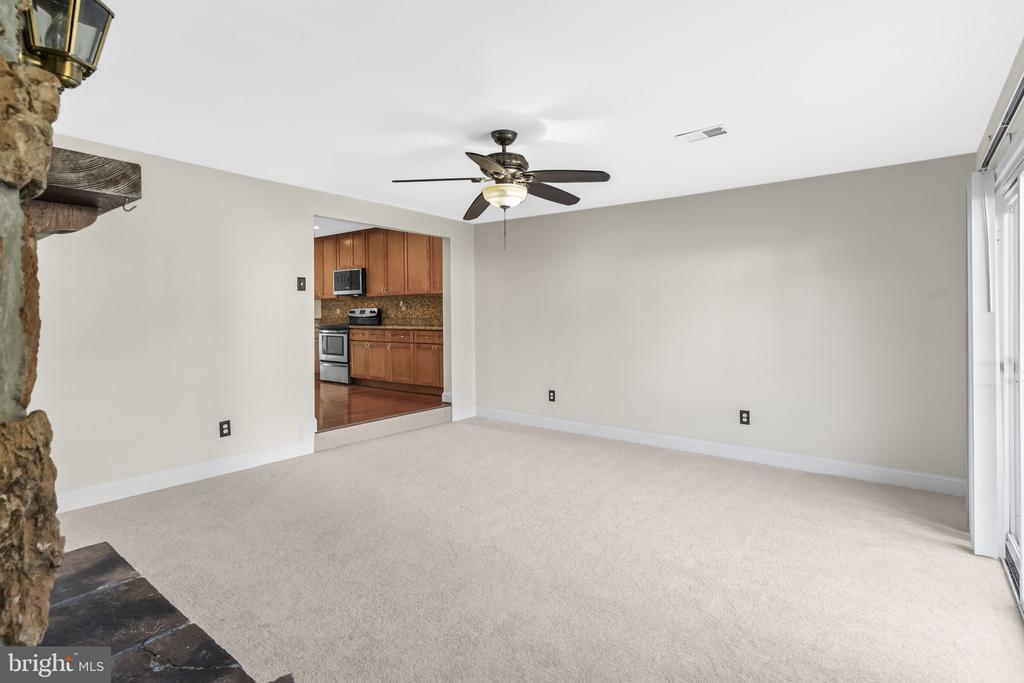 Unique 2 level townhome with huge FAMILY ROOM ADDITION on back and beautiful updates throughout! Freshly painted interior. New carpeting. Step into a bright home with hardwood floors in the foyer, kitchen, and dining room, a sunken living room with bay window, recessed lights, and ceiling fan. The updated kitchen offers granite countertops, tile backsplash, 42” maple cabinets, and stainless-steel appliances. Enjoy the large family room addition with a stunning floor-to-ceiling stone wood-burning fireplace, oak mantle, and sliding glass doors leading to the deck and fenced backyard with six-foot privacy fence—perfect for relaxing or entertaining. Upstairs features three comfortable bedrooms, including a primary suite with walk-in closet and ceiling fan, plus an updated full bath with tile surround. Additional highlights include updated double-pane windows, half bath on the main level, and a convenient laundry area with full-size washer and dryer. A wonderful home offering comfort, space, and warmth!