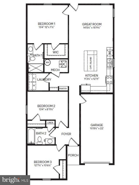 Welcome to 113 Parkland Road, a new home under-construction in Kinnamon Meadows in Greensboro, MD. The Sullivan is a charming 1,219-square-foot, cottage-style ranch home featuring three bedrooms, two bathrooms, and a one-car garage. Just off the foyer, two spacious guest bedrooms and a shared full bathroom offer comfort and privacy for family or visitors. The open-concept kitchen boasts stainless steel appliances, crisp white cabinetry, and granite countertops perfect for casual meals or entertaining. Across from the kitchen, a tucked-away hallway leads to the pantry, a convenient coat closet, and the laundry room, keeping everyday essentials neatly organized. The kitchen flows seamlessly into the dining area and great room, creating a bright, welcoming space ideal for gatherings or relaxing evenings. Set quietly at the back of the home, the large main bedroom serves as a peaceful retreat with a private bath, single vanity, walk-in shower, and an impressive walk-in closet. The included white blinds and an innovative Smart Home package will give you complete peace of mind living in your new home. Pictures, artist renderings, photographs, colors, features, and sizes are for illustration purposes only and will vary from the homes as built. Image representative of plan only and may vary as built. Images are of model home and include custom design features that may not be available in other homes. Furnishings and decorative items not included with home purchase.