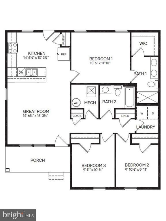 Explore 123 Parkland Road, a new home under-construction in the quaint Kinnamon Meadows community of Greensboro, MD. The Curtis is a 1,182 square foot, cottage-style ranch home with three bedrooms and two bathrooms. As you enter the home through the front porch, this thoughtfully designed home has a grand open concept living area that leads into the spacious kitchen. To the right, a long, main hallway allows for the two guest bedrooms and guest bathroom to be separate from the living areas of the home. Along this hallway, you will also find a coat closet, a hall linen closet, and the laundry room. The well-appointed kitchen features an abundance of stylish gray cabinetry, stainless steel appliances, a corner pantry and a peninsula island with additional room for seating. The main bedroom is set apart in the back of the home and features a walk-in closet and full bathroom with a double-bowl vanity. The included white blinds and an innovative Smart Home package will give you complete peace of mind living in your new home. Pictures, artist renderings, photographs, colors, features, and sizes are for illustration purposes only and will vary from the homes as built. Image representative of plan only and may vary as built. Images are of model home and include custom design features that may not be available in other homes. Furnishings and decorative items not included with home purchase.