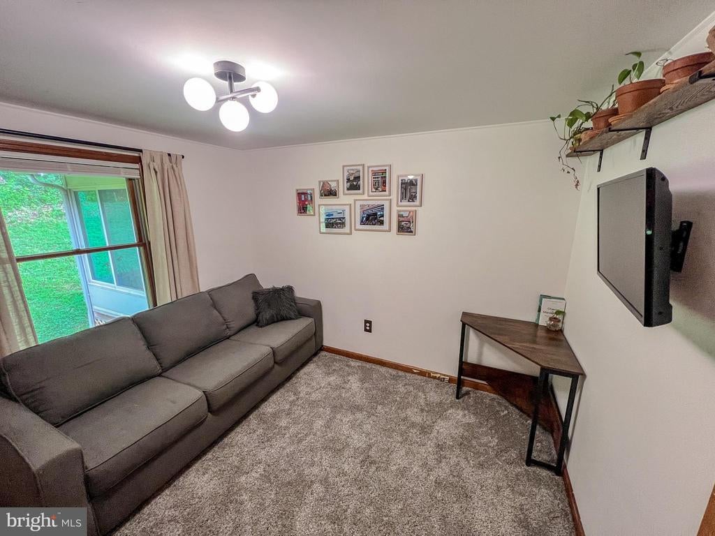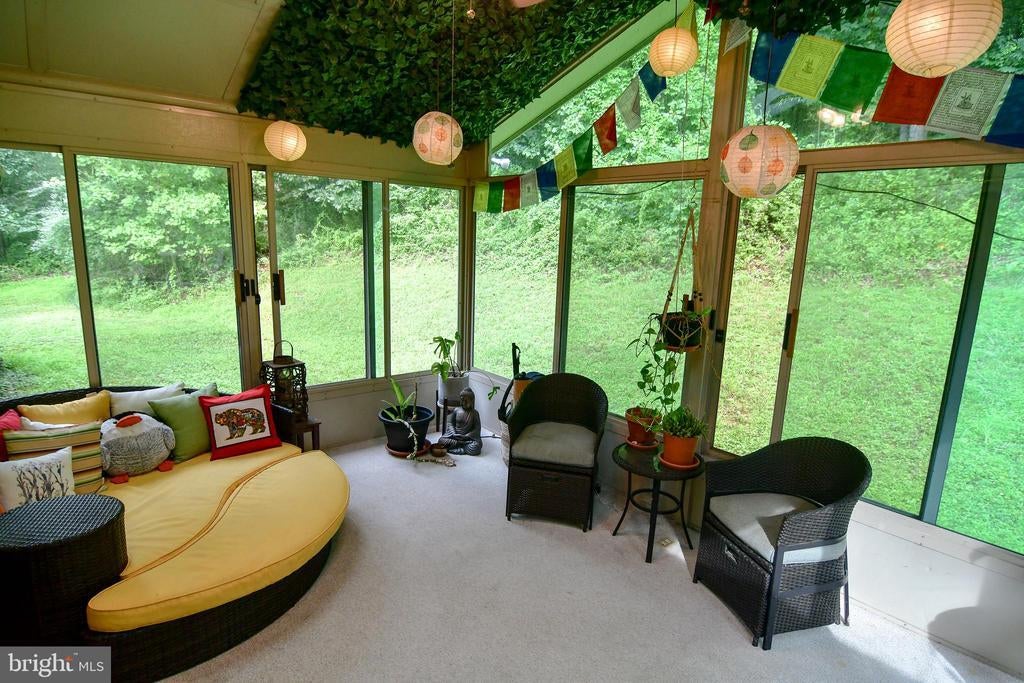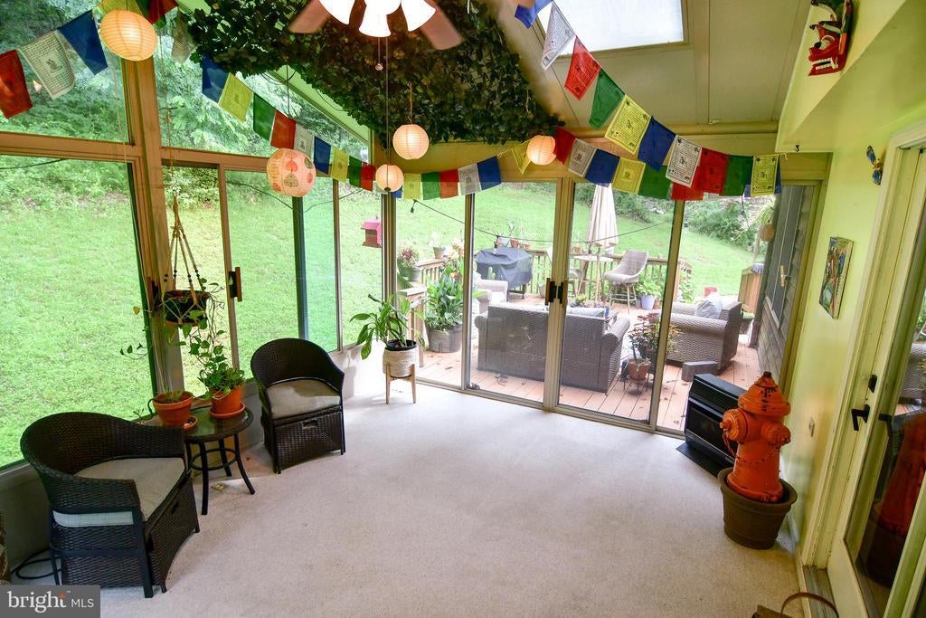 Situated on a long tree-lined driveway at the end of a private road, this two-level rancher is built on a 9.44 acre wooded lot on the east slope of Braddock Mountain, only ten minutes from shopping and dining in downtown Frederick, and hiking at Gambrill State Park. The main level includes a kitchen with solid cherry counters, and large east-facing windows with a view of the sunrise and nighttime views of the city lights, 700 feet below. The living room has a cozy propane fireplace, and two sunny offices fill out the living area. Symmetrical gigabit internet service is available, making this a perfect remote work retreat. A 15x12' gas heated sunroom is attached to the living room and rear deck, which wraps around half of the home! The home has a primary suite with large bathroom, plus two guest rooms that share a single full bath in the middle of the home. Warm wood trim and large entryways throughout compliment the home's forest setting. The lower level consists of a long garage that runs the full 52' length of the home, with built-in workbenches and heavy duty shelves. The remainder of the lower level includes a workshop, exercise space, and a high-end home theater, which is fully included at asking price. A roomy half bath is attached to the theater room, with space to add a shower. Home's website includes details of the theater room, as well as well water reports and other information. Storage space is plentiful, between the garage, several closets on the lower level, and a walk-up attic with full floor. The sloping, private lot is covered with mature hardwoods and a fire pit area, where you will spot deer, turkey, fox, and even the occasional black bear and bald eagle! A large parking area on the paved driveway has space for 6 cars. There is a deer-proof raised bed garden, and herb boxes scattered along the large wrap-around deck, along with a hot tub in a custom built surround.