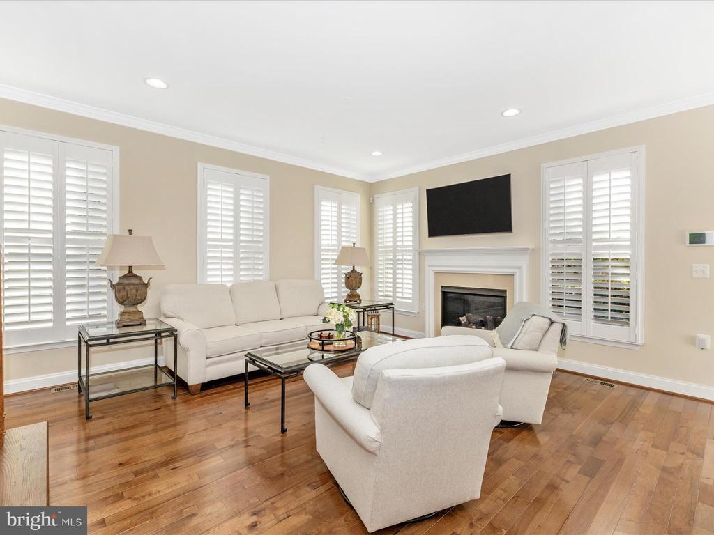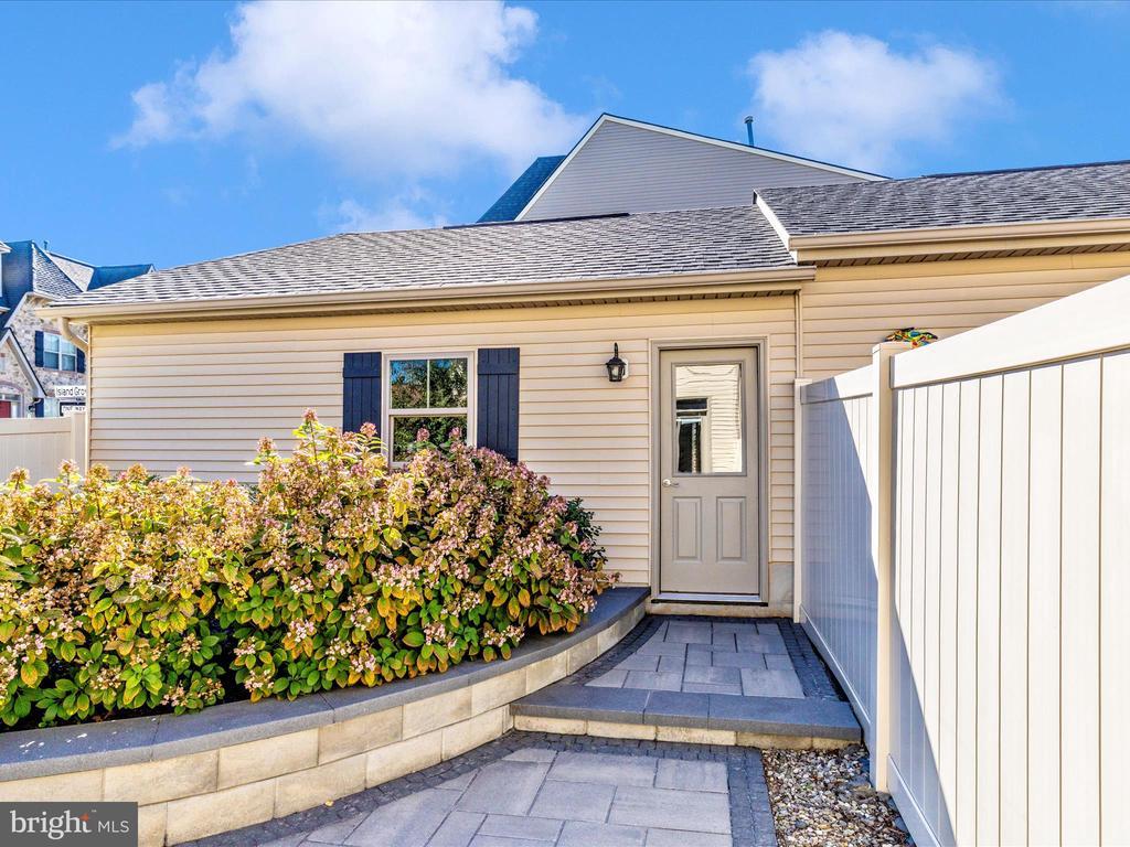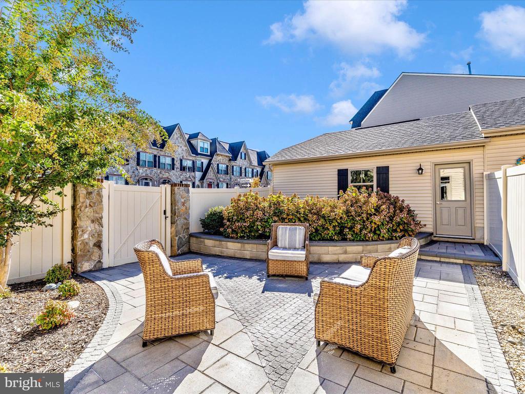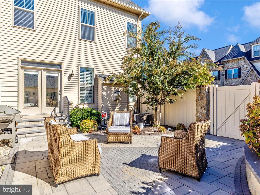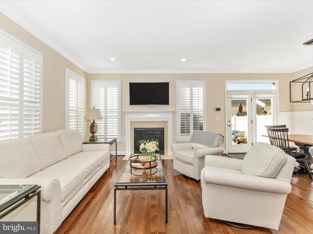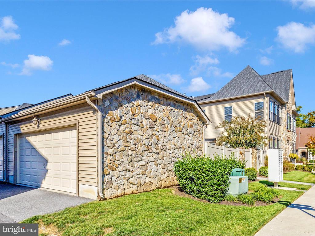 Upgraded and meticulously maintained Chambord model features main floor primary suite and 2-car detached garage! One of the largest townhome lots in the community! Open floor plan is perfect for day to day living and entertaining! Hickory hardwood flooring, upgraded crown and base moldings, and plantation shutters throughout the main level living area. Great room features beautiful gas fireplace with white mantle and beige marble surround. Dining room showcases upgraded farmhouse style light fixture and white, raised panel accent wall. Gourmet kitchen upgrades include: white painted cabinets with crown molding, quartz countertops, tiled backsplash, stainless steel vent hood over cooktop, ultra quiet KitchenAid dishwasher, counter depth refrigerator, white ceramic, farmhouse sink and custom pendant lights over island bar. Main living area opens to fully fenced rear yard with exceptional patio and professionally landscaped gardens. Main level primary suite includes walk-in closet and luxury bathroom with upgraded tile and frameless glass shower. Pantry, powder room and separate laundry room also on main level. Hardwood staircase leads to upper level featuring enormous family room with hardwood flooring. Two additional bedrooms and full bathroom with dual vanity on upper level. Partially finished lower level includes rec room with egress window and two storage closets. Full bathroom rough-in is framed and drywalled. Storage room includes utility sink. Upgraded integrated dual zone HVAC and water softener. HOA fee entitles owner to access all community amenities and also includes front/side yard lawn care and landscaping.