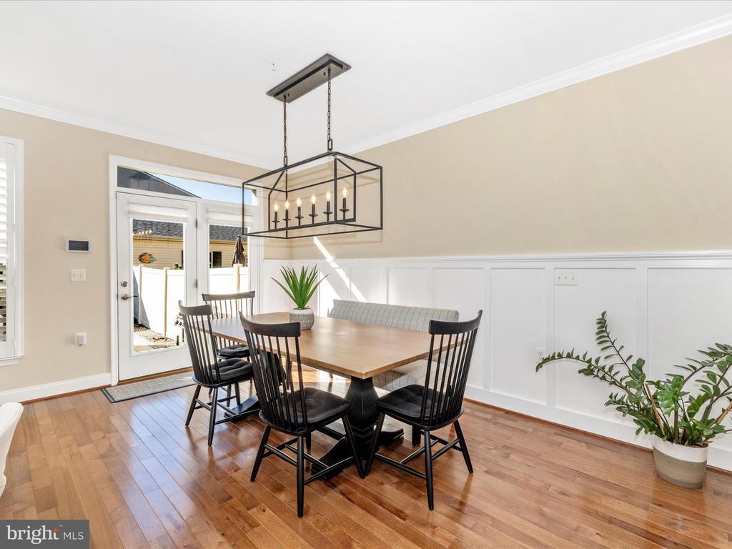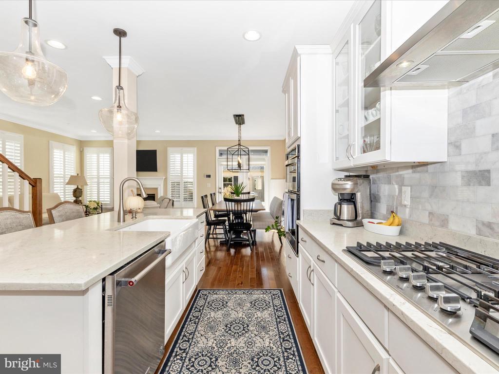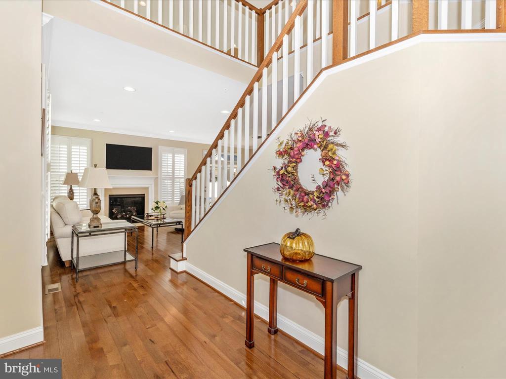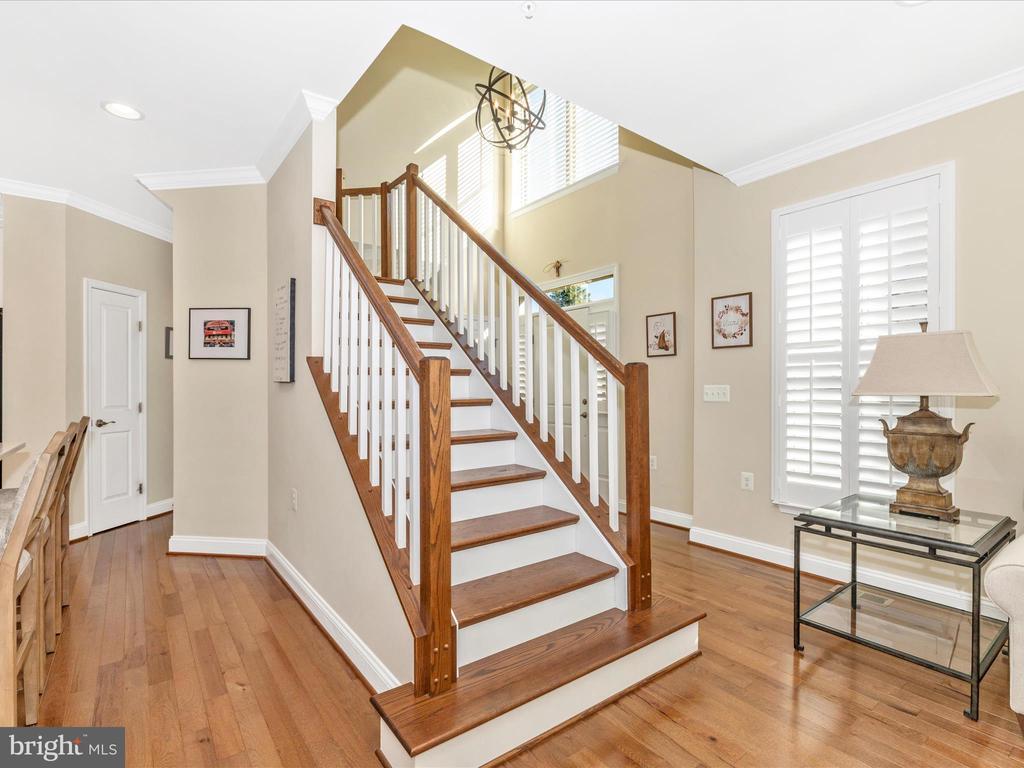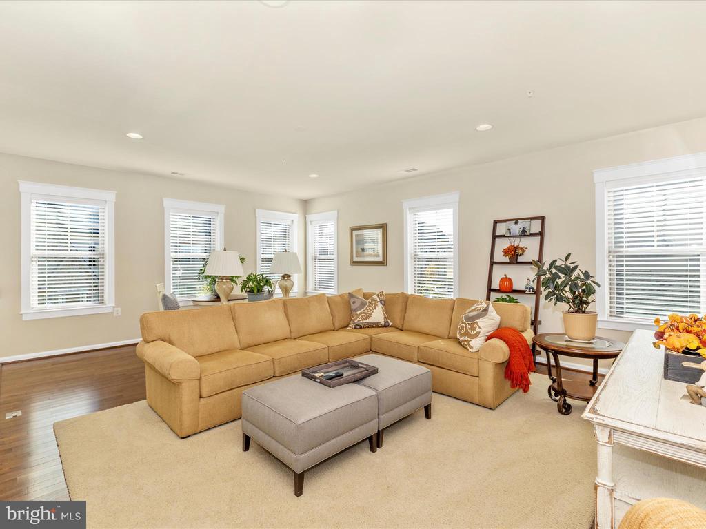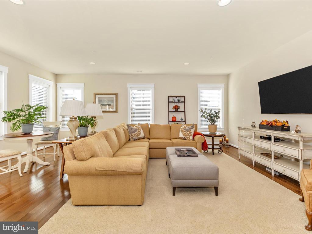 Upgraded and meticulously maintained Chambord model features main floor primary suite and 2-car detached garage! One of the largest townhome lots in the community! Open floor plan is perfect for day to day living and entertaining! Hickory hardwood flooring, upgraded crown and base moldings, and plantation shutters throughout the main level living area. Great room features beautiful gas fireplace with white mantle and beige marble surround. Dining room showcases upgraded farmhouse style light fixture and white, raised panel accent wall. Gourmet kitchen upgrades include: white painted cabinets with crown molding, quartz countertops, tiled backsplash, stainless steel vent hood over cooktop, ultra quiet KitchenAid dishwasher, counter depth refrigerator, white ceramic, farmhouse sink and custom pendant lights over island bar. Main living area opens to fully fenced rear yard with exceptional patio and professionally landscaped gardens. Main level primary suite includes walk-in closet and luxury bathroom with upgraded tile and frameless glass shower. Pantry, powder room and separate laundry room also on main level. Hardwood staircase leads to upper level featuring enormous family room with hardwood flooring. Two additional bedrooms and full bathroom with dual vanity on upper level. Partially finished lower level includes rec room with egress window and two storage closets. Full bathroom rough-in is framed and drywalled. Storage room includes utility sink. Upgraded integrated dual zone HVAC and water softener. HOA fee entitles owner to access all community amenities and also includes front/side yard lawn care and landscaping.