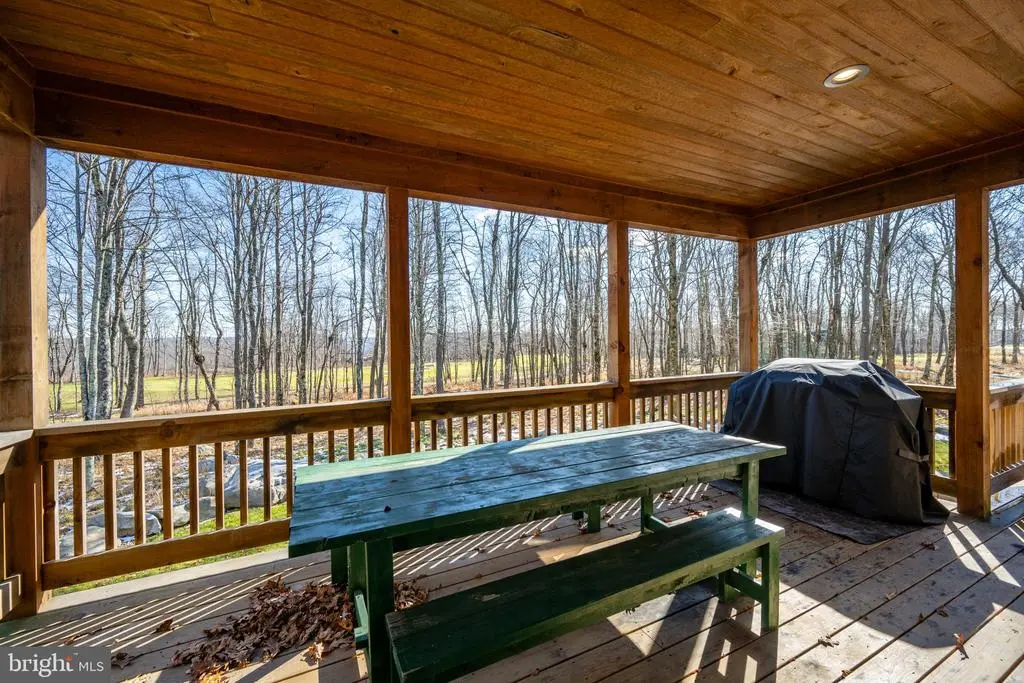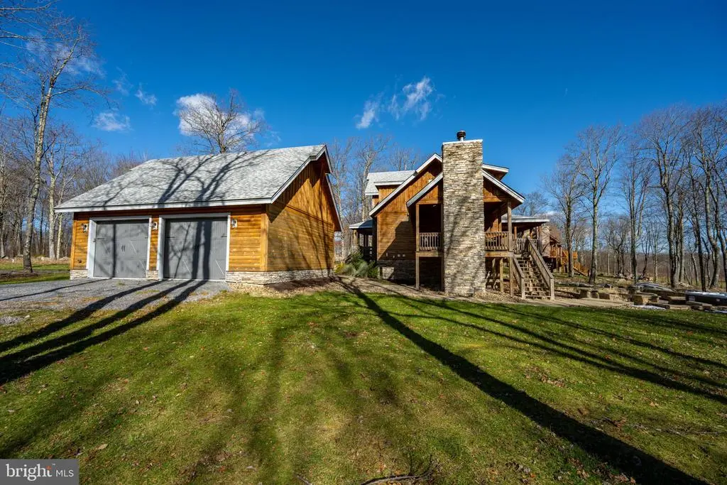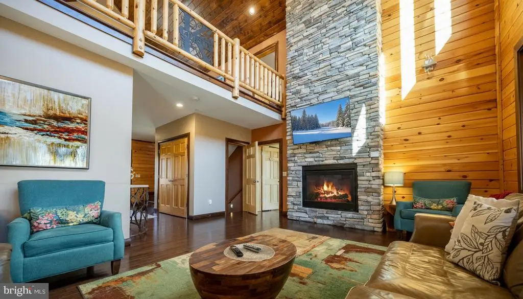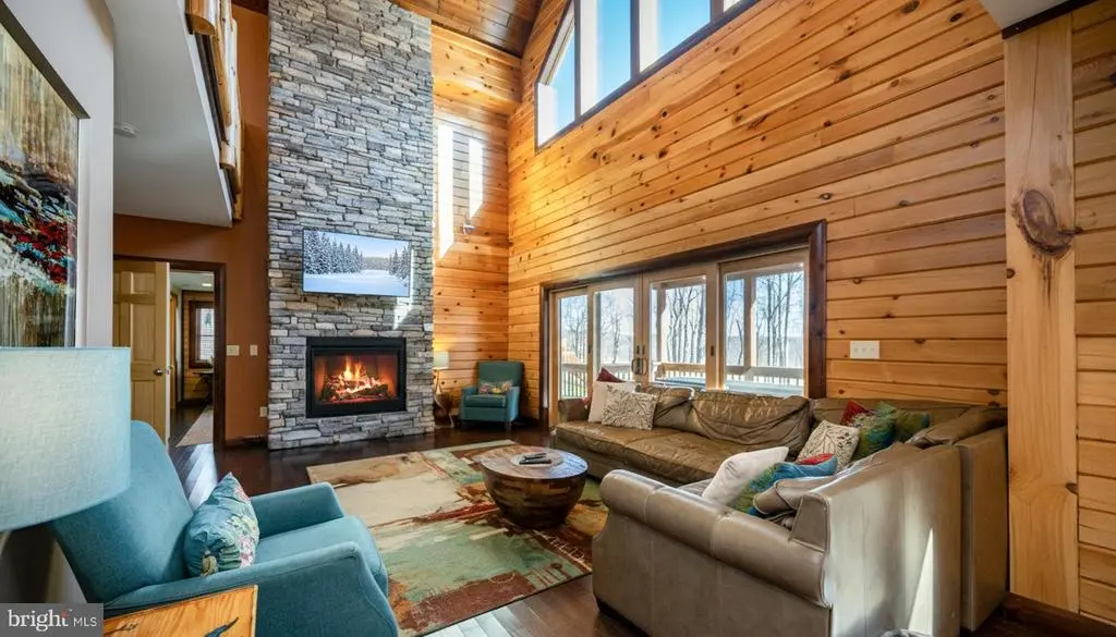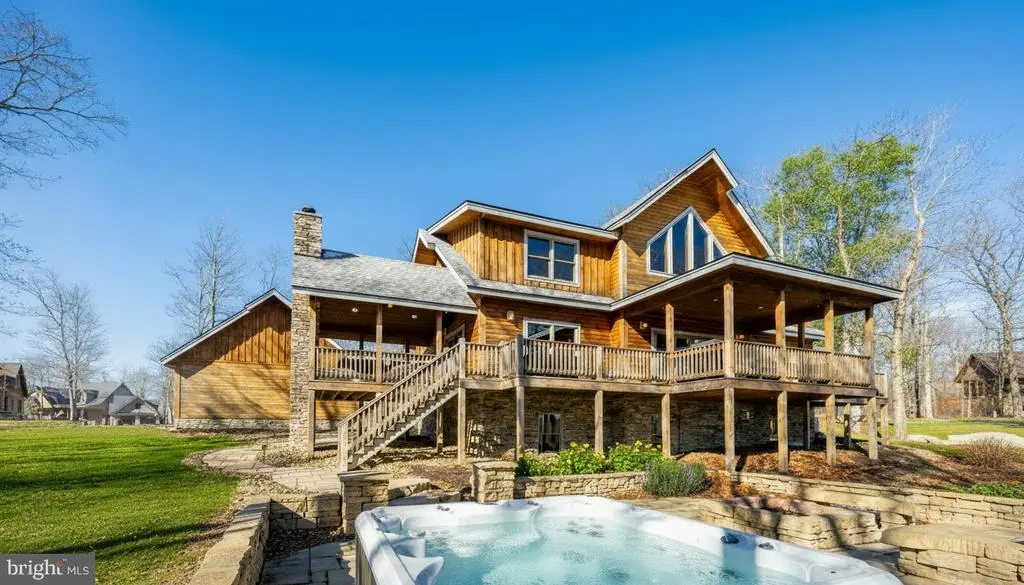 This striking 5 bed/7 bath log home sits in one of Wisp Mountain’s most sought-after locations, offering a warm four-season retreat just minutes from Deep Creek Lake, Lodestone Golf Course, Wisp Resort, and the area’s top dining and recreation. Seasonal lake views from the living room and deck enhance the setting and connect the home to its surroundings. The main level features a bright, open layout with a wall of windows, a floor-to-ceiling stone fireplace, and a well-equipped kitchen with granite, stainless appliances, gas range, farm sink, and a large island. Sliding doors extend the space onto an expansive deck with a covered outdoor fireplace, making indoor-outdoor entertaining effortless. A main-level primary suite with deck access and a spa-style shower anchors the first floor, while the upper loft with wet bar and two additional suites provide comfortable accommodations. The lower level adds a full family-fun zone with a pool table, arcade game, wood-burning fireplace, wet bar, another primary suite, and a bunk room. Outside, a large stone patio with built-in firepit seating and a private hot tub complete the package, offering multiple places to gather, unwind, and enjoy the mountain setting. A detached two-car garage with space above provides excellent storage for vehicles and gear. The property is also equipped with a whole-house Generac generator, ensuring dependable backup power in every season. Blending craftsmanship, comfort, and a prime location close to everything Deep Creek offers, this home stands out as an ideal full-time residence, vacation property, or rental investment.