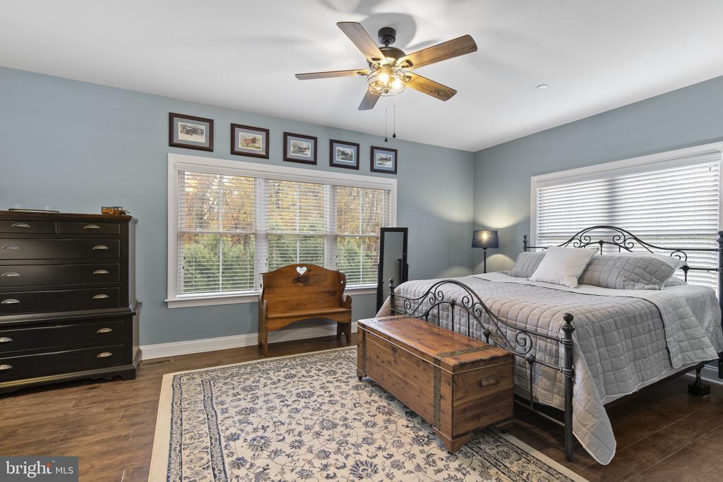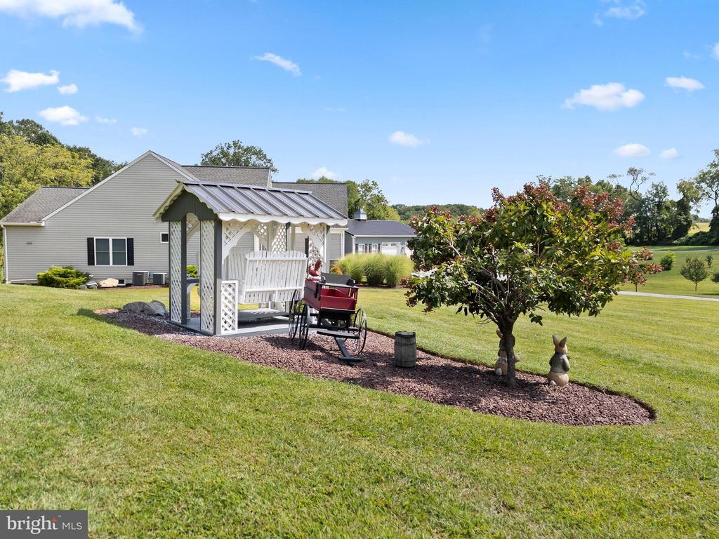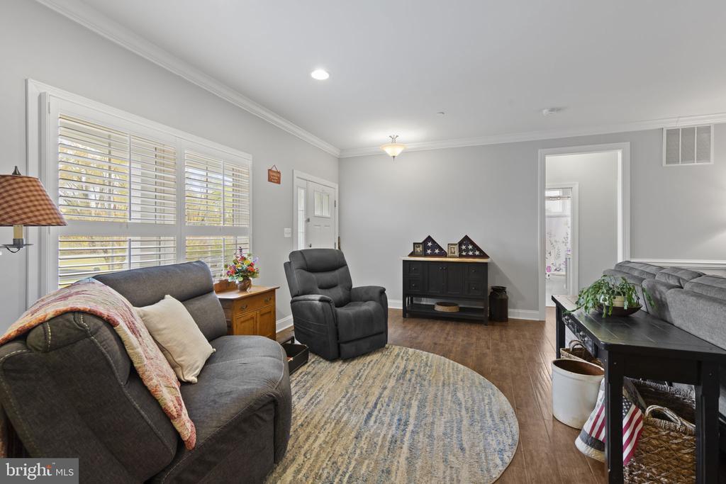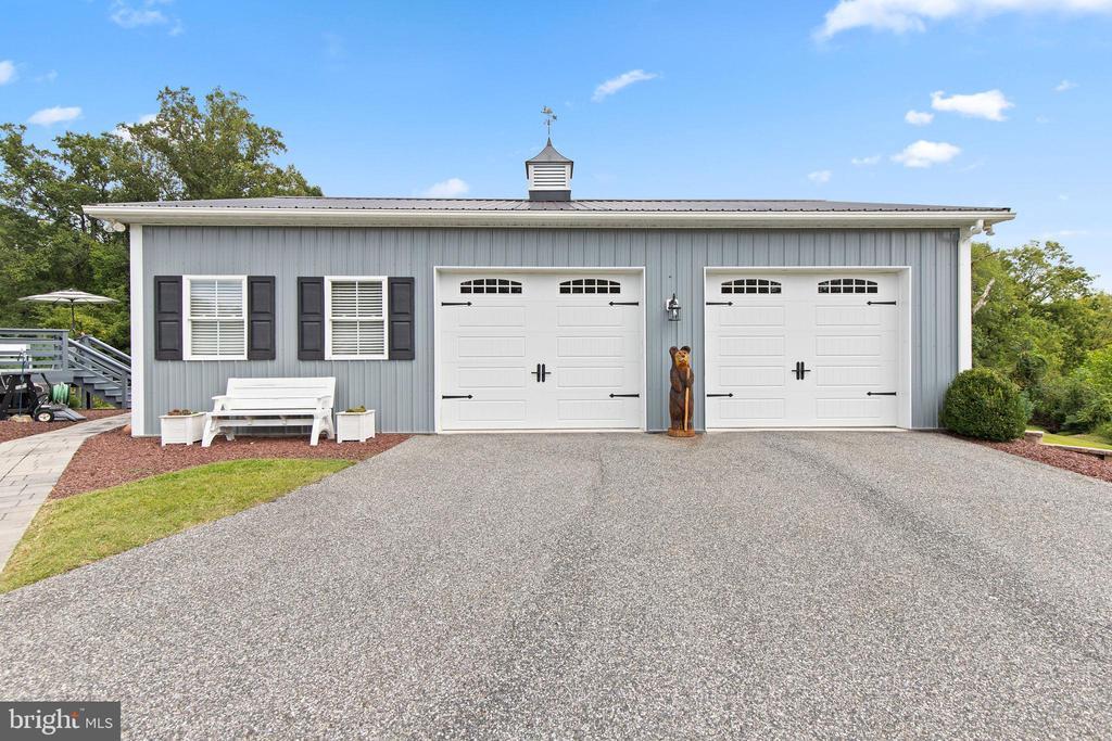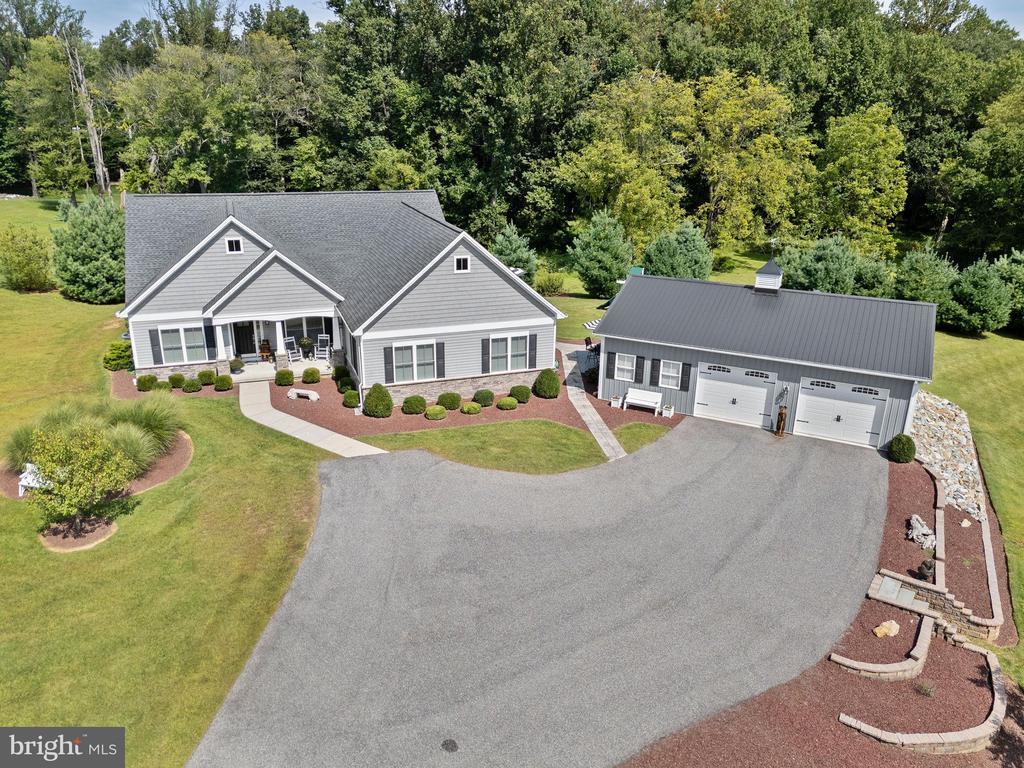 This versatile home with separate living quarters offers comfort, style, and modern living on one level, with additional finished basement space. Step into the bright and inviting living room, featuring hardwood floors, chair rails, crown molding, recessed lighting, a ceiling fan, and a cozy gas fireplace. The open dining area flows seamlessly from the living room and leads to a small deck, perfect for morning coffee or outdoor entertaining. The chef’s kitchen is the heart of the home, featuring gray granite countertops, a large island with a farm sink, 42-inch custom cabinetry, and upgraded stainless steel appliances, including a French-door refrigerator. The main level also includes two well-appointed bedrooms with hardwood floors, double-door closets, plantation shutters, and a full bath with tile flooring and a tub/shower combo. The spacious primary suite is a private retreat with hardwood floors, a barn-door walk-in closet, a tray ceiling, and a spa-like bath featuring stone tile flooring, dual vanities, and a stylish walk-in shower. Laundry hookups are conveniently located nearby. The partially finished walkout basement adds a massive amount of living space, including a recreation room, powder room, craft room, and abundant storage. A true highlight of the property is the fully equipped in-law suite, offering complete, independent living with its own entrance, it's own HVAC system, family room, full kitchen with granite countertops and stainless steel appliances, bedroom with double-door closet, jack-and-jill bath with walk-in shower, and a second laundry hookup—perfect for multigenerational living or long-term guests. Outside, multiple decks, a huge detached garage with full electric and workshop, a large pole building, and sprawling acreage provide endless possibilities for hobbies, storage, outdoor entertaining, and enjoying every season. Built in 2017 and meticulously maintained, this home combines modern amenities, timeless charm, and incredible versatility.