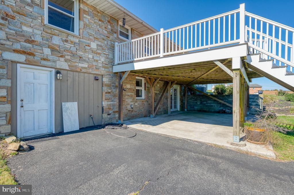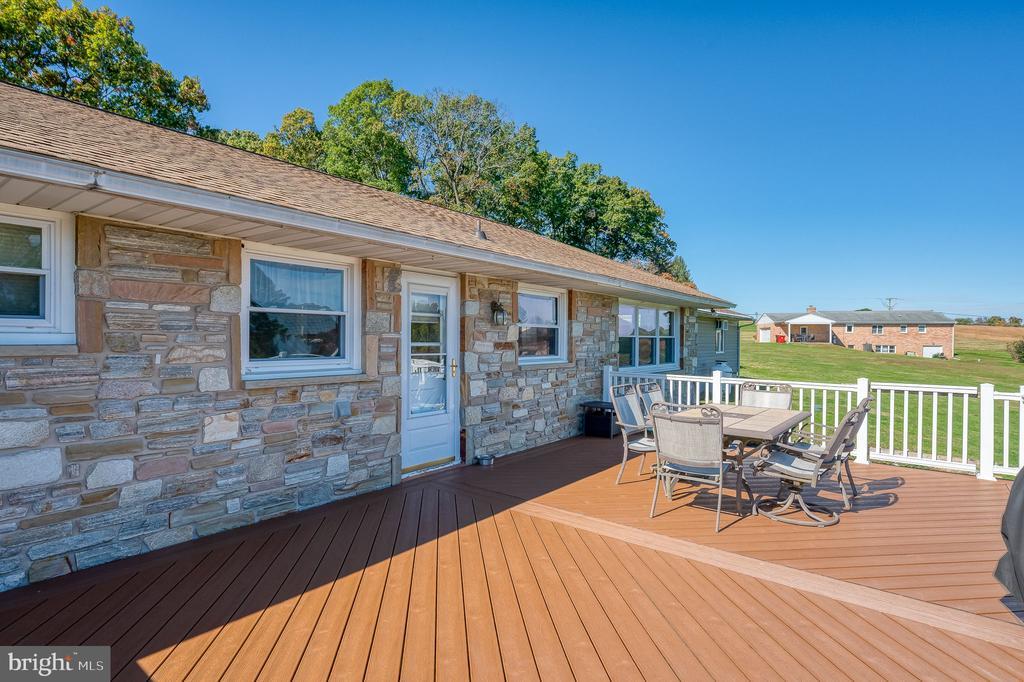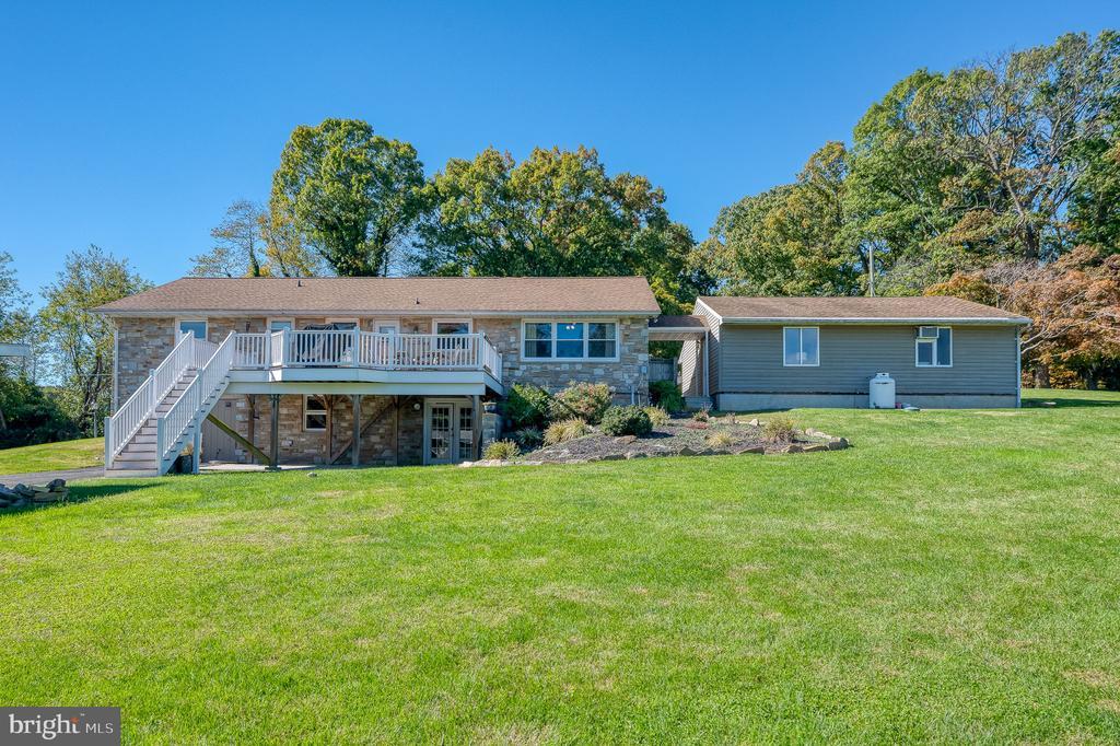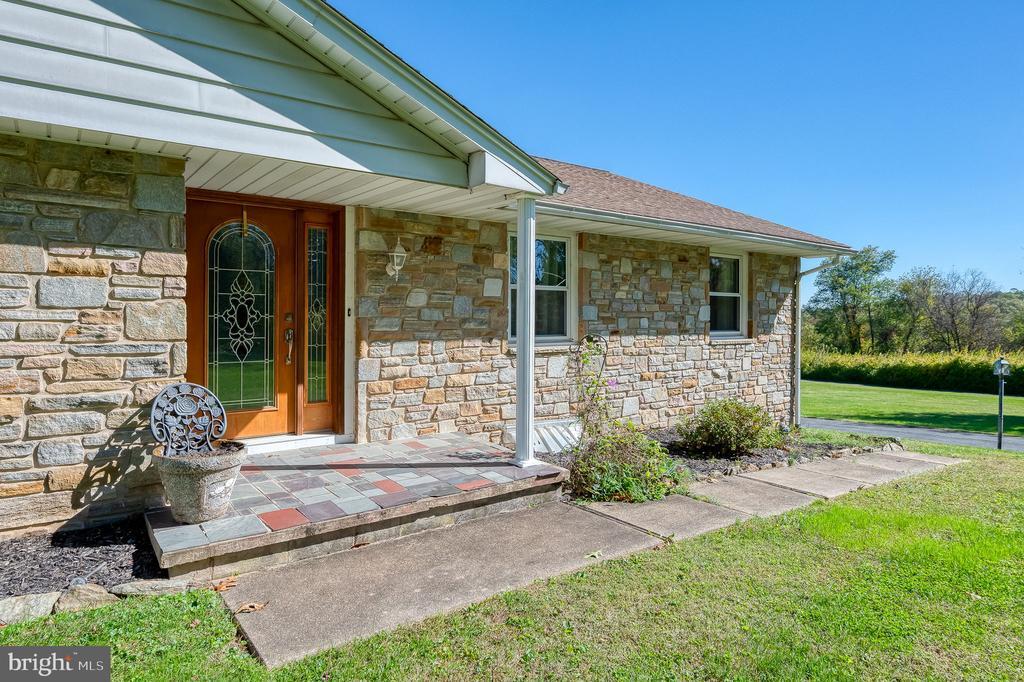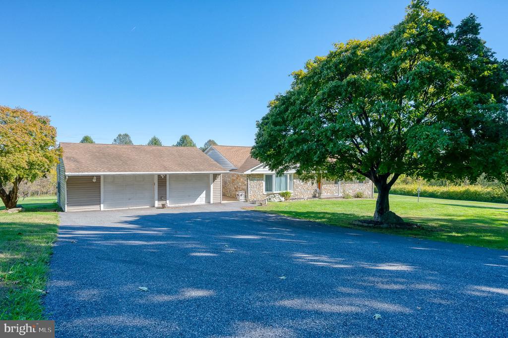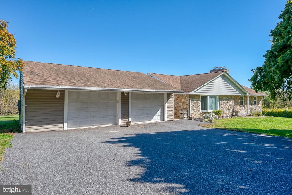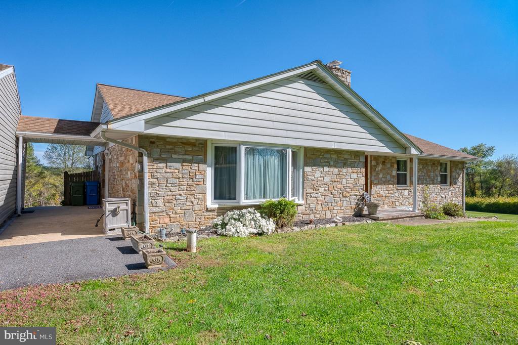 Welcome to this charming stone rancher featuring an oversized two-car garage with electric. This home features five bedrooms and 3.5 bathrooms. The main level offers beautiful hardwood floors, convenient laundry closet and wood burning fireplace in the bright family room with crown molding and bay window. The updated eat-in kitchen has a breakfast bar and stainless steel appliances and is open to the living room. The primary suite has a renovated primary bathroom with pocket door access. There are two more bedrooms along with another full bathroom. You'll find a walk-in storage closet/pantry in the hall. The walkout lower level is also finished with two more bedrooms and 1.5 bathrooms. It has a large rec room with wood stove, office, storage and kitchenette - perfect for guests or an in-law suite. It exits to a large patio and additional parking. Outside you'll also find peaceful, quiet surroundings along with two storage sheds, a run-in shed, and a breezeway connecting the house and garage. Entertain on the huge maintenance-free deck or your expansive patio and yard.