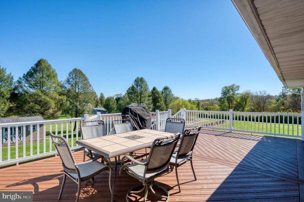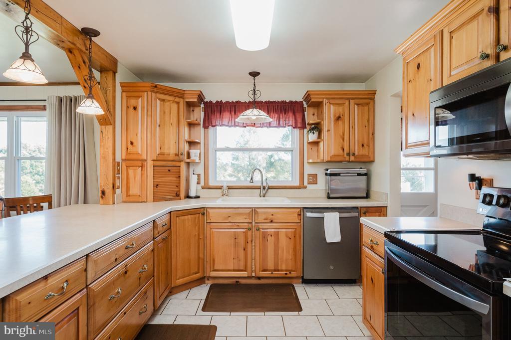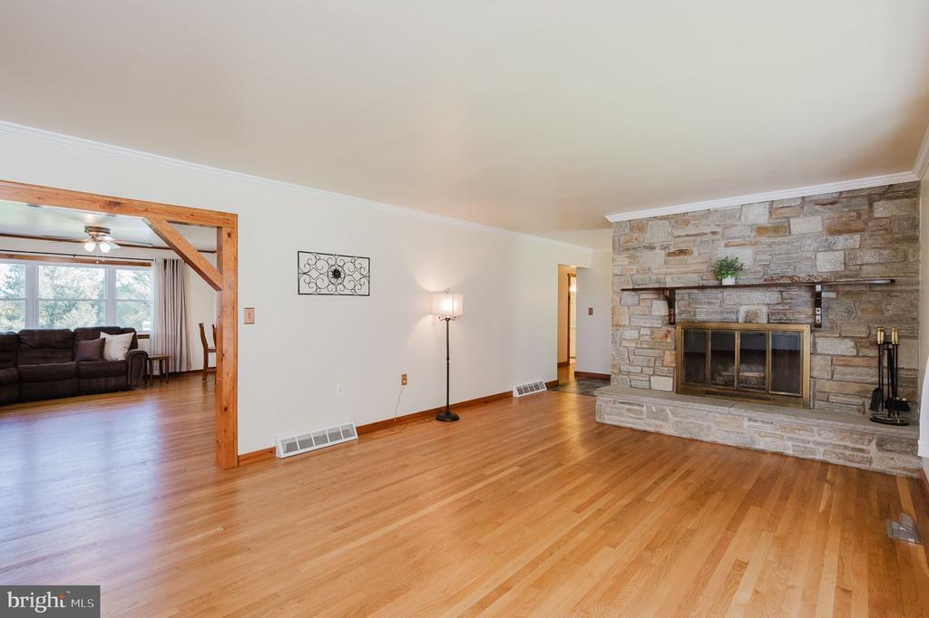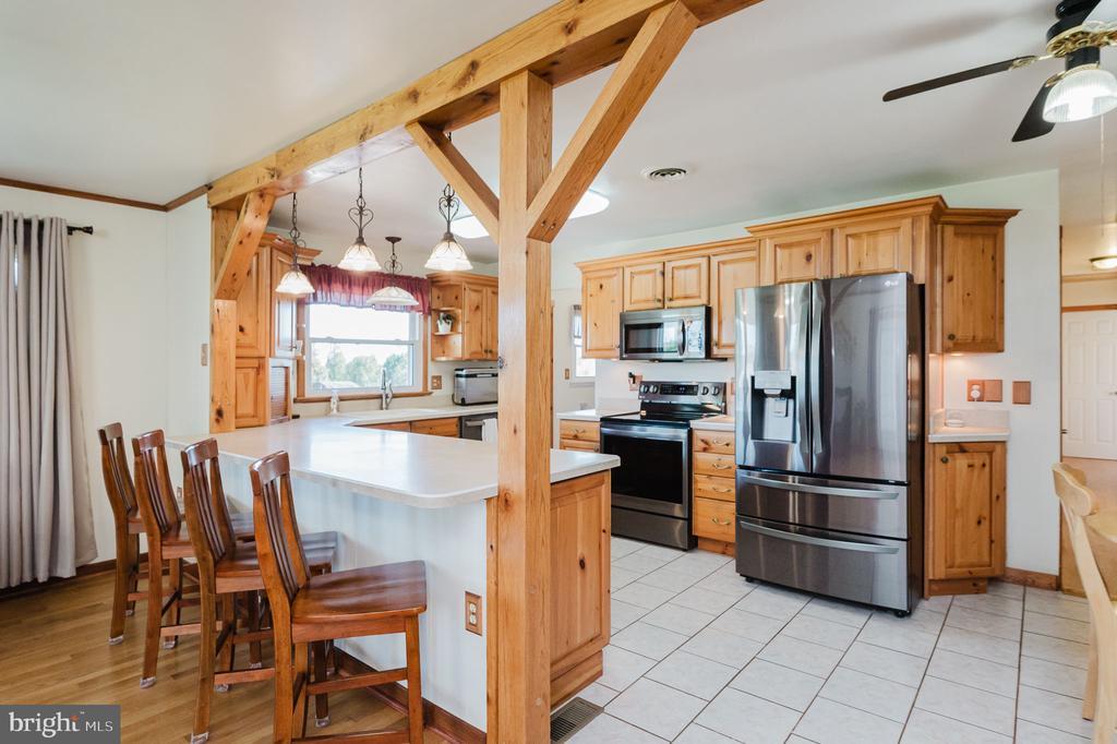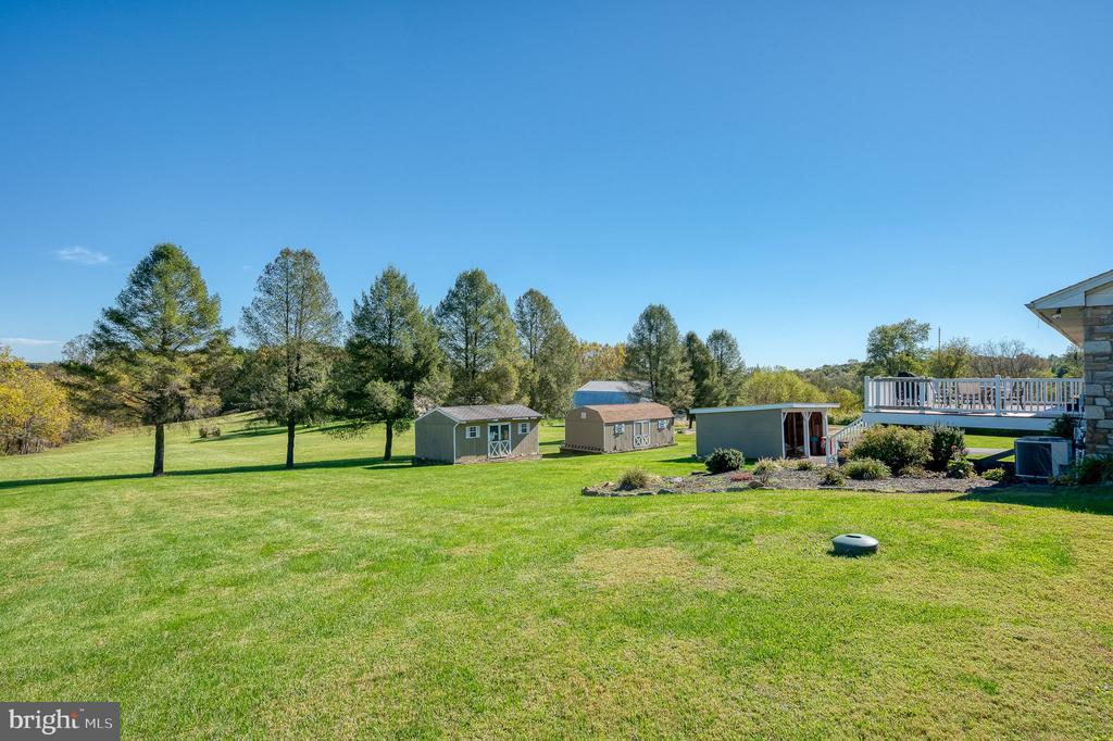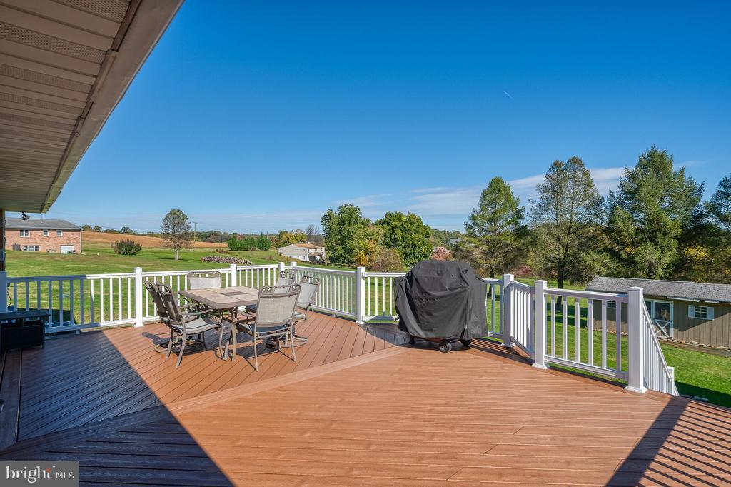 Welcome to this charming stone rancher featuring an oversized two-car garage with electric. This home features five bedrooms and 3.5 bathrooms. The main level offers beautiful hardwood floors, convenient laundry closet and wood burning fireplace in the bright family room with crown molding and bay window. The updated eat-in kitchen has a breakfast bar and stainless steel appliances and is open to the living room. The primary suite has a renovated primary bathroom with pocket door access. There are two more bedrooms along with another full bathroom. You'll find a walk-in storage closet/pantry in the hall. The walkout lower level is also finished with two more bedrooms and 1.5 bathrooms. It has a large rec room with wood stove, office, storage and kitchenette - perfect for guests or an in-law suite. It exits to a large patio and additional parking. Outside you'll also find peaceful, quiet surroundings along with two storage sheds, a run-in shed, and a breezeway connecting the house and garage. Entertain on the huge maintenance-free deck or your expansive patio and yard.