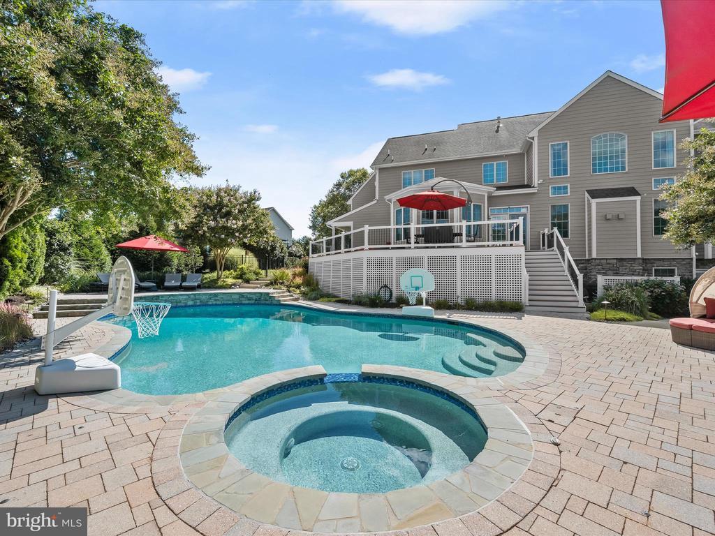 Extensive Hardscape, Exterior Lighting, Patio, Deck(s), Fenced-Rear, Concrete, Pool (In-Ground), Pool/Spa Combo