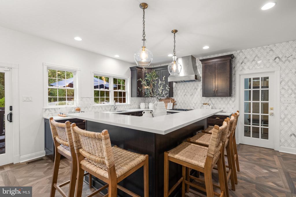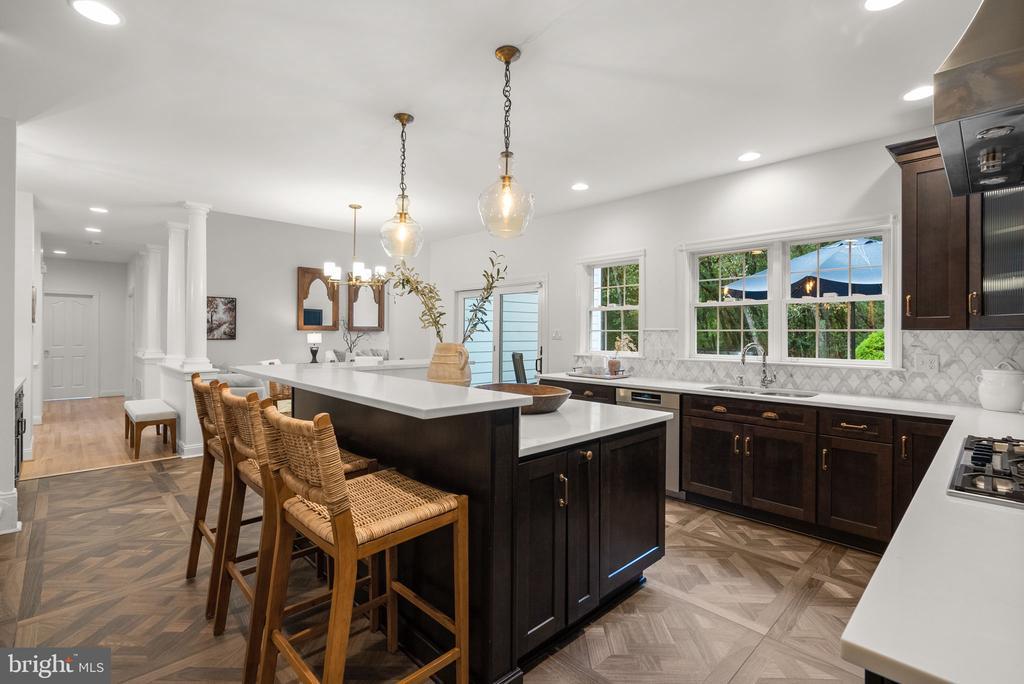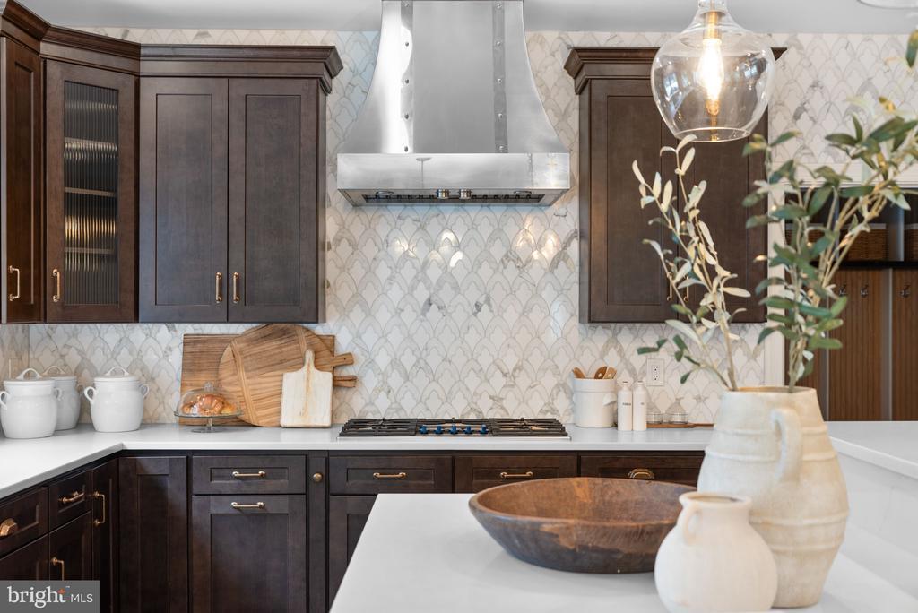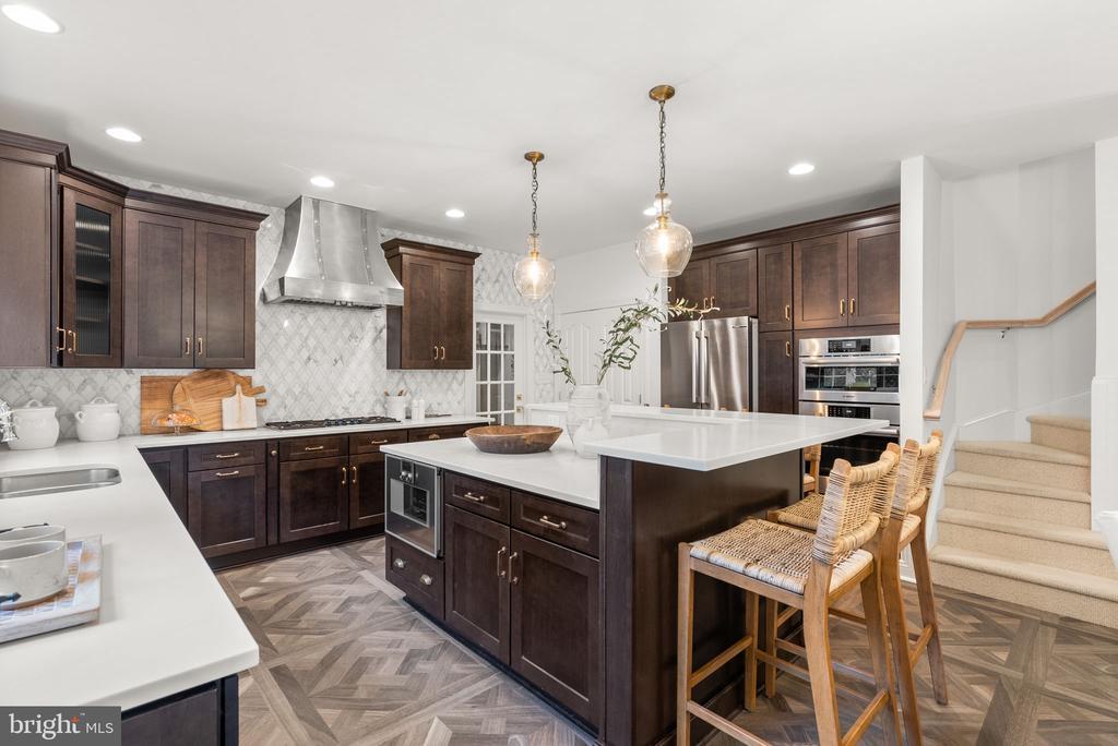 Welcome to The Kingsway Haven, a remarkable residence showcasing an array of indoor and outdoor spaces curated for luxurious living. Completely reimagined and thoughtfully renovated in 2022, this property is truly a haven for clean living with refined upgrades and wellness-driven design. The home backs to forest preserve and is tucked on a 0.7-acre homesite on a quiet cul-de-sac in the desired Kingsbridge community in Howard County’s Centennial School District. This prime location in Ellicott City is convenient to dining, shopping, parks, schools, country clubs, commuter routes, BWI airport, and more. Exterior amenities reflect a resort-style sanctuary. A Trex deck invites al fresco dining, and overlooks a fenced saltwater pool and spa surrounded by a stone patio and mature landscaping. Meandering stepping-stone pathways lead to the custom garden house or art studio, the stacked stone fire pit area, and the spectacular imported Belgian Orangerie—a truly dreamy space for growing plants, cozying up with a morning coffee, or hosting magical starlit dinners. Inside, hand-sanded oiled oak floors, bespoke built-ins, and soaring windows fill the interior with natural light and elegance. A two-story foyer with a sparkling chandelier opens to the formal living room and the formal dining room with custom inlay floors, wainscoting and dentil mouldings, a tray ceiling, and chandelier. Ahead, the two-story great room unfolds, defined by elegant columns, vaulted ceilings, and a marble mosaic fireplace framed by treetop views through dramatic windows. Continue and find a chic powder room and a study with French doors, elegant mouldings, built-ins, and a bay window. The English-inspired kitchen is a chef’s dream equipped with imported marble mosaics on walls and backsplash, Italian parquet tile floors, an oversized tiered quartz island with breakfast bar seating, rich cabinetry, pendant lighting, and an appliance suite including a Gaggenau plumbed steam oven, Thermador 5-burner range, Elica designer hood, and Bosch 800 Series refrigerator, oven, and dishwasher. An English café station with a built-in coffee bar and a custom English pantry complete this gourmet space, along with a breakfast area which accesses the deck. Just beyond, a mudroom features built-in cubbies, a built-in laundry station, cabinetry, plus a shower or dogwash station providing practical convenience for days spent enjoying the pool and outdoors. Upstairs, rich hardwoods grace the floors and hallway leading to the Cotswolds-inspired primary suite. This serene retreat boasts two cedar walk-in closets, a tray ceiling, and a sitting room with columns and custom built-ins. The spa-like bath offers indulgent amenities: a copper soaking tub, a steam shower, a dual-sink vanity, a fireplace, a linen closet, and built-in shelving. Three additional bedrooms and beautiful bathrooms complete the upper level—including one with a whimsical built-in reading nook. A secondary rear staircase leads down to the kitchen. Downstairs, the finished lower level is highlighted by wide-plank oak floors, a recreation lounge anchored by a stone-surround fireplace with built-in bookcases, and several defined spaces perfect for dining, entertaining, or playing. A versatile bonus room, a full bath, a walkup to the yard, and a fitness or yoga studio with mirrored walls and built-ins complete this spacious level. This home was updated in 2022 with extensive and expensive upgrades including all new HardiePlank siding and trim, bronze gutters with integrated gutter guards, roof with CertainTeed Landmark Pro Designer architectural shingles with advanced underlayment and flashing, all new shutters throughout, a new Trane HVAC system, a whole-house air filter and humidifier, and a new cast iron sump pump. Move right in and immediately enjoy the wonderful turn-key value and lifestyle. This is more than a residence—it’s a haven for elevated living. Let your new memories begin!