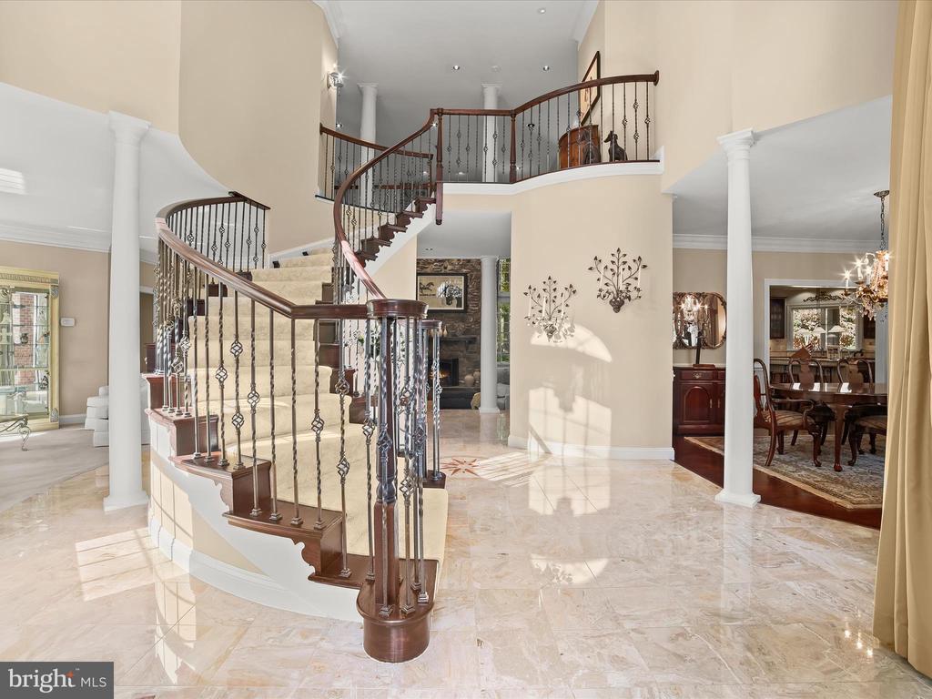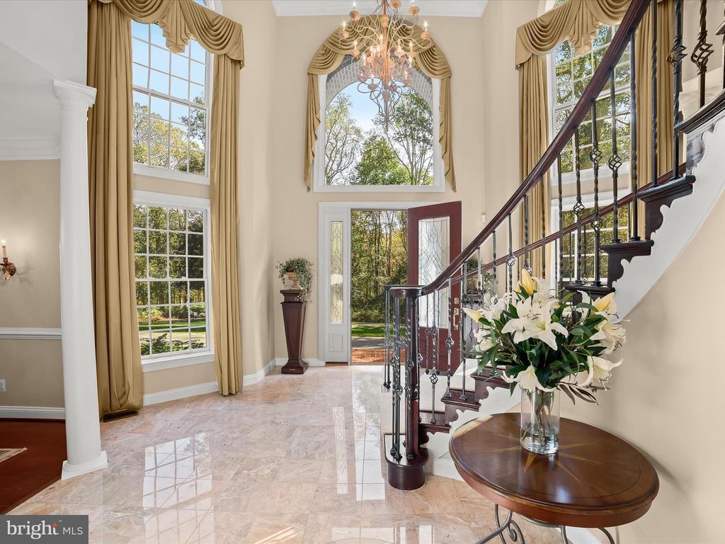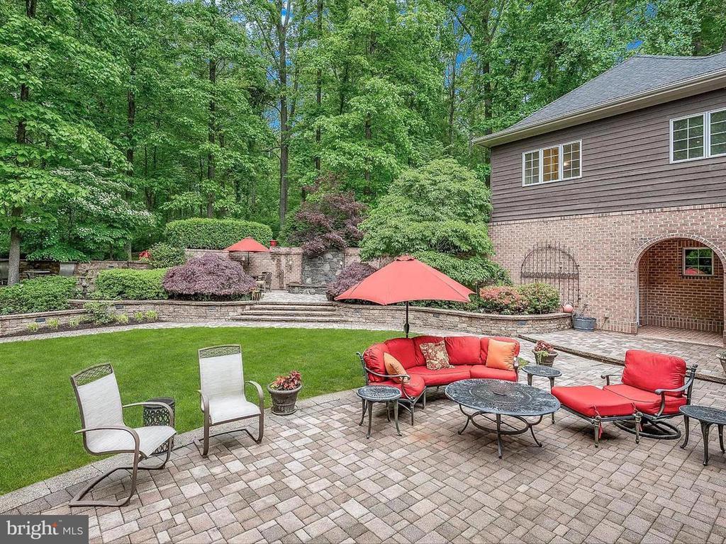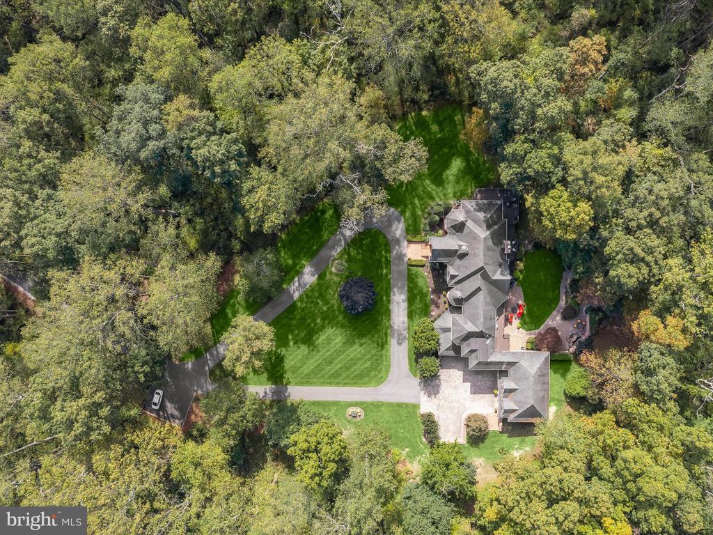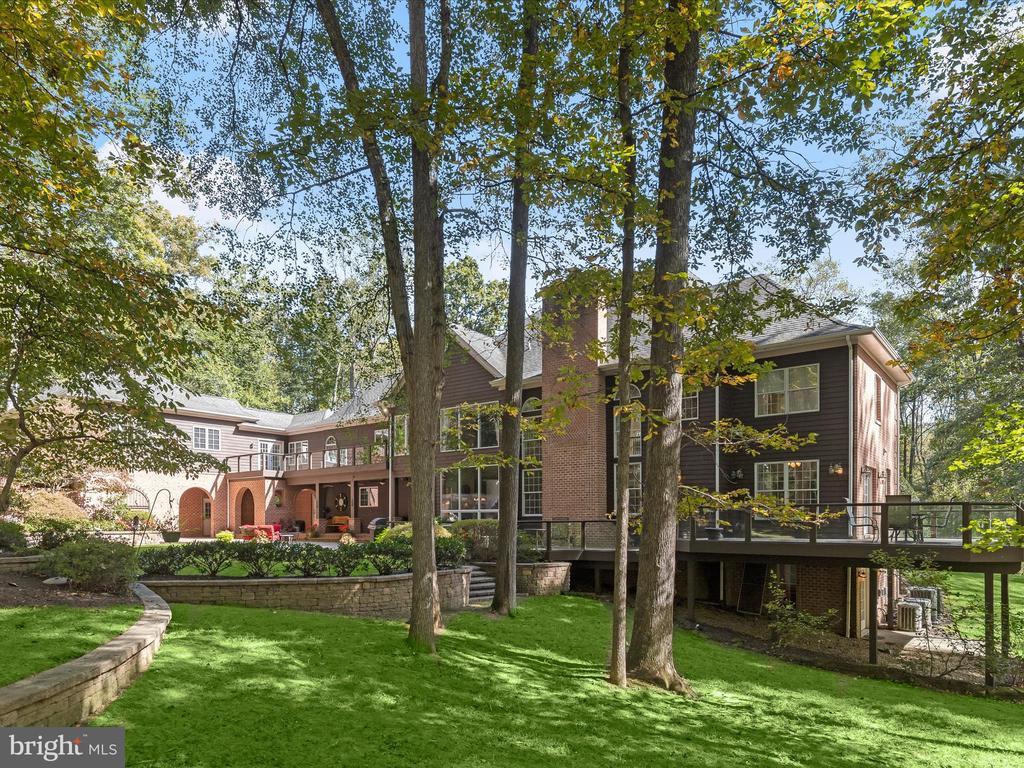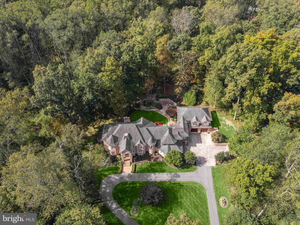 Magnificent estate in the coveted neighborhood of Triadelphia Woods that leads with its stately curb appeal, grand entertaining spaces, and considerable private quarters. Quietly set beyond a vast wooded driveway, you are welcomed to this brick and cedar home with distinguished turrets and beautiful park-like hardscaping and landscaping with Japanese Maple trees and azaleas in a private setting. Perfectly situated on over four acres, this unforgettable and custom-designed property spans over 8,000 square feet of well-curated living space with an in-law/guest suite. Sophisticated moldings, sundrenched windows, soaring ceilings, hardwood flooring, custom built-ins, and generous room sizes are just a few of the outstanding features awaiting you. The grand foyer is a breathtaking welcome to this elegant home, catching your eye immediately with its gleaming marble floors, circular skylight, and curved staircase with iron balusters. Anchored on one side of the foyer is the exquisite living room, embroidered with custom crown moldings. On the other side of the foyer is the formal dining room, a wonderful entertaining area well-suited for celebratory gatherings, highlighted by crown molding and chair railing. With an impressive two-story ceiling, the great room is a bright and comfortable room that has been outfitted with a wood-burning fireplace with a floor-to-ceiling stone surround flanked by striking stacked windows. The eat-in gourmet kitchen is spacious and well-appointed with granite counters, stone backsplash, 42-inch cabinetry with rope molding and under cabinet lighting, a center island with prep sink, high-end appliances including a gas cooktop with range hood, and additional paneled Sub-Zero refrigerator drawers in the island, planning station, and breakfast nook with two-story windows overlooking the stunning backyard. Adjacent to the kitchen is a full bath with a granite counter and an exceptional room perfectly suited for a home office, den, or main-level guest room. The main level is concluded by a powder room, laundry room with ample cabinetry, a folding counter, and sink, and a built-in drop zone. The substantial upper level is an exciting collection of 5 bedrooms, 4 full baths, and a sitting room at the top of the main stairs with a tray ceiling, bookcases, custom bench seating, overlooking the foyer and great room lined in iron balusters. Travel upstairs using one of the three staircases and into the primary suite. The primary suite is graced by a sitting room with distinguished built-in bookcases, a sizable bedroom with a slider to the upper deck, tray ceilings, and a large walk-in closet with a built-in storage system. The spa-like primary bath highlights a double vanity, jetted soaking tub, and separate floor-to-ceiling tiled shower. Three additional generously sized bedrooms, one with an en-suite bath, and a full hall bath with double vanity, conclude the main sleeping quarters. The other wing of the home offers the in-law/guest suite characterized by an expansive bedroom with window seating and river rock fireplace, wet bar with cabinetry and mini fridge, full bath, separate water, HVAC, and attic. The sprawling lower level presents an exercise room, full bath, recreation room, media room with fireplace and built-ins, custom brick arch wall inset, and wet bar with granite counters, beverage fridge, and dishwasher, ideal for entertaining. The lower level also offers walkout access, a cedar closet, and a spacious storage room. Enjoy spring and summer on the decks with modern glass panel railings that allow for an unobstructed view of the scenic backyard. Host the best outdoor gatherings on the exquisite, tiered stone patios with a waterfall and firepit. Additionally, this home features 1-car and 2-car garages with artisan doors, beautiful brick exterior archways, a custom stone parking courtyard off the circular driveway, and a climate-controlled outdoor utility room.