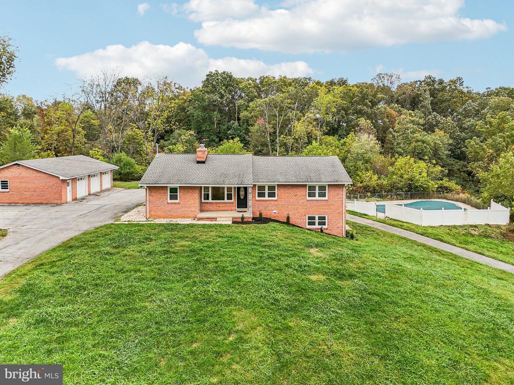 Escape to your own world with this stunning six-bedroom, three-full bath brick rancher nestled on a magnificent 5-acre lot, offering unparalleled amenities including an astro-turf sports field and a fenced-in, in-ground swimming pool. The main level showcases luxury living with refinished hardwood floors, fresh paint, and bright vinyl double-pane windows throughout. Highlights include a cozy living room with a wood-burning fireplace, a formal dining room with deck access, and a sparkling kitchen equipped with new granite countertops, stainless-steel appliances, and updated white cabinetry. The main floor also features a flexible office/den/bedroom with a separate entrance, an updated full hall bath, and a private primary bedroom retreat with an updated en-suite bath. The finished lower level dramatically expands your entertaining options with a spacious rec room featuring a second wood-burning fireplace and new LVP floors, a stylish full bath, and two large additional bedrooms with new carpet. Practicality meets luxury with a large laundry / storage room and a large circular driveway leading to a detached, expanded three-car garage. From the charming covered front porch to the convenient closed-in rear porch and deck, this property delivers unmatched space and amenities for upscale living and entertaining