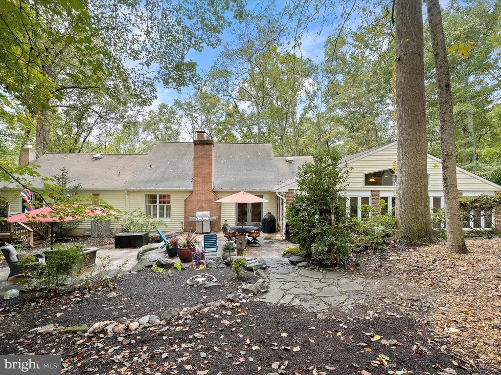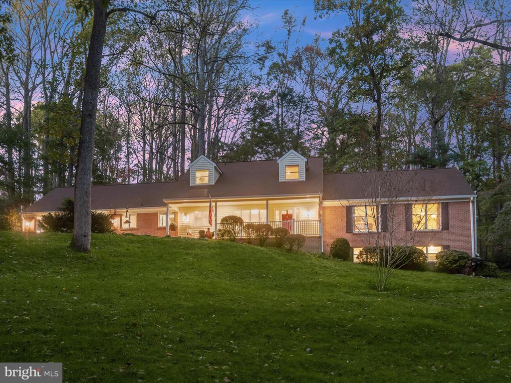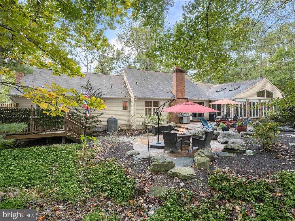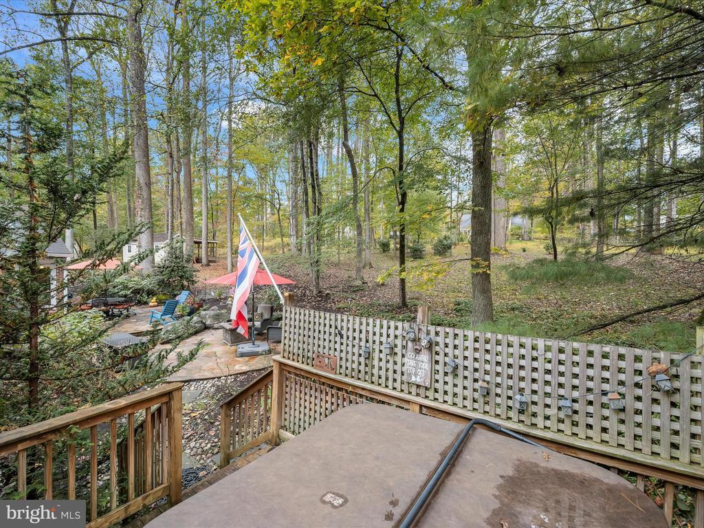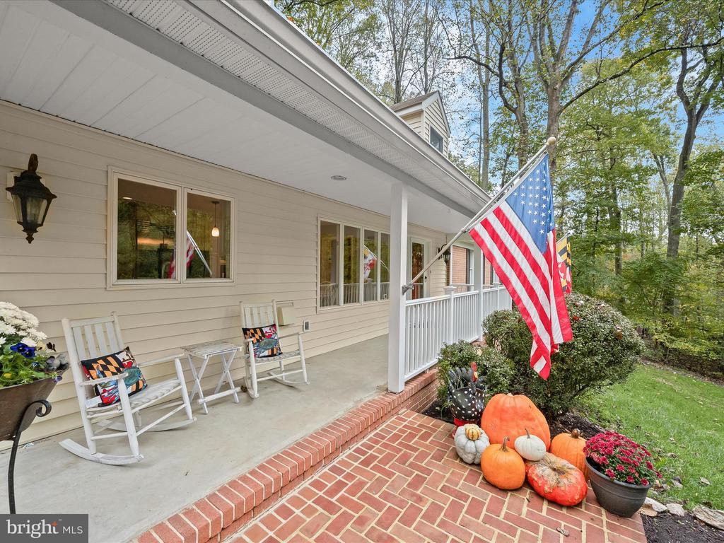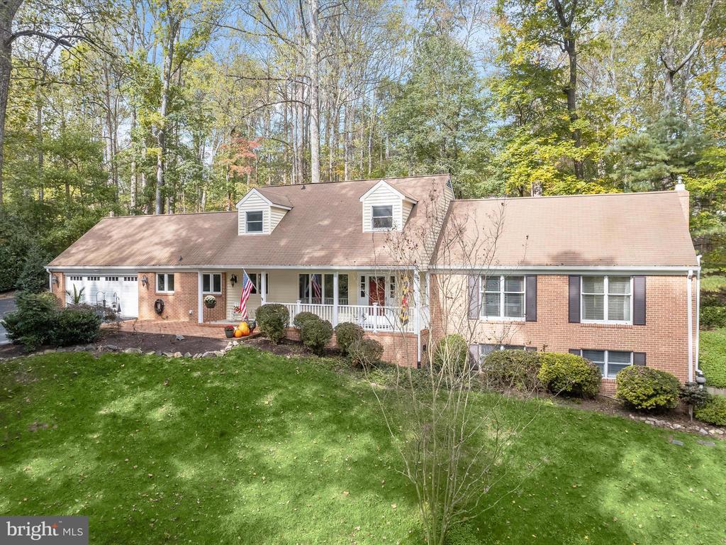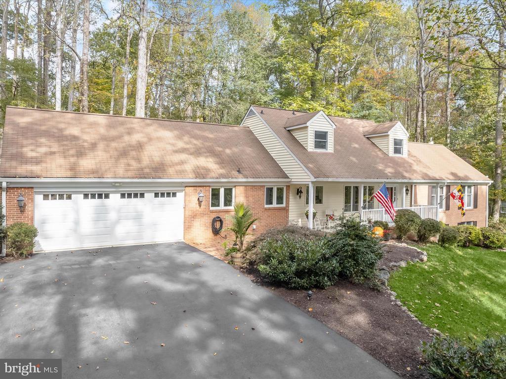 Introducing this extraordinary one-of-a-kind home tucked away in the sought-after Woodmark neighborhood in Ellicott City, offering a peaceful retreat on nearly an acre surrounded by mature trees. Featuring three bedrooms with four and a half bathrooms, this home has been thoughtfully updated inside and out, with meticulous attention to detail and timeless design. Beautifully manicured landscaping and a charming covered front porch create a warm welcome as you arrive. Inside, a soft color palette, sun-filled windows, and rich hardwood floors establish an inviting ambiance. Prepare your favorite meals in the gourmet eat-in kitchen that boasts granite countertops, a tile backsplash, lighted cabinetry, and a breakfast nook with a built-in desk station. Stainless steel appliances include a five-burner gas cooktop with telescopic downdraft, double wall ovens, and a Sub-Zero refrigerator replaced in 2024. A cozy wood-burning fireplace with brick surround anchors the elegant living room, enhanced by wainscoting, crown molding, and built-in shelving. French doors from the formal dining room open to an expansive family room with a soaring wood-beamed cathedral ceiling, skylights, and a stunning stacked-stone feature wall. Floor-to-ceiling windows frame peaceful views of the lush surroundings, creating an inspiring space for gathering or unwinding. This side of the home also includes a half bathroom and a laundry room with more storage and garage access. The main level hosts the primary bedroom suite with dual closets and sliding doors to a deck with a relaxing hot tub. The luxurious ensuite bathroom showcases a frameless glass shower with a rainfall showerhead and built-in bench. A second bedroom and a second full bathroom with a tub shower complete the main level. Upstairs, the top level is a private third bedroom suite with a walk-in closet and a spacious walk-in shower in the bathroom. Downstairs, the finished walk-out lower level extends the living area with a large recreation room featuring a gas fireplace and a wet bar, ideal for entertaining. A home office provides a quiet workspace and could serve as a fourth bedroom with an adjacent full bathroom that has a walk-in shower. A versatile bonus room with a walk-in closet offers space for a gym, playroom, another office, or creative studio. Ample storage abounds, including an expansive utility room and separate storage room. Outdoor living shines with a Tennessee flagstone patio perfect for barbecues or starlit evenings. Other recent updates include a new HVAC system (2025) and water heater (2024). Additional features such as outdoor lighting, a storage shed, and a two-car garage ideal for auto enthusiasts, complete this home. Nestled across from 28 acres of conserved woodlands and a scenic neighborhood pond down the street, this tranquil setting offers both natural beauty and a true sense of retreat.
