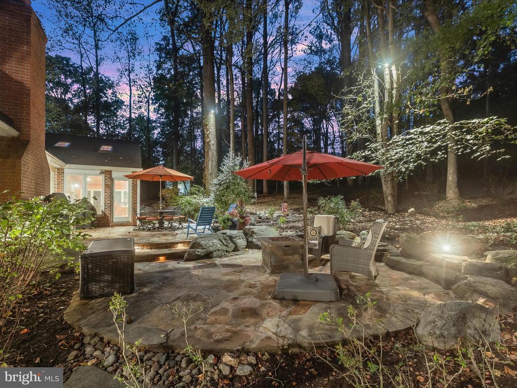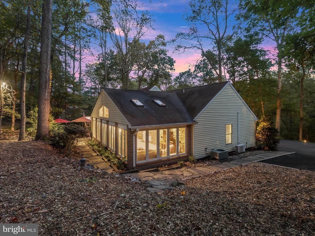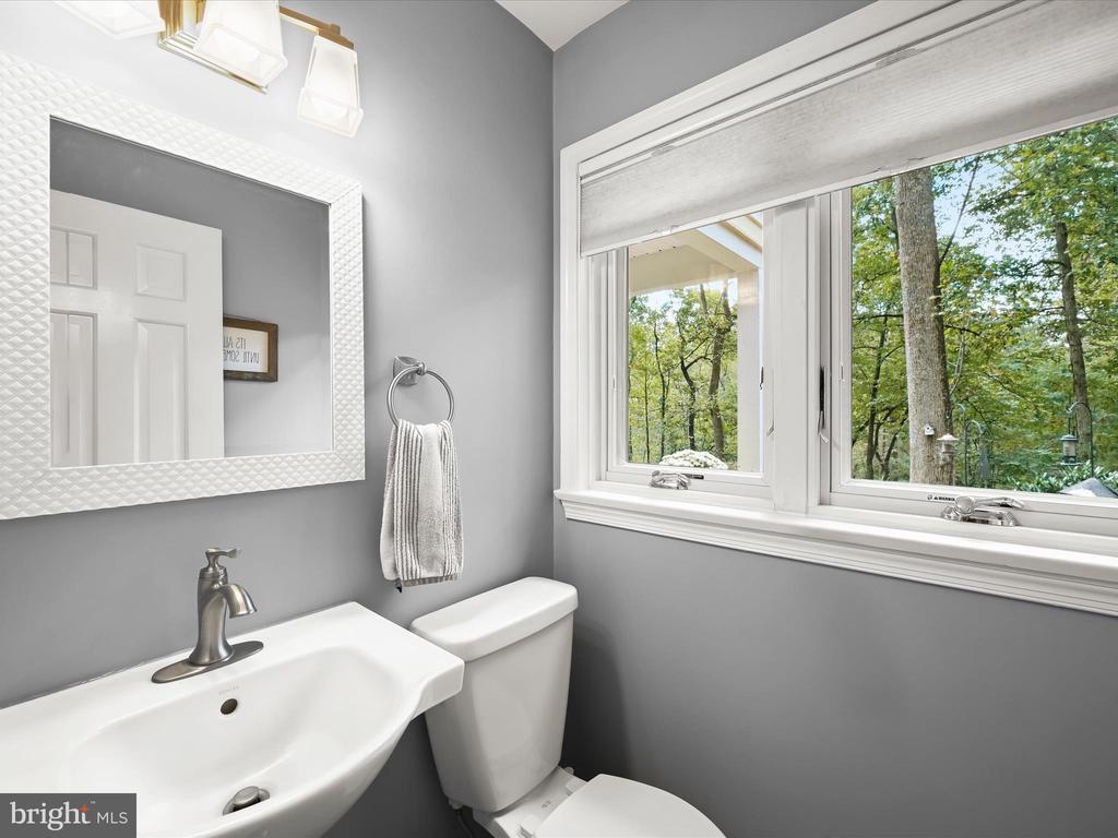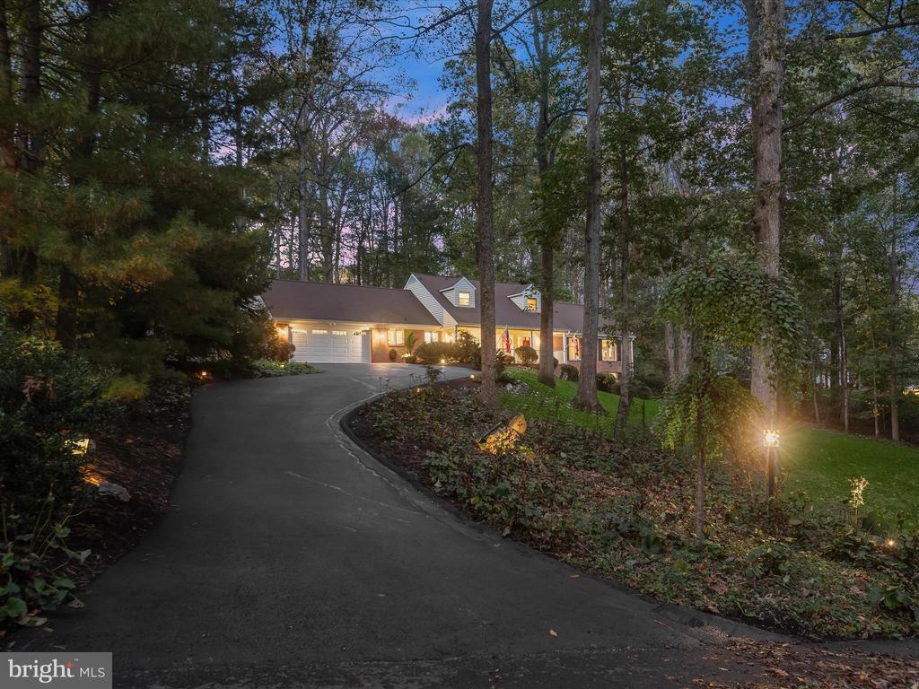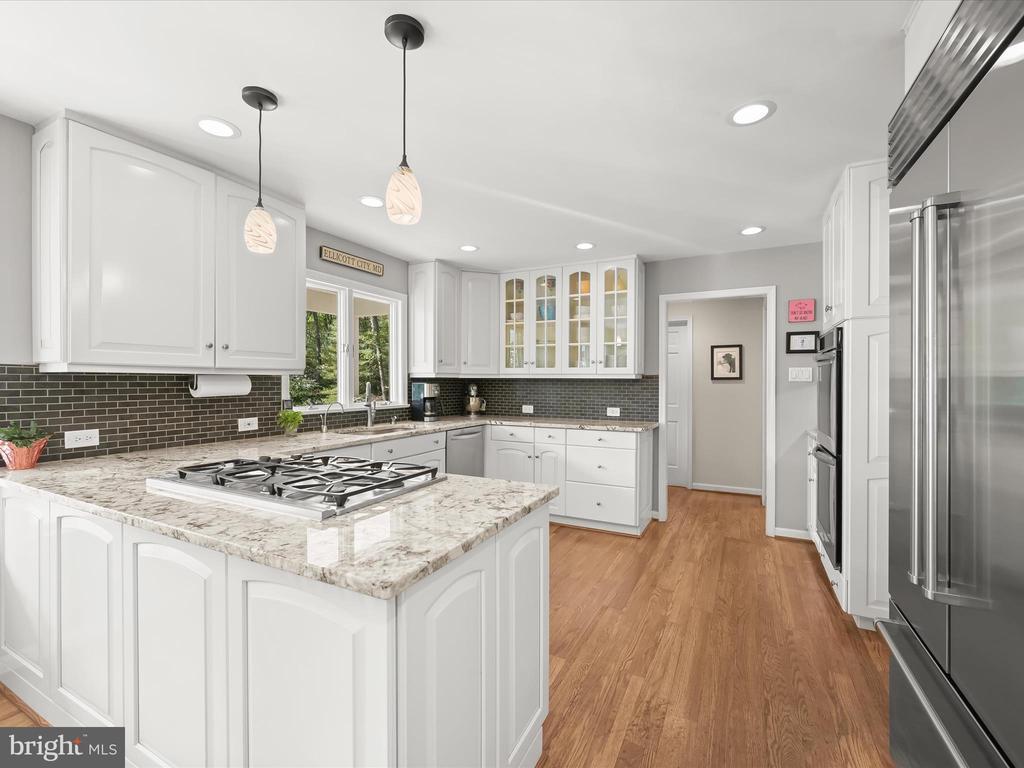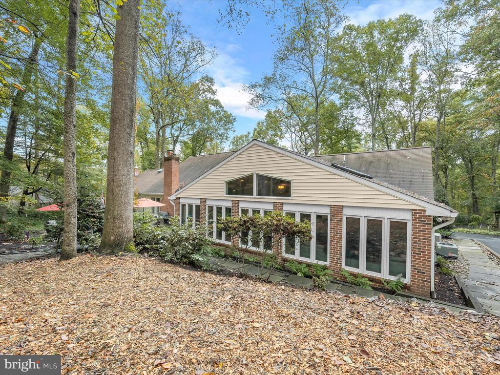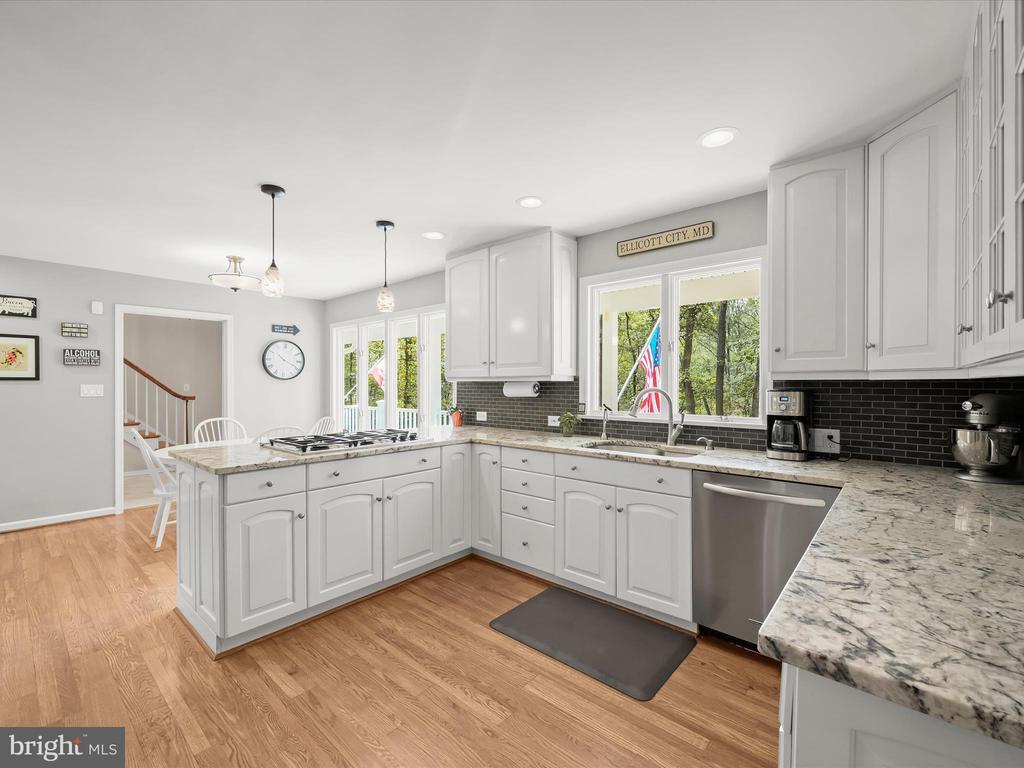 Introducing this extraordinary one-of-a-kind home tucked away in the sought-after Woodmark neighborhood in Ellicott City, offering a peaceful retreat on nearly an acre surrounded by mature trees. Featuring three bedrooms with four and a half bathrooms, this home has been thoughtfully updated inside and out, with meticulous attention to detail and timeless design. Beautifully manicured landscaping and a charming covered front porch create a warm welcome as you arrive. Inside, a soft color palette, sun-filled windows, and rich hardwood floors establish an inviting ambiance. Prepare your favorite meals in the gourmet eat-in kitchen that boasts granite countertops, a tile backsplash, lighted cabinetry, and a breakfast nook with a built-in desk station. Stainless steel appliances include a five-burner gas cooktop with telescopic downdraft, double wall ovens, and a Sub-Zero refrigerator replaced in 2024. A cozy wood-burning fireplace with brick surround anchors the elegant living room, enhanced by wainscoting, crown molding, and built-in shelving. French doors from the formal dining room open to an expansive family room with a soaring wood-beamed cathedral ceiling, skylights, and a stunning stacked-stone feature wall. Floor-to-ceiling windows frame peaceful views of the lush surroundings, creating an inspiring space for gathering or unwinding. This side of the home also includes a half bathroom and a laundry room with more storage and garage access. The main level hosts the primary bedroom suite with dual closets and sliding doors to a deck with a relaxing hot tub. The luxurious ensuite bathroom showcases a frameless glass shower with a rainfall showerhead and built-in bench. A second bedroom and a second full bathroom with a tub shower complete the main level. Upstairs, the top level is a private third bedroom suite with a walk-in closet and a spacious walk-in shower in the bathroom. Downstairs, the finished walk-out lower level extends the living area with a large recreation room featuring a gas fireplace and a wet bar, ideal for entertaining. A home office provides a quiet workspace and could serve as a fourth bedroom with an adjacent full bathroom that has a walk-in shower. A versatile bonus room with a walk-in closet offers space for a gym, playroom, another office, or creative studio. Ample storage abounds, including an expansive utility room and separate storage room. Outdoor living shines with a Tennessee flagstone patio perfect for barbecues or starlit evenings. Other recent updates include a new HVAC system (2025) and water heater (2024). Additional features such as outdoor lighting, a storage shed, and a two-car garage ideal for auto enthusiasts, complete this home. Nestled across from 28 acres of conserved woodlands and a scenic neighborhood pond down the street, this tranquil setting offers both natural beauty and a true sense of retreat.