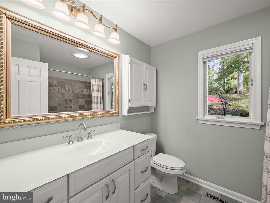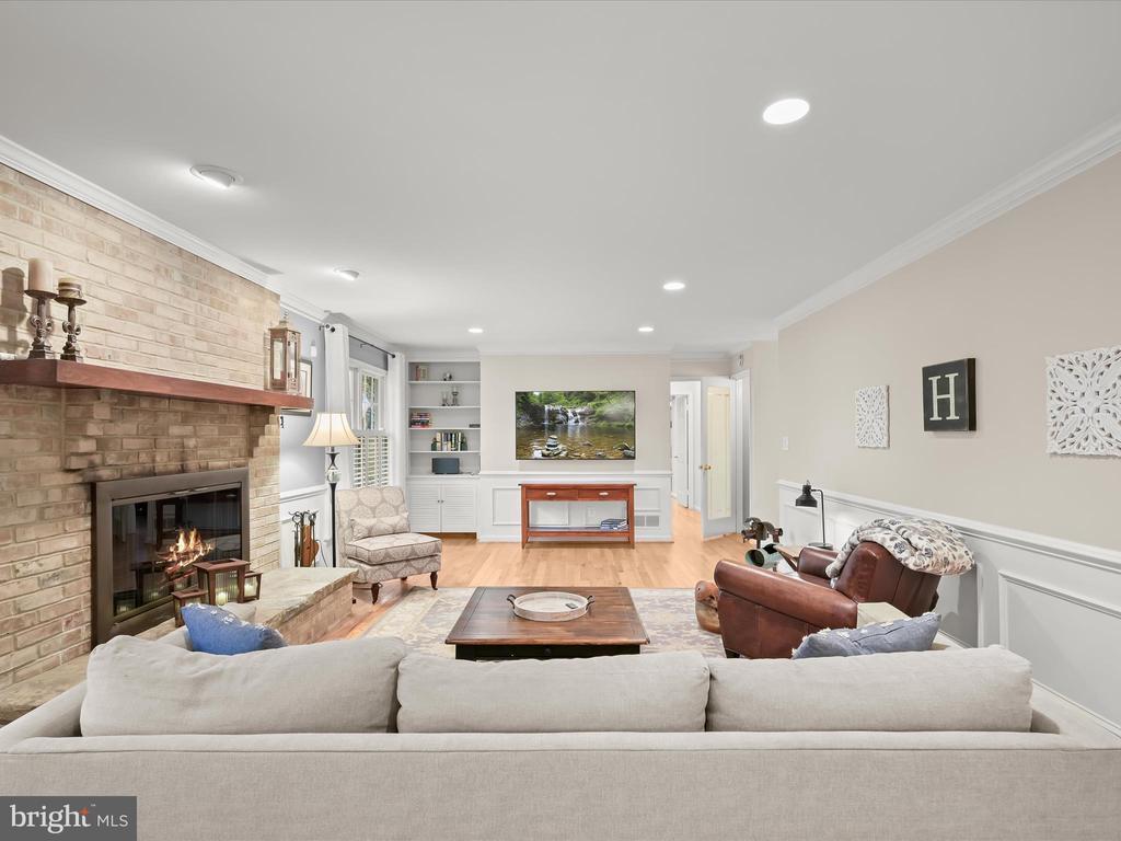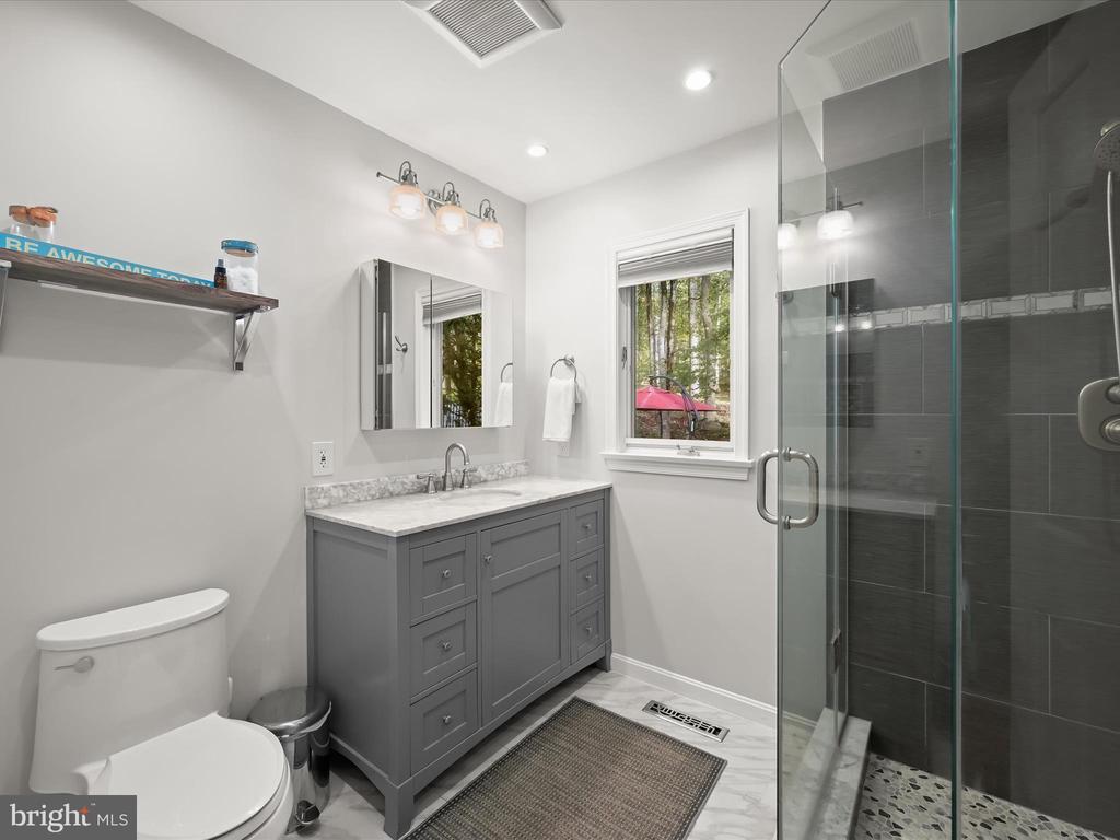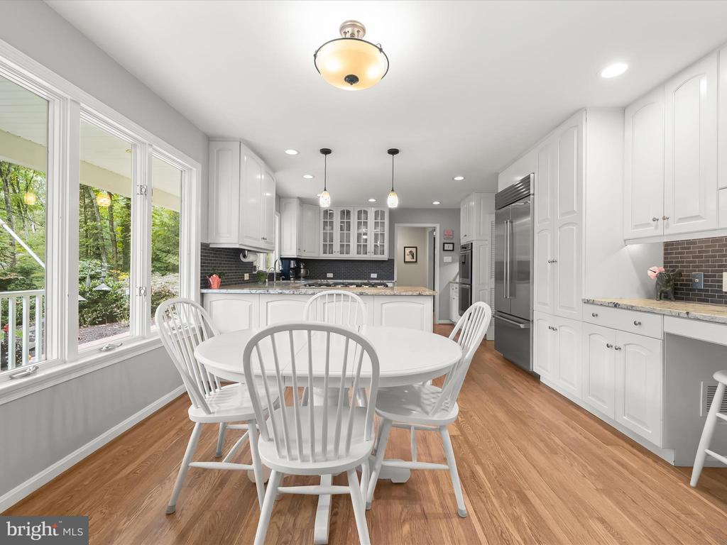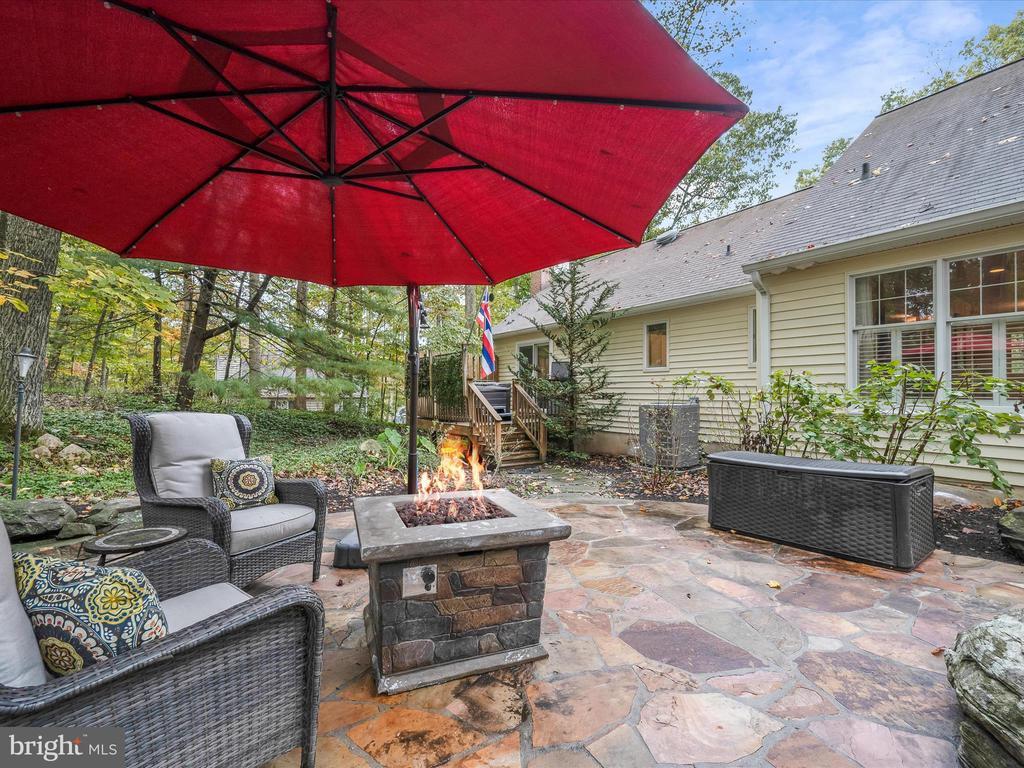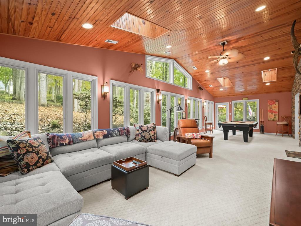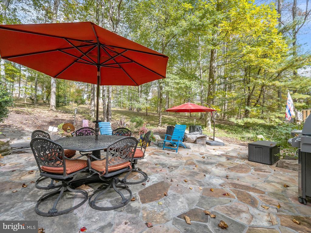 Introducing this extraordinary one-of-a-kind home tucked away in the sought-after Woodmark neighborhood in Ellicott City, offering a peaceful retreat on nearly an acre surrounded by mature trees. Featuring three bedrooms with four and a half bathrooms, this home has been thoughtfully updated inside and out, with meticulous attention to detail and timeless design. Beautifully manicured landscaping and a charming covered front porch create a warm welcome as you arrive. Inside, a soft color palette, sun-filled windows, and rich hardwood floors establish an inviting ambiance. Prepare your favorite meals in the gourmet eat-in kitchen that boasts granite countertops, a tile backsplash, lighted cabinetry, and a breakfast nook with a built-in desk station. Stainless steel appliances include a five-burner gas cooktop with telescopic downdraft, double wall ovens, and a Sub-Zero refrigerator replaced in 2024. A cozy wood-burning fireplace with brick surround anchors the elegant living room, enhanced by wainscoting, crown molding, and built-in shelving. French doors from the formal dining room open to an expansive family room with a soaring wood-beamed cathedral ceiling, skylights, and a stunning stacked-stone feature wall. Floor-to-ceiling windows frame peaceful views of the lush surroundings, creating an inspiring space for gathering or unwinding. This side of the home also includes a half bathroom and a laundry room with more storage and garage access. The main level hosts the primary bedroom suite with dual closets and sliding doors to a deck with a relaxing hot tub. The luxurious ensuite bathroom showcases a frameless glass shower with a rainfall showerhead and built-in bench. A second bedroom and a second full bathroom with a tub shower complete the main level. Upstairs, the top level is a private third bedroom suite with a walk-in closet and a spacious walk-in shower in the bathroom. Downstairs, the finished walk-out lower level extends the living area with a large recreation room featuring a gas fireplace and a wet bar, ideal for entertaining. A home office provides a quiet workspace and could serve as a fourth bedroom with an adjacent full bathroom that has a walk-in shower. A versatile bonus room with a walk-in closet offers space for a gym, playroom, another office, or creative studio. Ample storage abounds, including an expansive utility room and separate storage room. Outdoor living shines with a Tennessee flagstone patio perfect for barbecues or starlit evenings. Other recent updates include a new HVAC system (2025) and water heater (2024). Additional features such as outdoor lighting, a storage shed, and a two-car garage ideal for auto enthusiasts, complete this home. Nestled across from 28 acres of conserved woodlands and a scenic neighborhood pond down the street, this tranquil setting offers both natural beauty and a true sense of retreat.