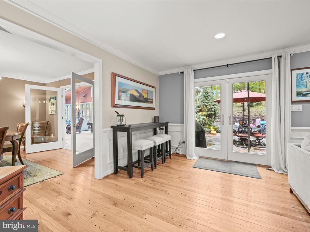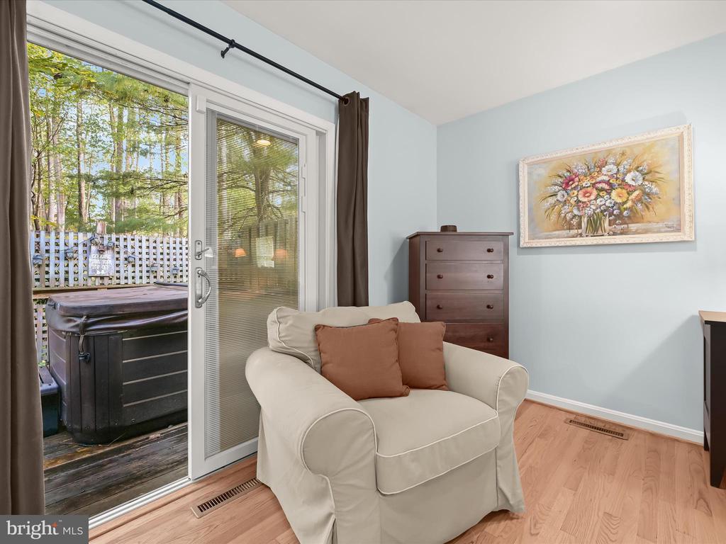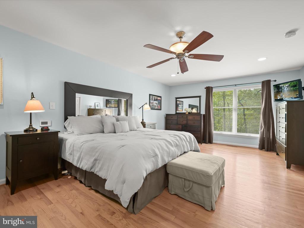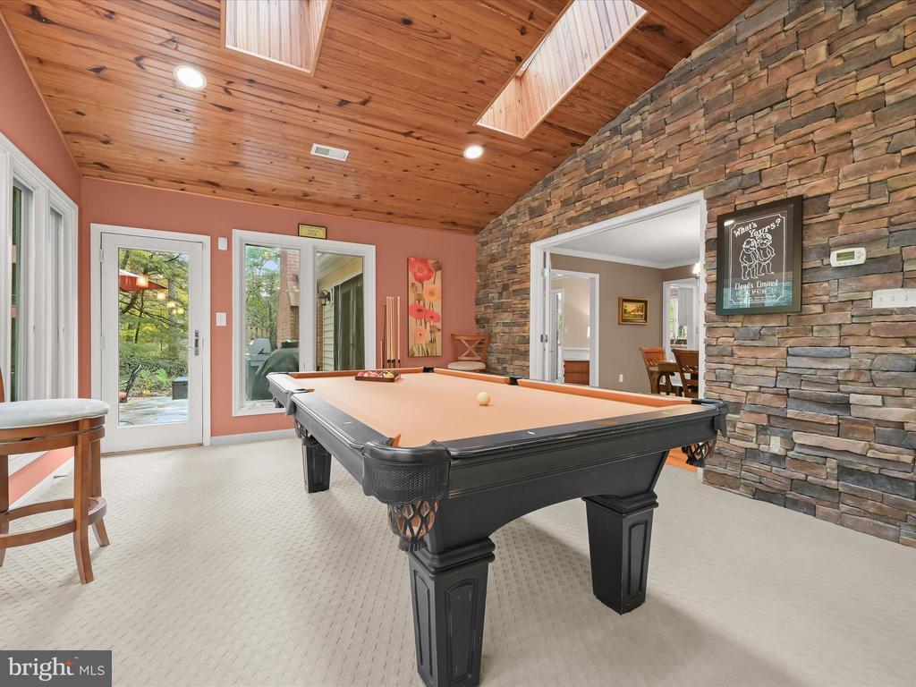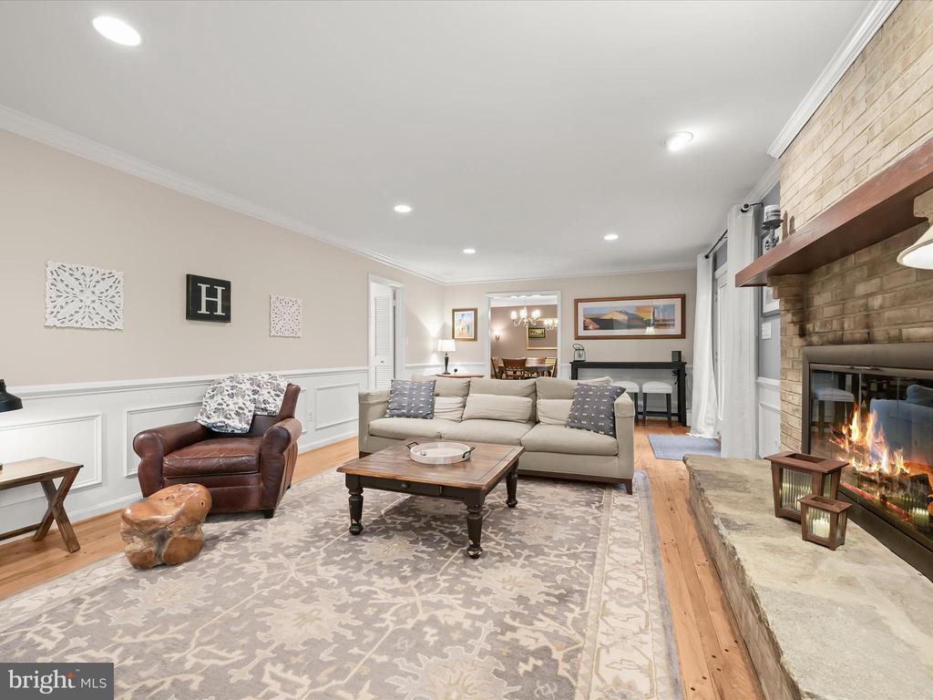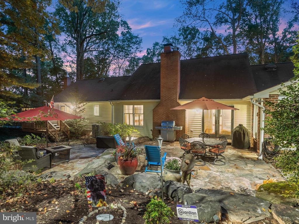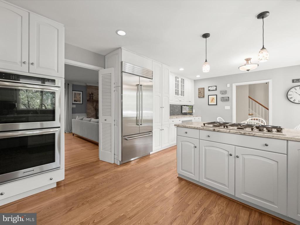 Introducing this extraordinary one-of-a-kind home tucked away in the sought-after Woodmark neighborhood in Ellicott City, offering a peaceful retreat on nearly an acre surrounded by mature trees. Featuring three bedrooms with four and a half bathrooms, this home has been thoughtfully updated inside and out, with meticulous attention to detail and timeless design. Beautifully manicured landscaping and a charming covered front porch create a warm welcome as you arrive. Inside, a soft color palette, sun-filled windows, and rich hardwood floors establish an inviting ambiance. Prepare your favorite meals in the gourmet eat-in kitchen that boasts granite countertops, a tile backsplash, lighted cabinetry, and a breakfast nook with a built-in desk station. Stainless steel appliances include a five-burner gas cooktop with telescopic downdraft, double wall ovens, and a Sub-Zero refrigerator replaced in 2024. A cozy wood-burning fireplace with brick surround anchors the elegant living room, enhanced by wainscoting, crown molding, and built-in shelving. French doors from the formal dining room open to an expansive family room with a soaring wood-beamed cathedral ceiling, skylights, and a stunning stacked-stone feature wall. Floor-to-ceiling windows frame peaceful views of the lush surroundings, creating an inspiring space for gathering or unwinding. This side of the home also includes a half bathroom and a laundry room with more storage and garage access. The main level hosts the primary bedroom suite with dual closets and sliding doors to a deck with a relaxing hot tub. The luxurious ensuite bathroom showcases a frameless glass shower with a rainfall showerhead and built-in bench. A second bedroom and a second full bathroom with a tub shower complete the main level. Upstairs, the top level is a private third bedroom suite with a walk-in closet and a spacious walk-in shower in the bathroom. Downstairs, the finished walk-out lower level extends the living area with a large recreation room featuring a gas fireplace and a wet bar, ideal for entertaining. A home office provides a quiet workspace and could serve as a fourth bedroom with an adjacent full bathroom that has a walk-in shower. A versatile bonus room with a walk-in closet offers space for a gym, playroom, another office, or creative studio. Ample storage abounds, including an expansive utility room and separate storage room. Outdoor living shines with a Tennessee flagstone patio perfect for barbecues or starlit evenings. Other recent updates include a new HVAC system (2025) and water heater (2024). Additional features such as outdoor lighting, a storage shed, and a two-car garage ideal for auto enthusiasts, complete this home. Nestled across from 28 acres of conserved woodlands and a scenic neighborhood pond down the street, this tranquil setting offers both natural beauty and a true sense of retreat.