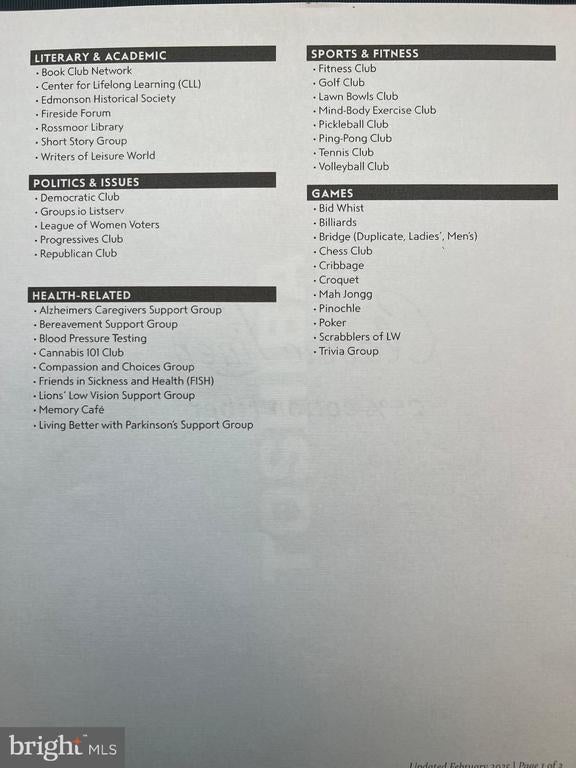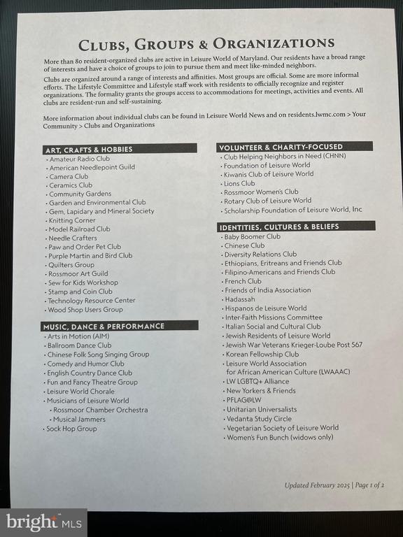 Beautiful, 2 Bedroom 2 Full Bath 2nd Floor, Garden Style with Balcony with Many Improvements! Updated Bosch Stainless Steel Kitchen with ice maker, Italian Ceramic Tile Floors in Kitchen and Bath, New Luxury Vinyl Plank in Living Room/Dining Room and Newly Carpeted Bedrooms. In-unit full size Washer/Dryer. Condo Fee Includes: Water, Electric and Internet 1 assigned parking space and plenty of additional parking for residents and guests Storage locker on lobby level Condo Association is well organized and well funded: Our building roof was just replaced with 50 year warranty , and elevators are being modernized.--both of these upgrades with no supplementary monetary assessment to residents Investors! Excellent Rental Property Option -These units command strong rental rates and are in high demand. Investor does NOT have to meet resident-senior living age restriction. Located in in sought after Leisure World of Maryland Community. featuring Golf Course, Club Houses, Indoor/Outdoor Pools, Tennis, Fitness Center, Walking Trails, Numerous Clubs and Activities, On site restaurants and more! Every "permanent" resident must meet the requirement for being at least fifty (50) years of age and that at least one of such residents must be at least fifty-five (55) years of age. Non-resident owners are permitted outside of this age range.